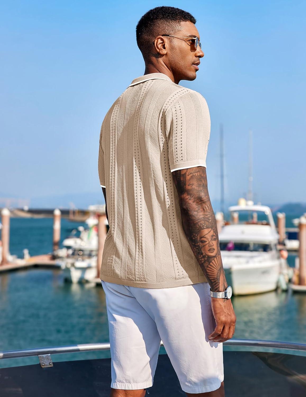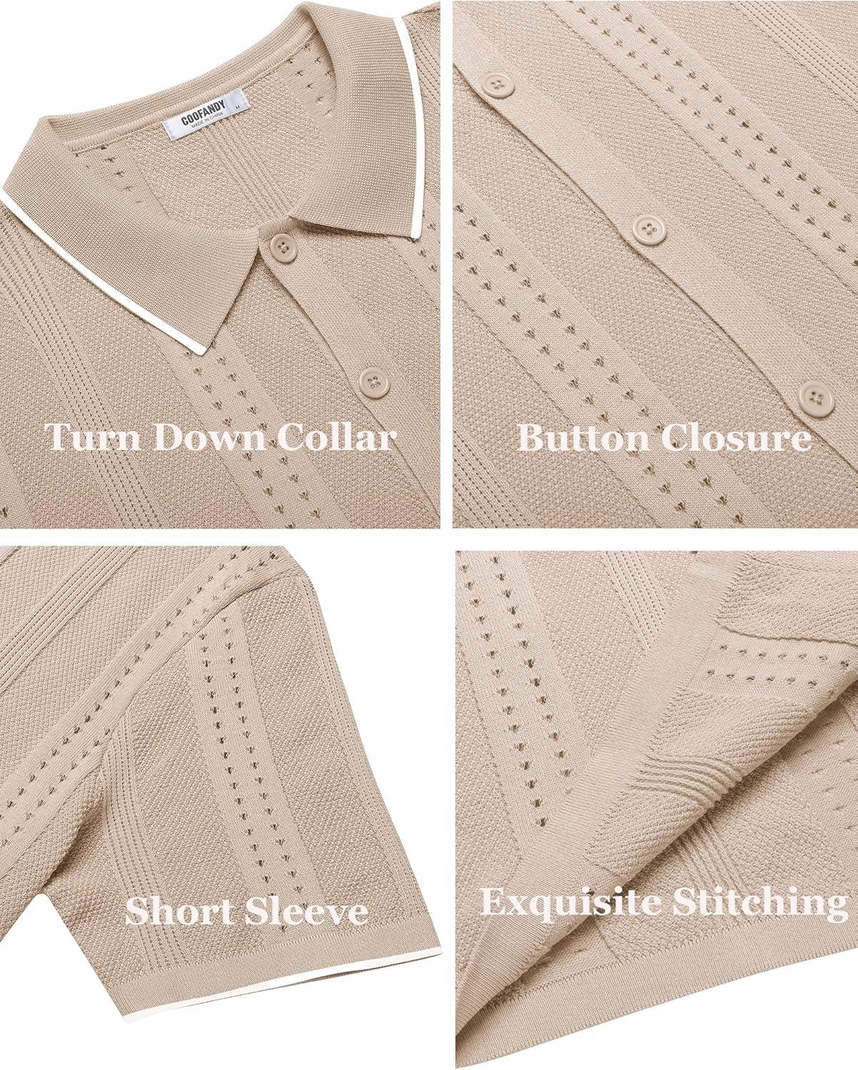 COOFANDY Men's Knit Shirts Short Sleeve Button Down Polo Shirt Fashion Casual Summer Beach Shirts(Classic Apricot & White)