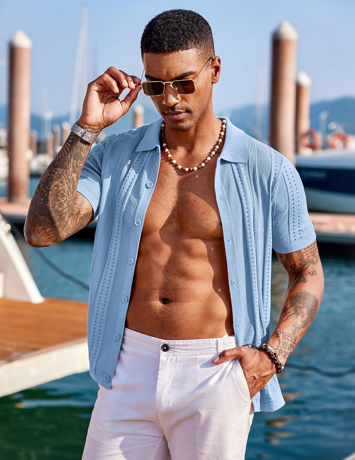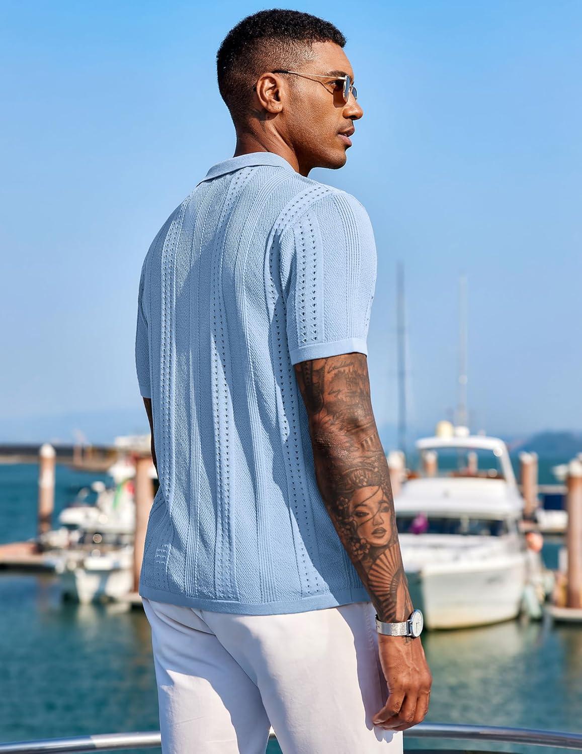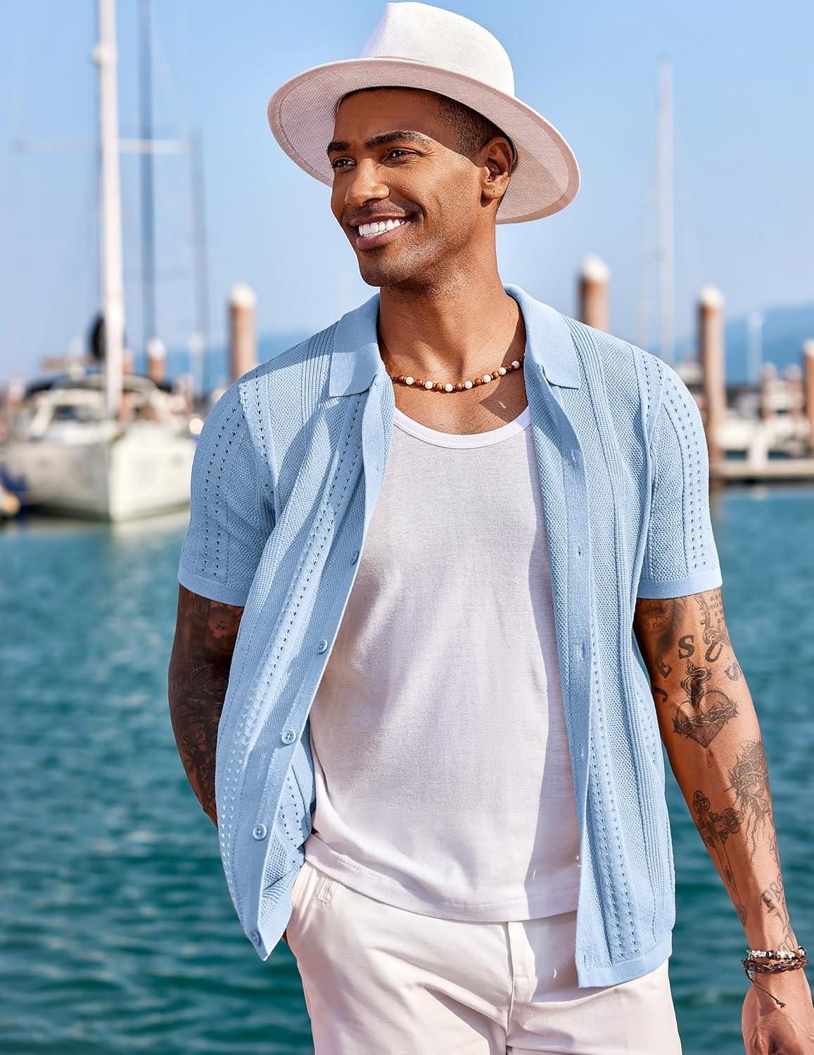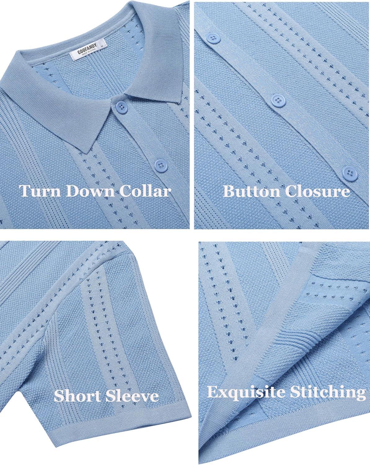 COOFANDY Men's Knit Shirts Short Sleeve Button Down Polo Shirt Fashion Casual Summer Beach Shirts(Light Blue)