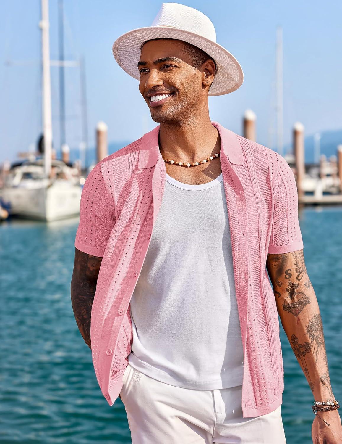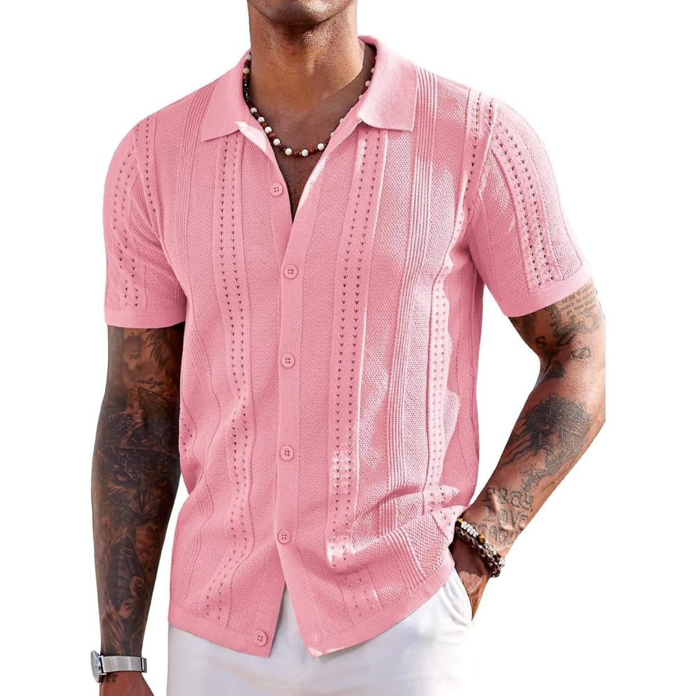 COOFANDY Men's Knit Shirts Short Sleeve Button Down Polo Shirt Fashion Casual Summer Beach Shirts(Light Pink)