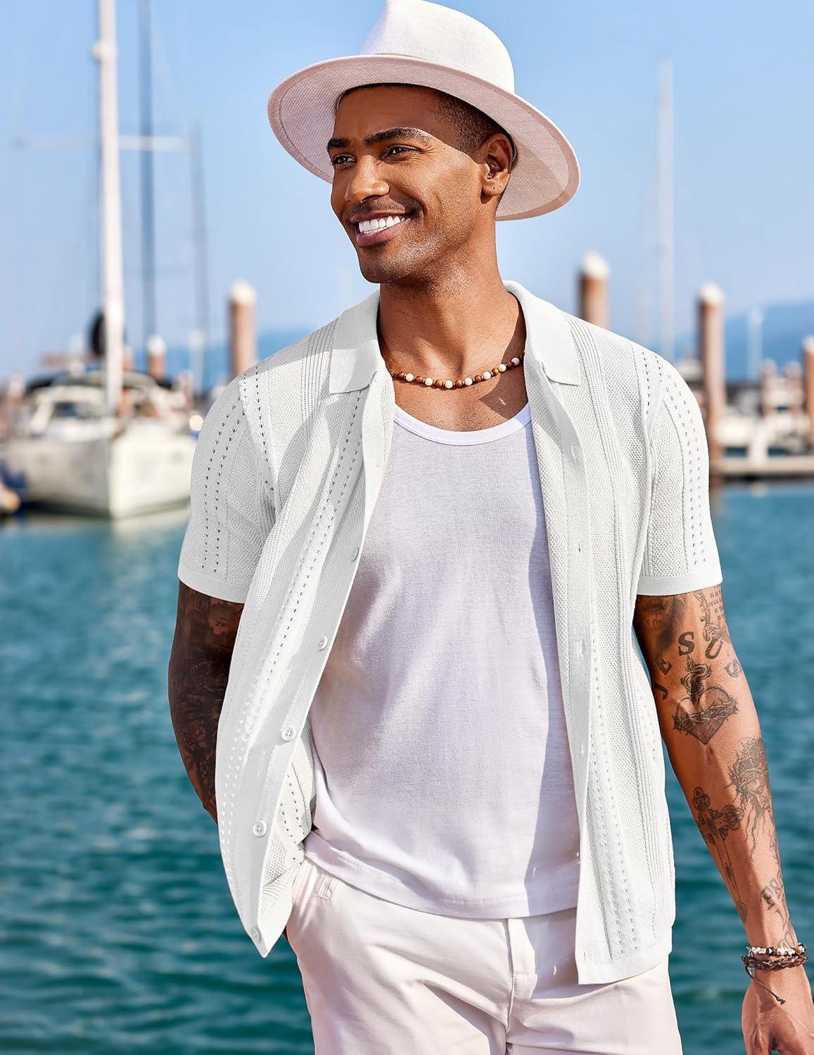 COOFANDY Men's Knit Shirts Short Sleeve Button Down Polo Shirt Fashion Casual Summer Beach Shirts(White)