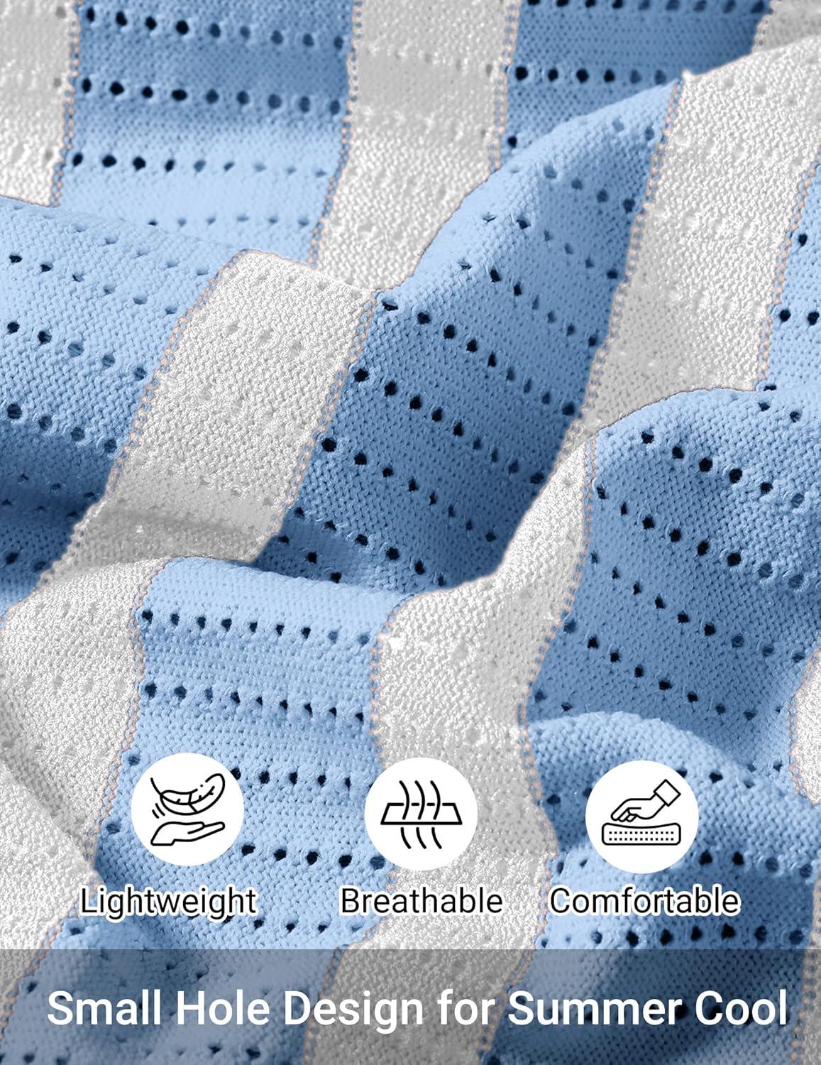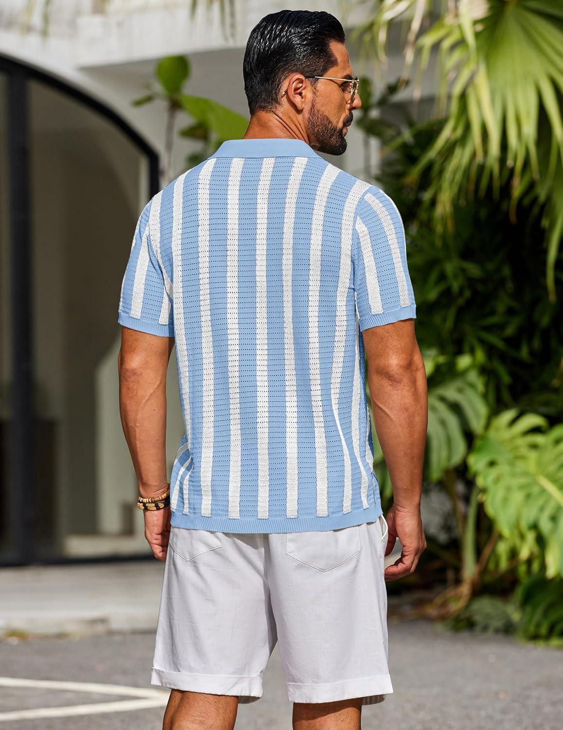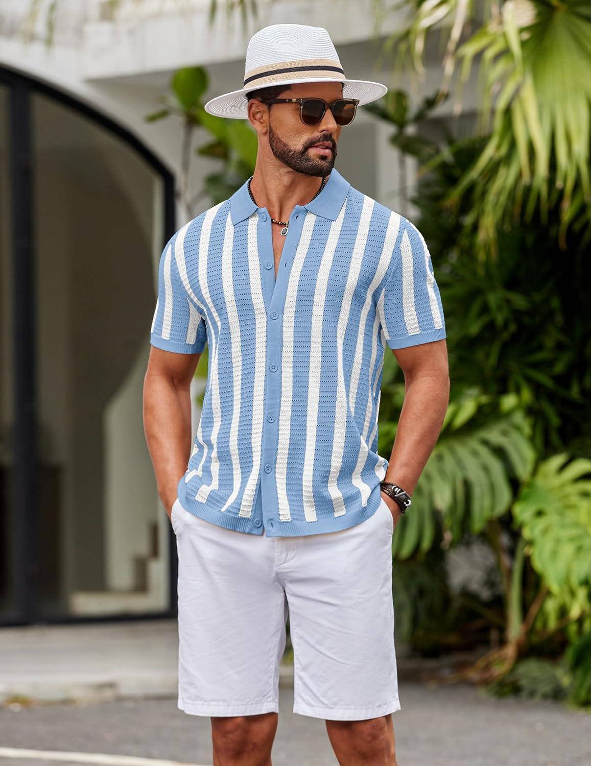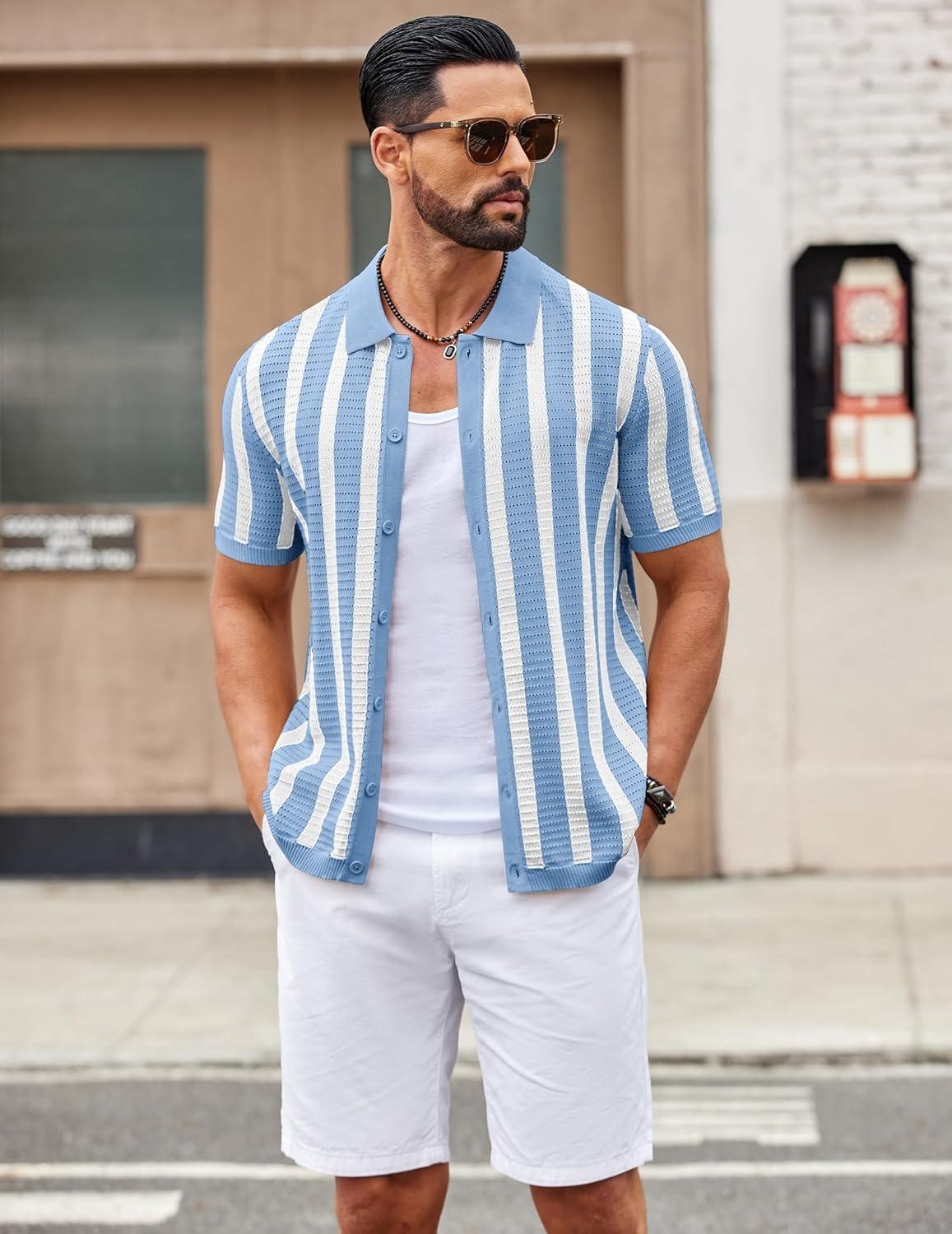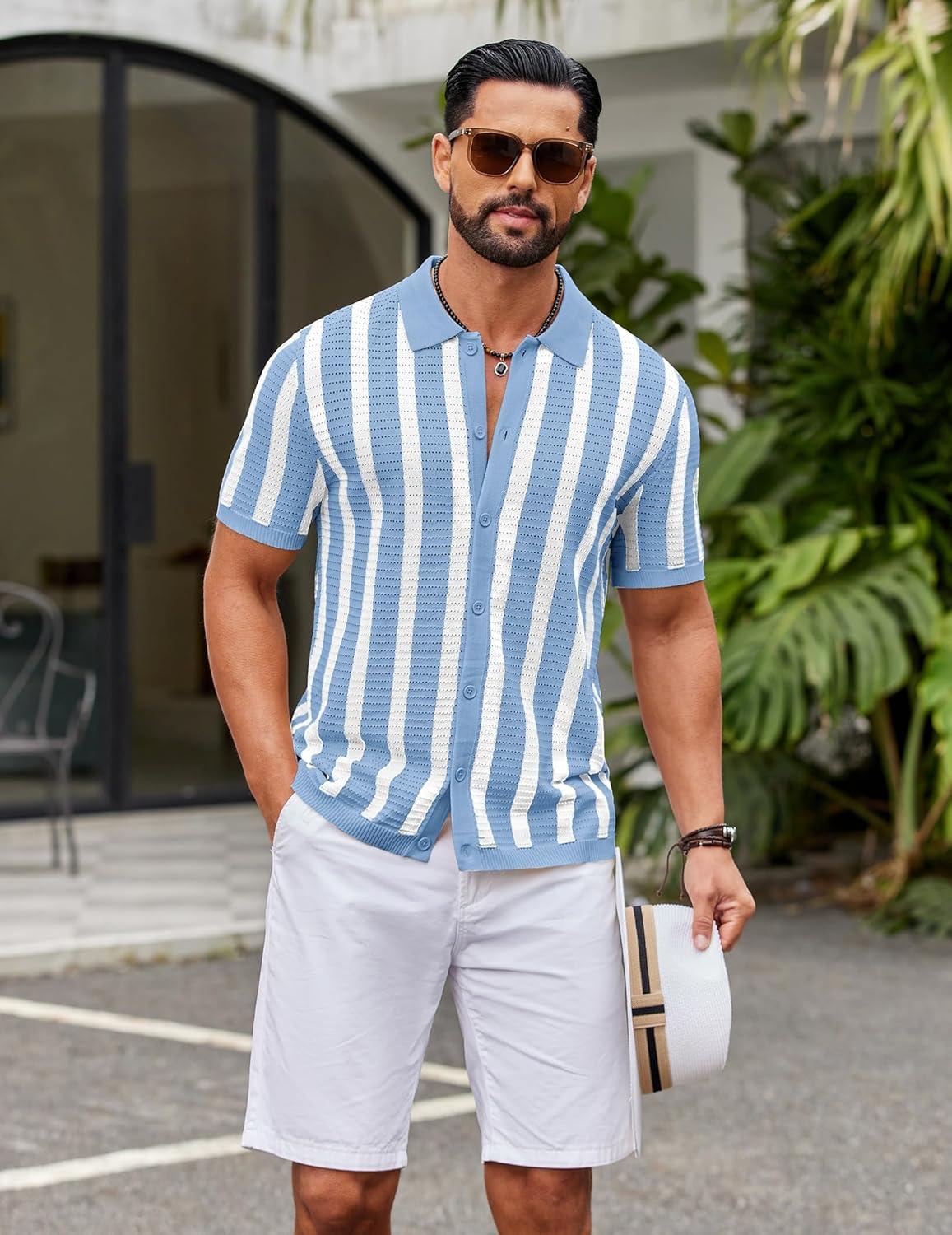 COOFANDY Men's Knit Shirts Short Sleeve Button Down Polo Shirt Striped Casual Summer Beach Shirts(Light Blue & White)