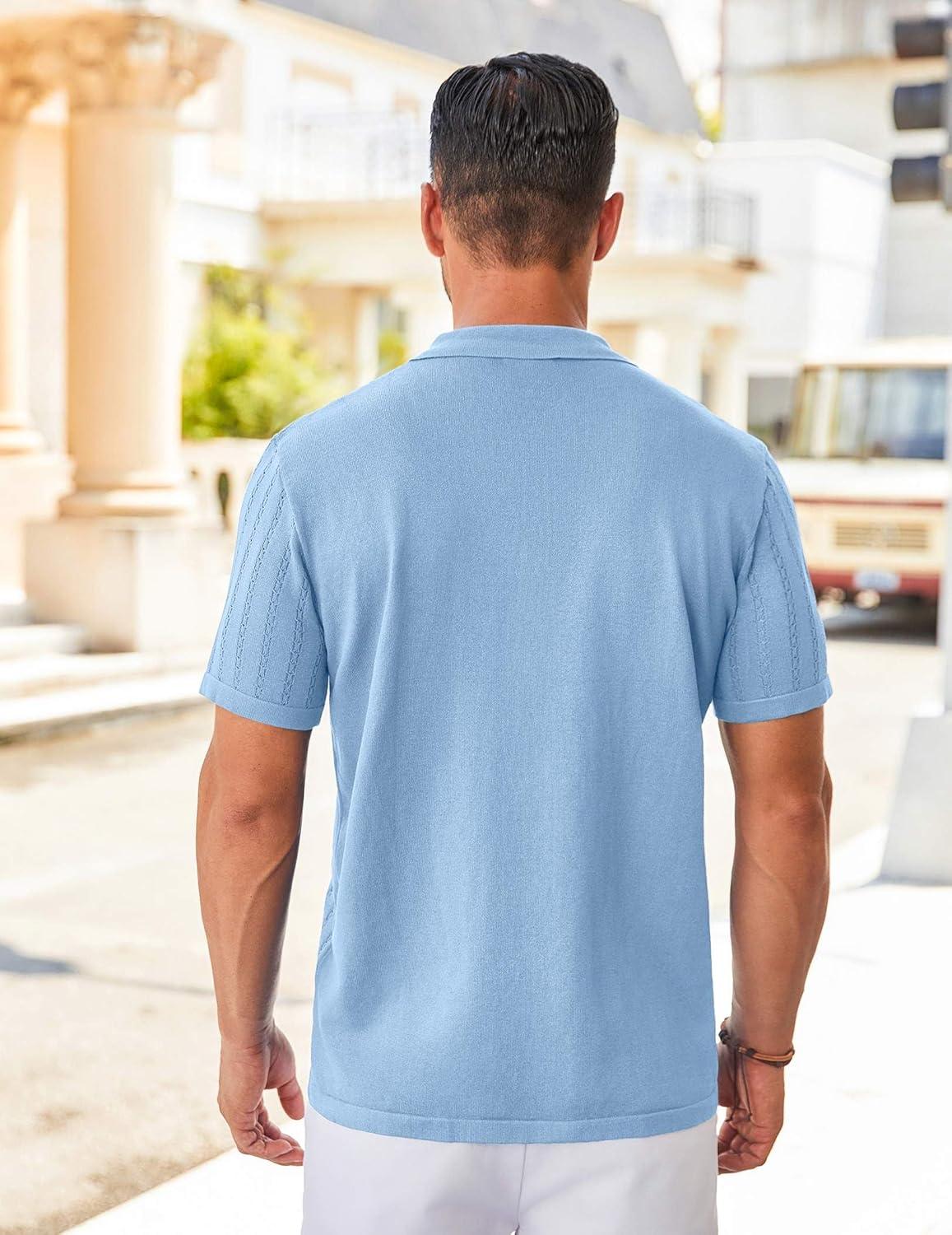 COOFANDY Men's Knit Shirts Short Sleeve Button Down Polo Shirt Vintage Casual Summer Beach Shirts(Light Blue)