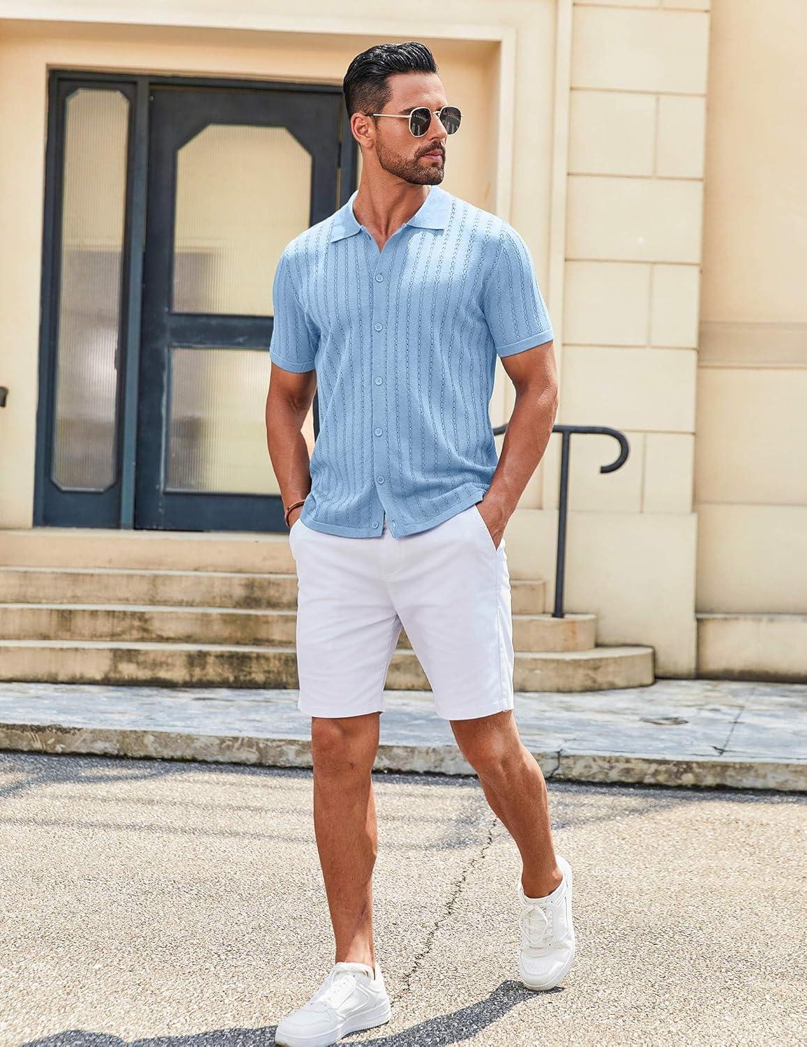 imageCOOFANDY Mens Knit Shirts Short Sleeve Button Down Polo Shirt Vintage Casual Summer Beach ShirtsLight Blue
