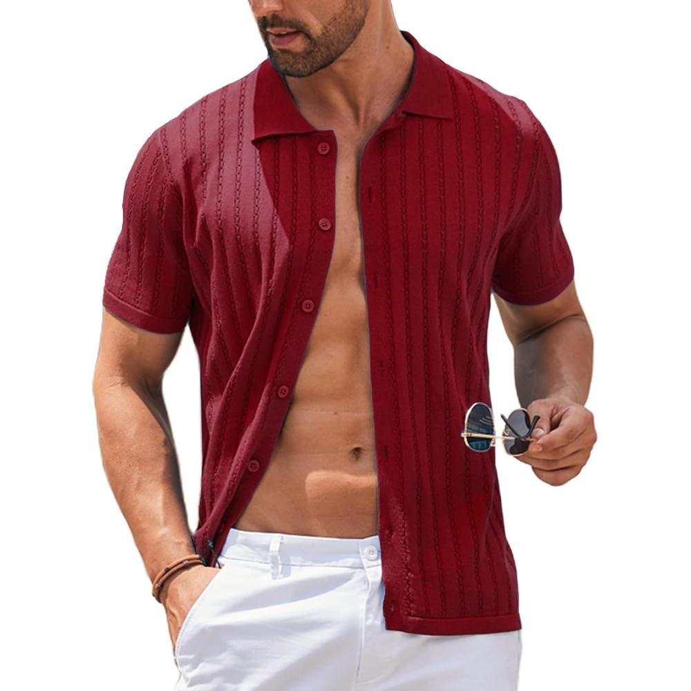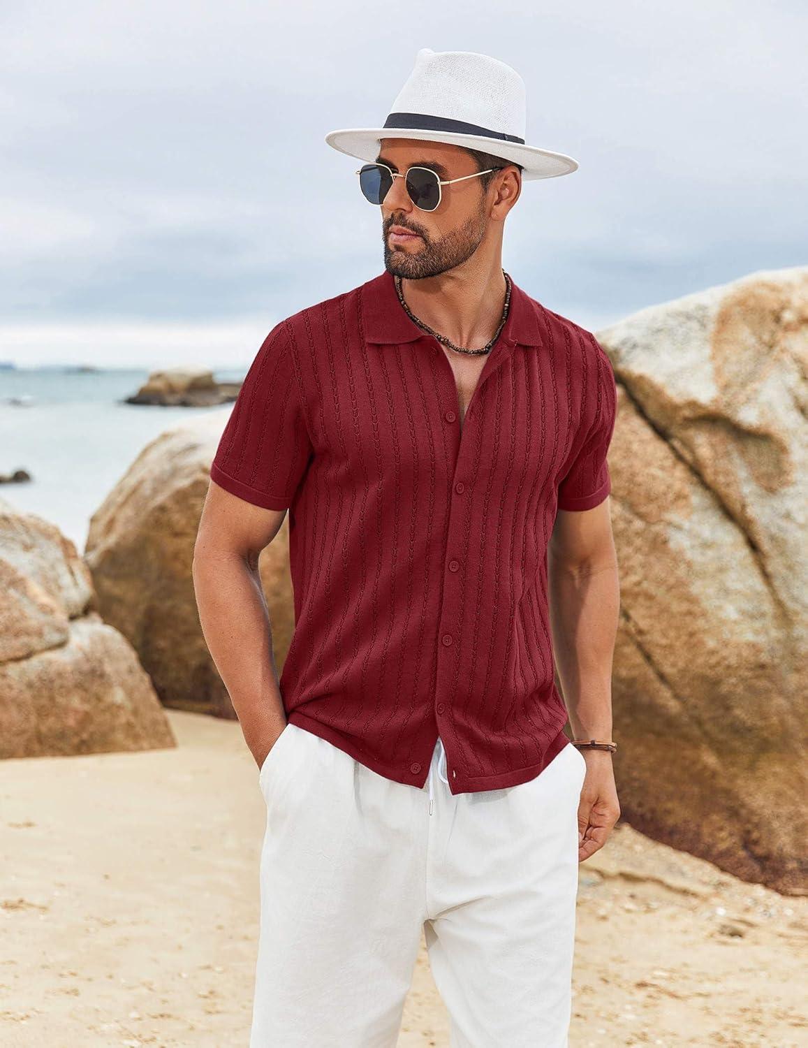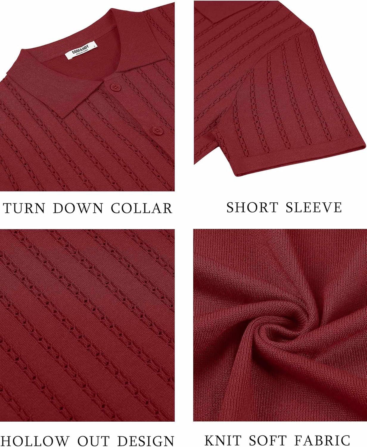 COOFANDY Men's Knit Shirts Short Sleeve Button Down Polo Shirt Vintage Casual Summer Beach Shirts(Wine Red)
