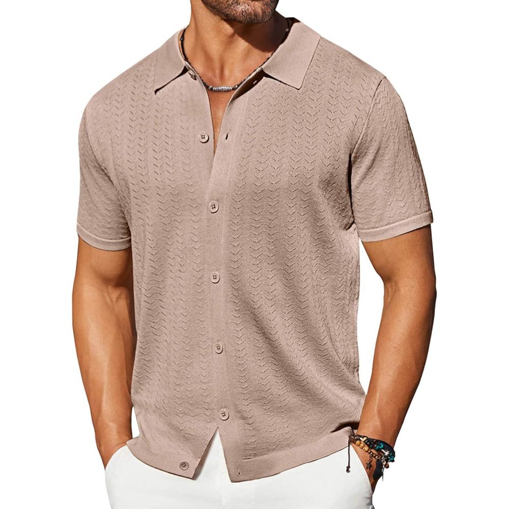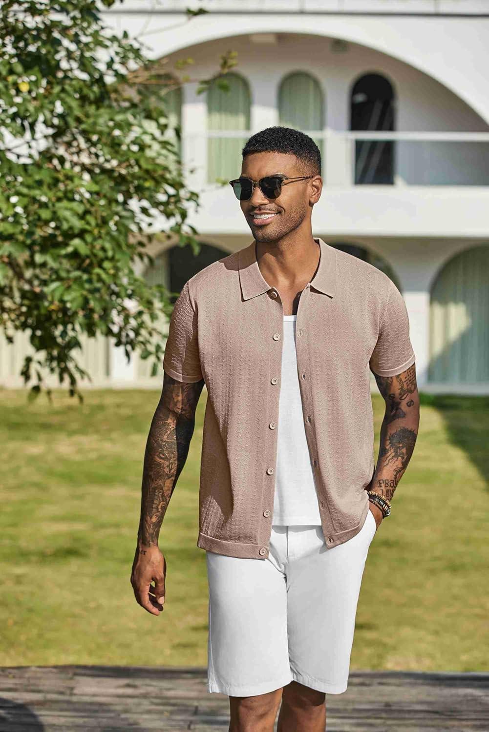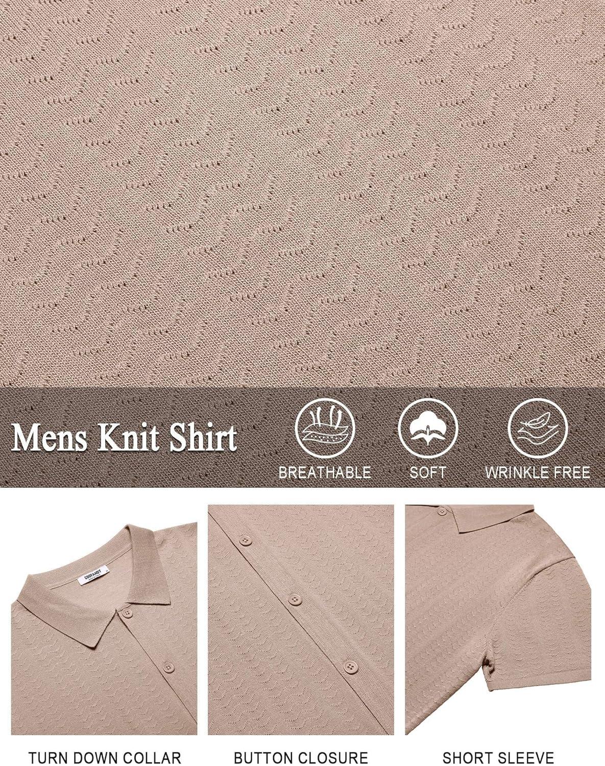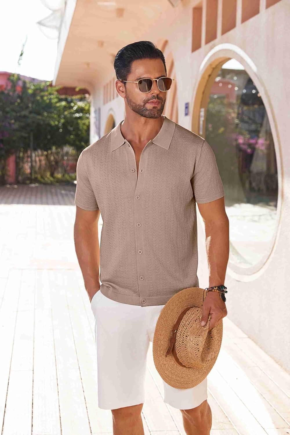 COOFANDY Men's Knit Shirts Short Sleeve Button Down Shirt Casual Summer Beach Shirt(Khaki)