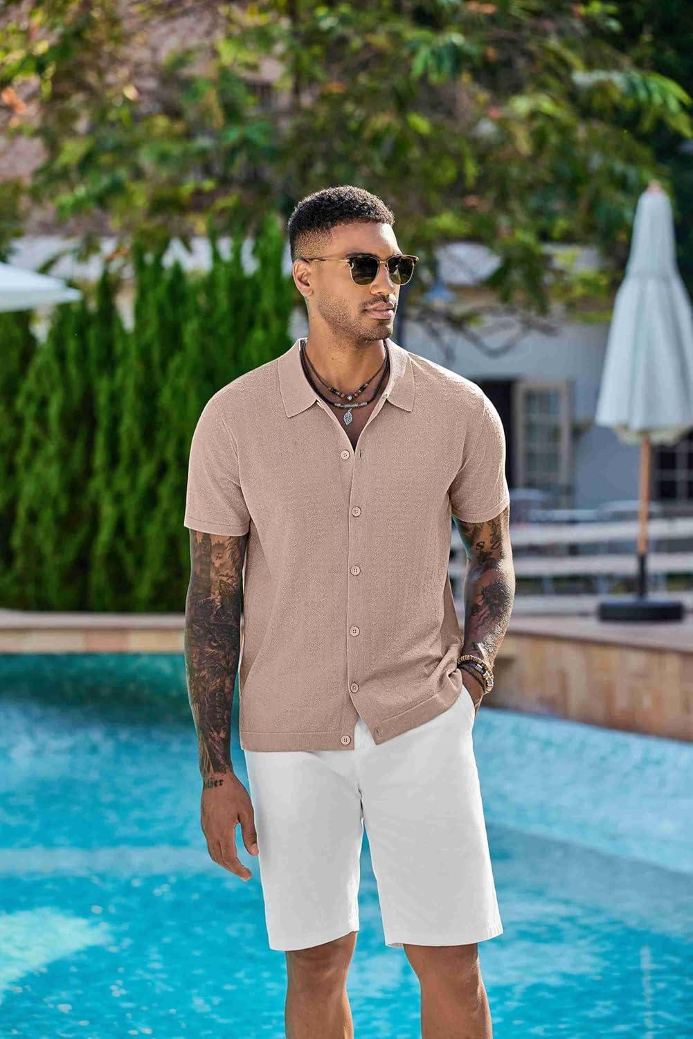 COOFANDY Men’s Knit Shirts Short Sleeve Button Down Shirt Casual Summer Beach Shirt(Light Khaki)