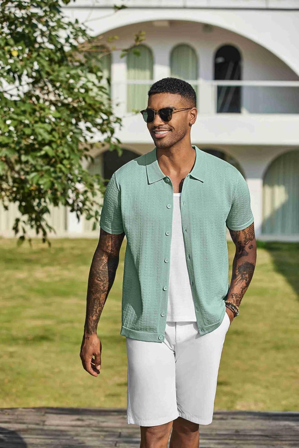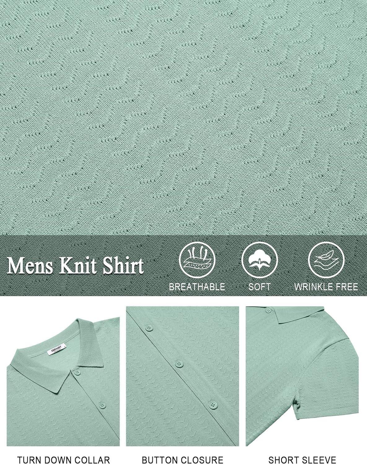 COOFANDY Men's Knit Shirts Short Sleeve Button Down Shirt Casual Summer Beach Shirt(Light Green)