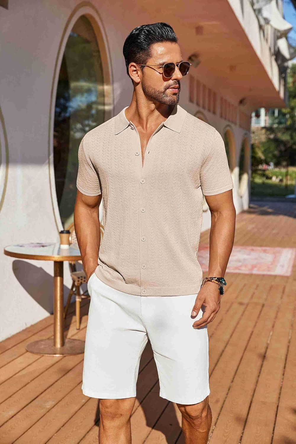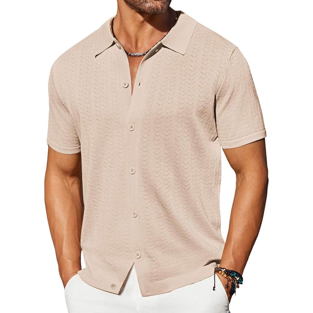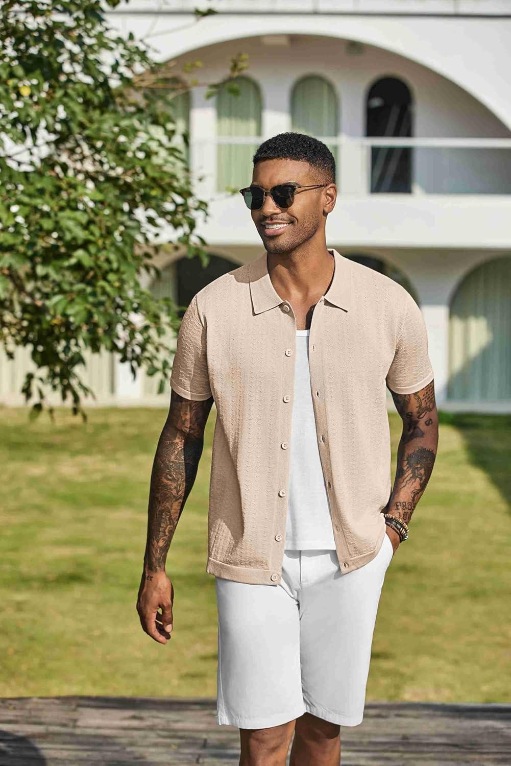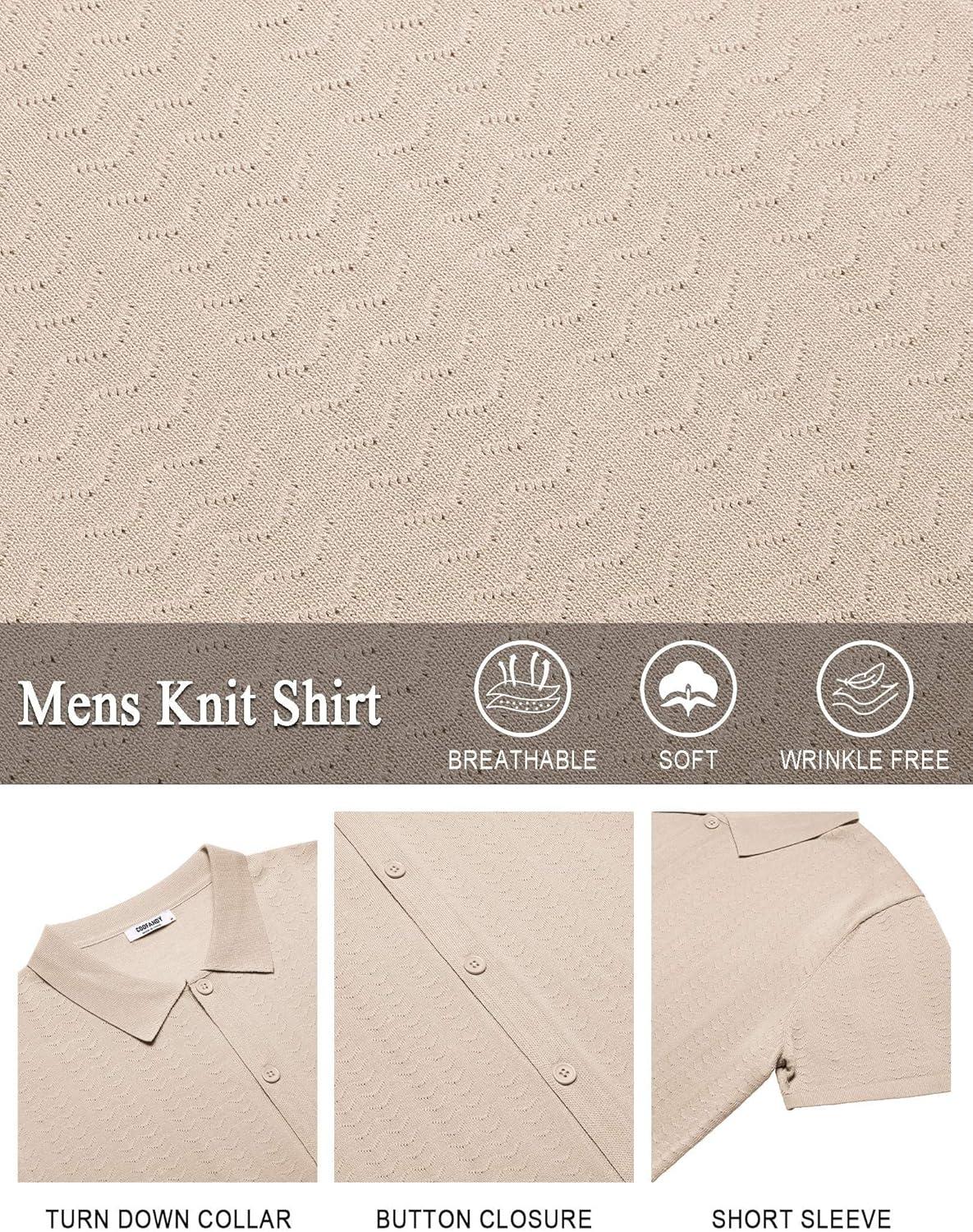COOFANDY Men's Knit Shirts Short Sleeve Button Down Shirt Casual Summer Beach Shirt(Light Khaki)