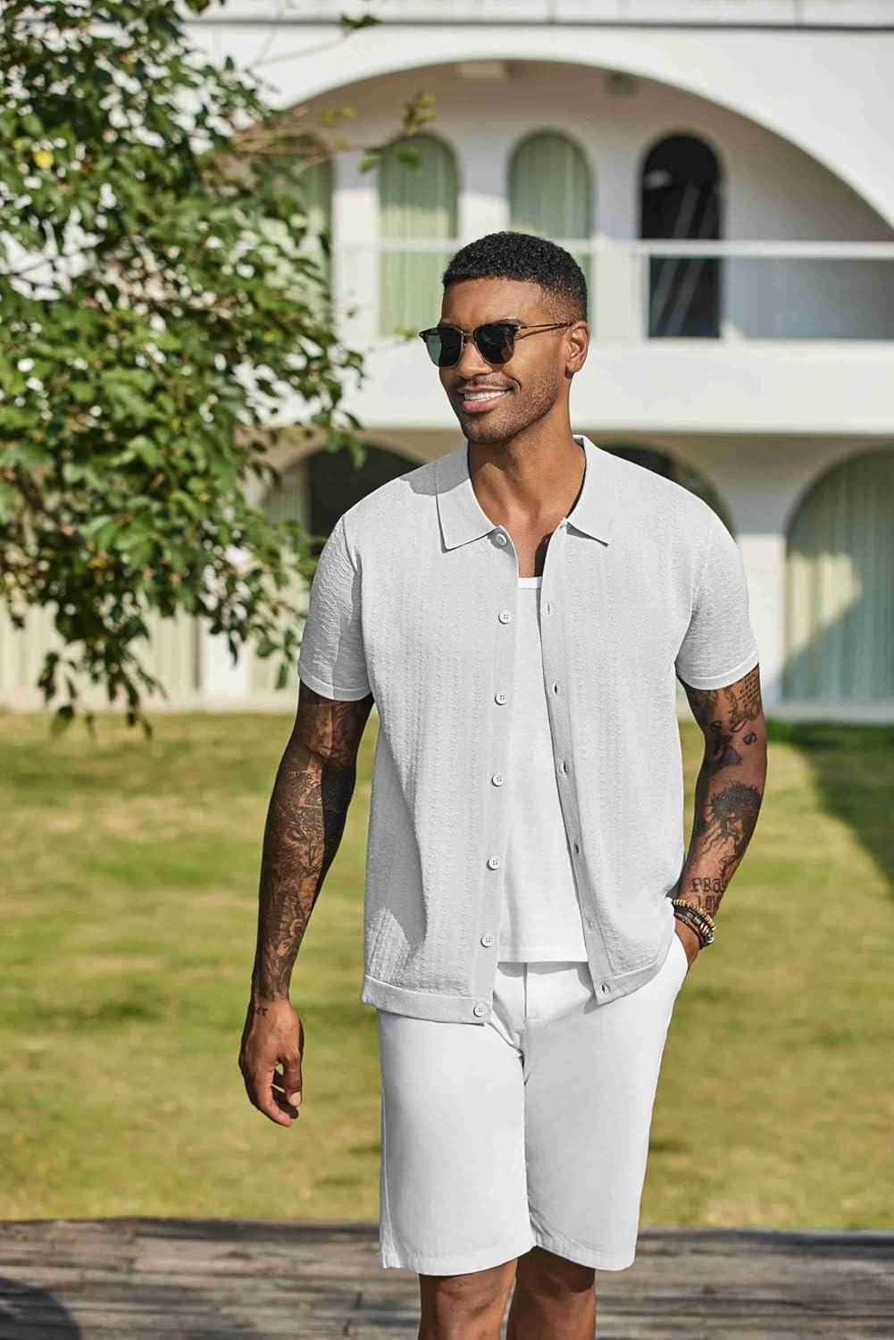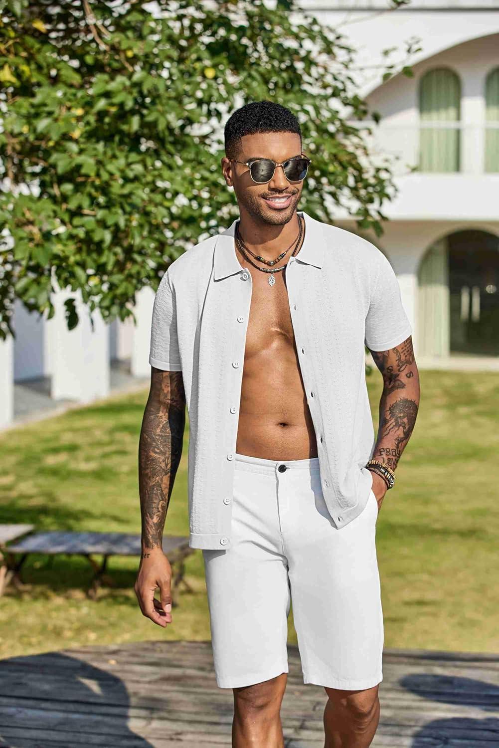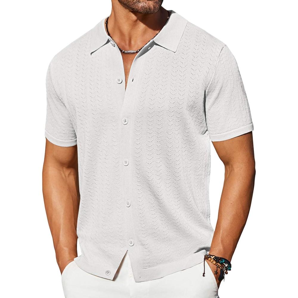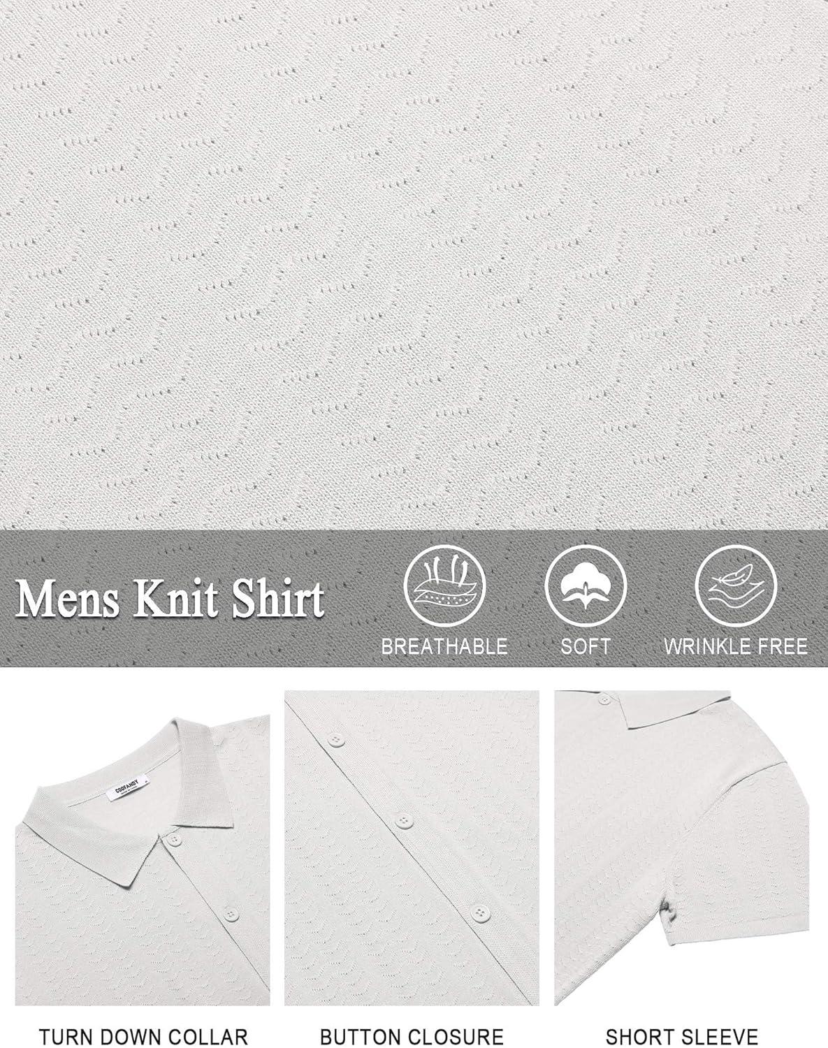 COOFANDY Men's Knit Shirts Short Sleeve Button Down Shirt Casual Summer Beach Shirt(White)