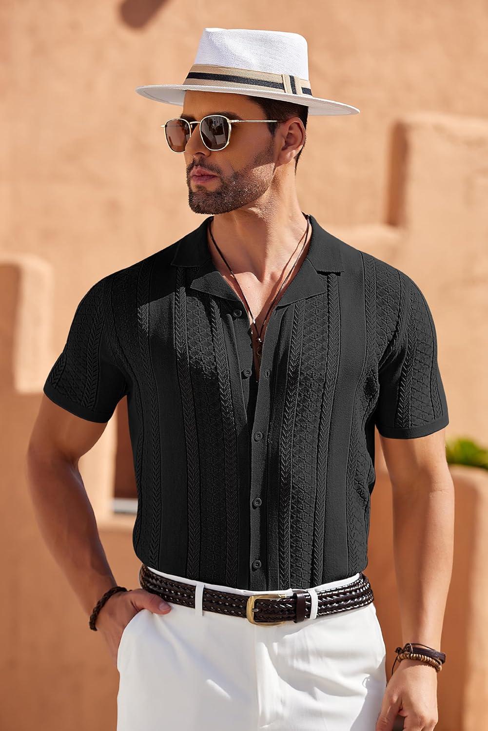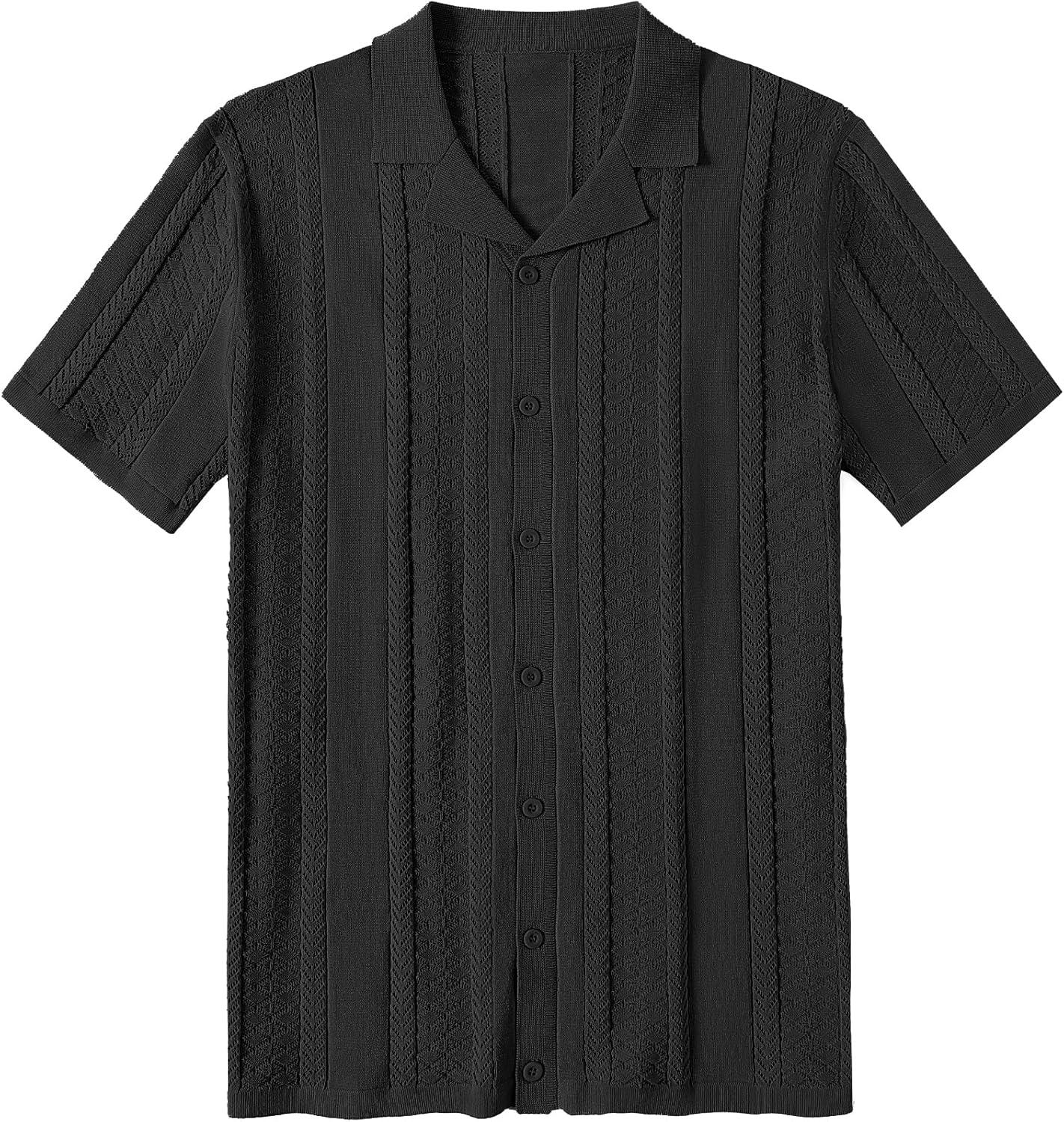 COOFANDY Men's Knit Shirts Vintage Short Sleeve Button Down Shirt Casual Summer Beach Shirt(Black)