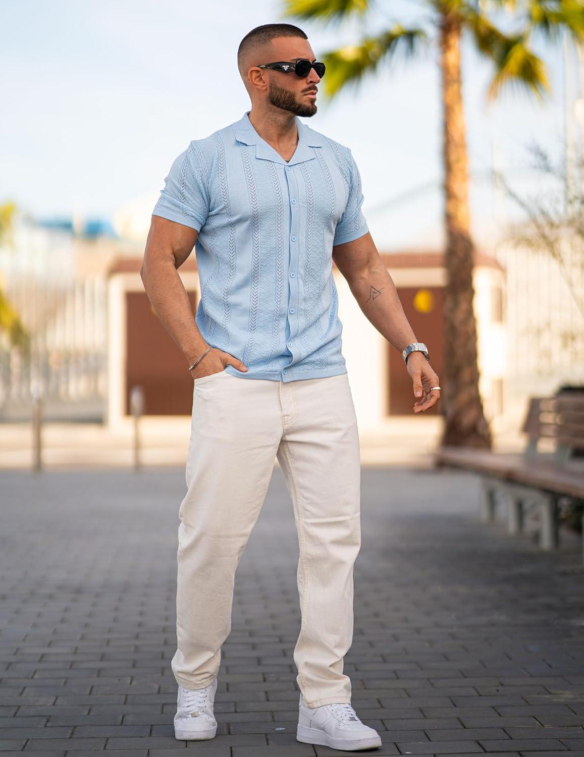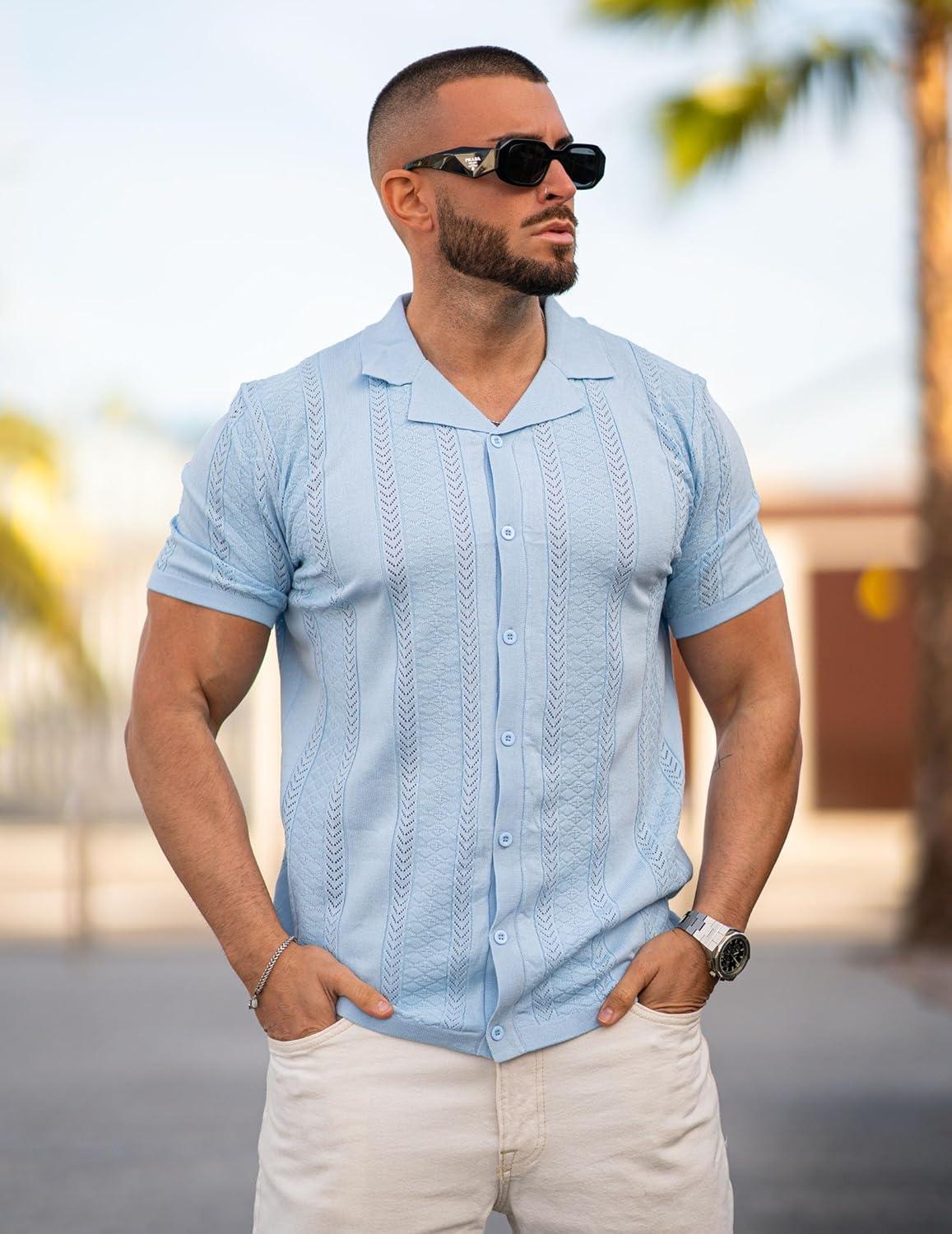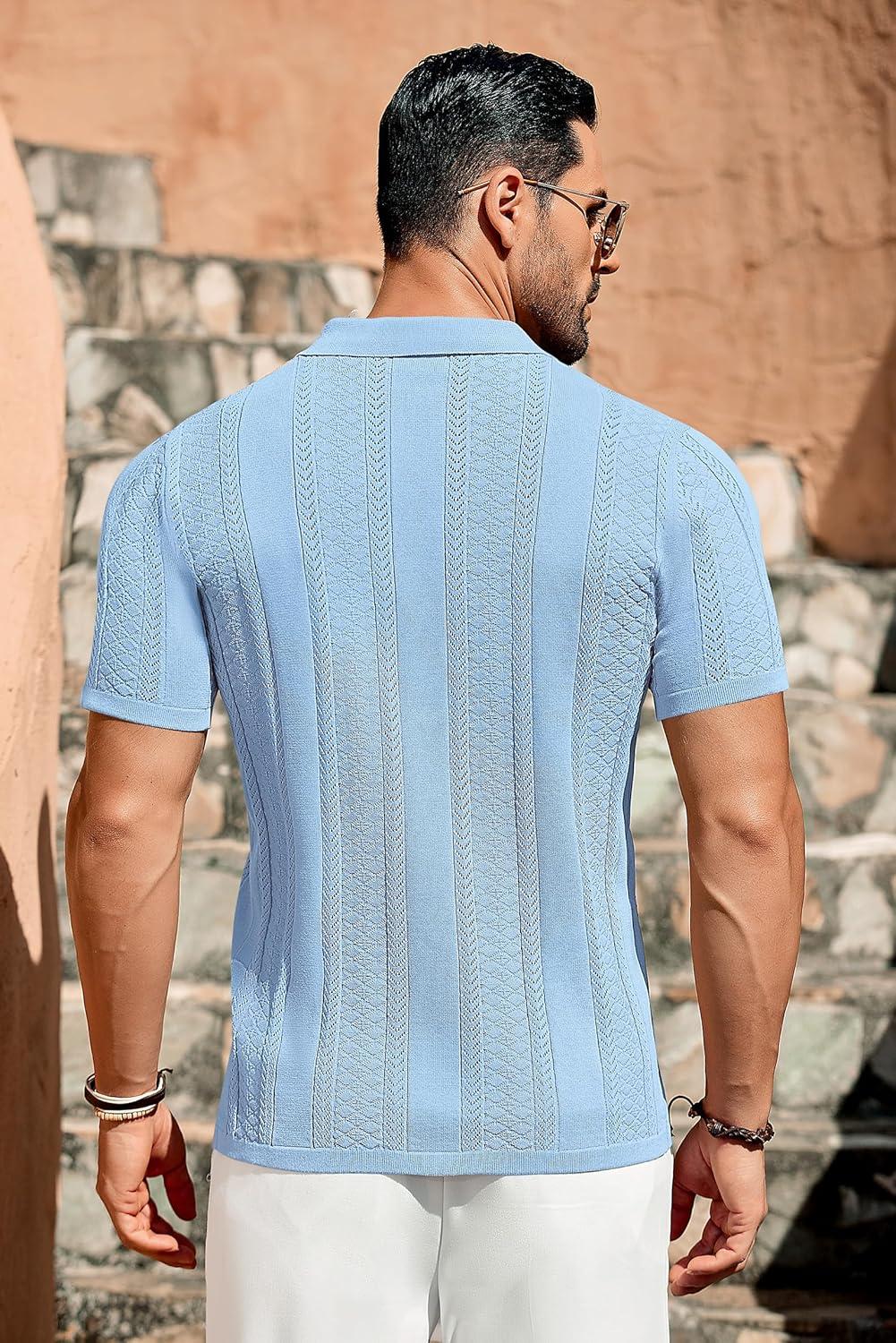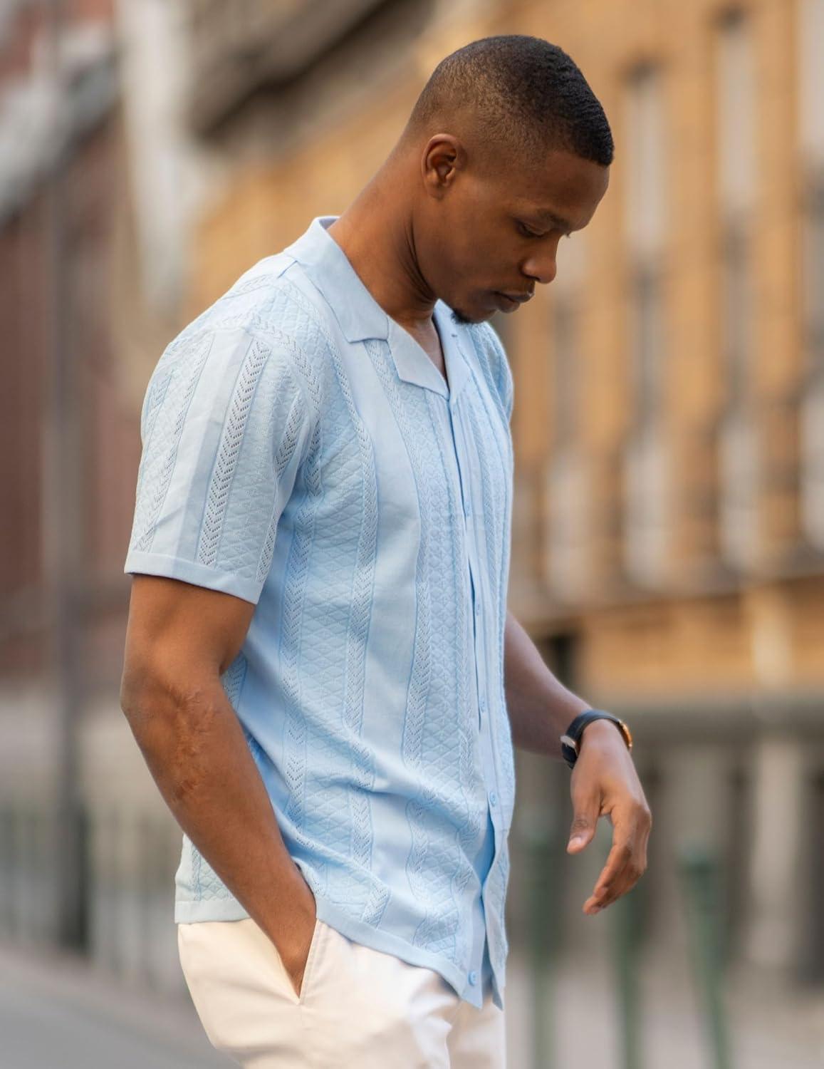COOFANDY Men's Knit Shirts Vintage Short Sleeve Button Down Shirt Casual Summer Beach Shirt(Light Blue)