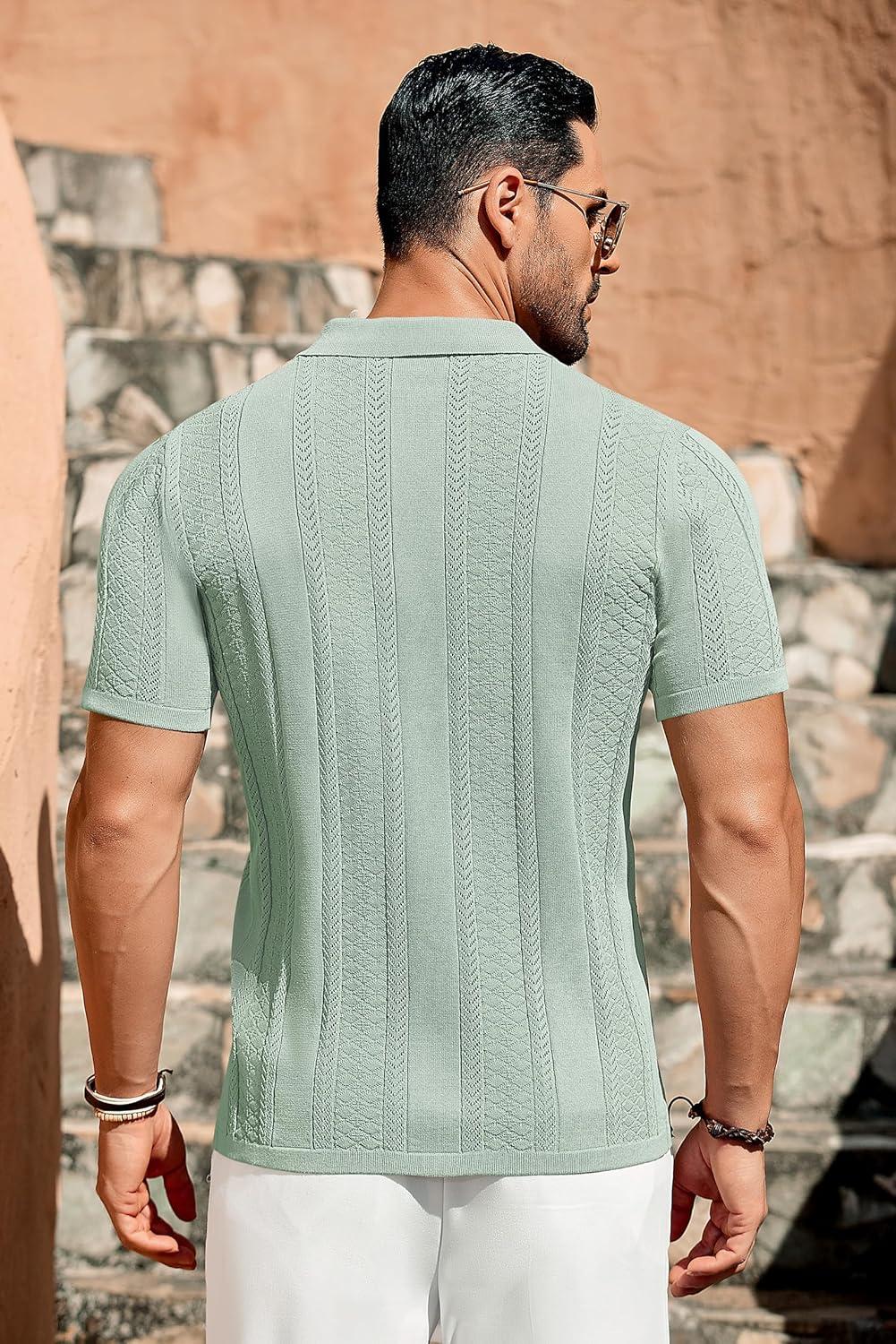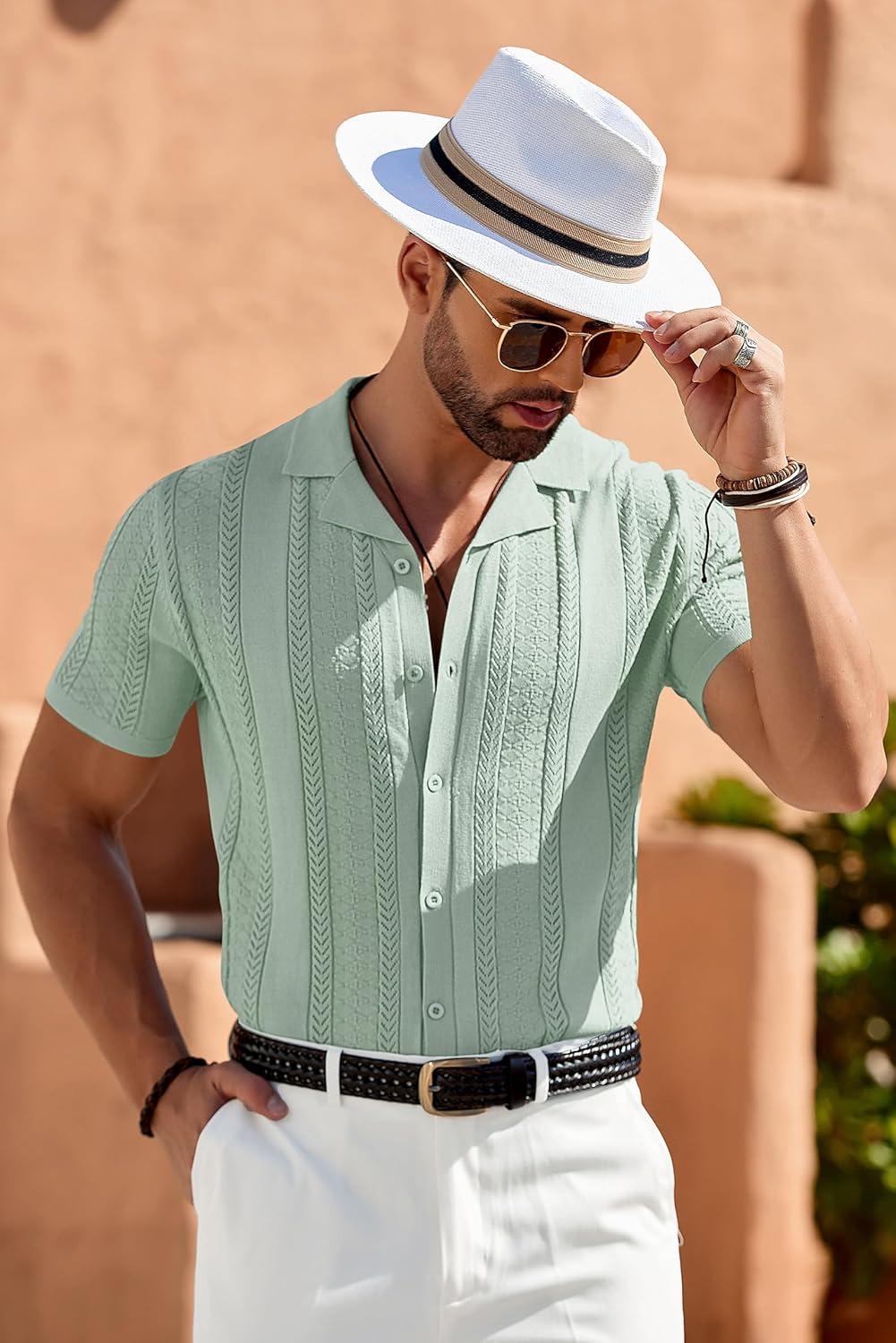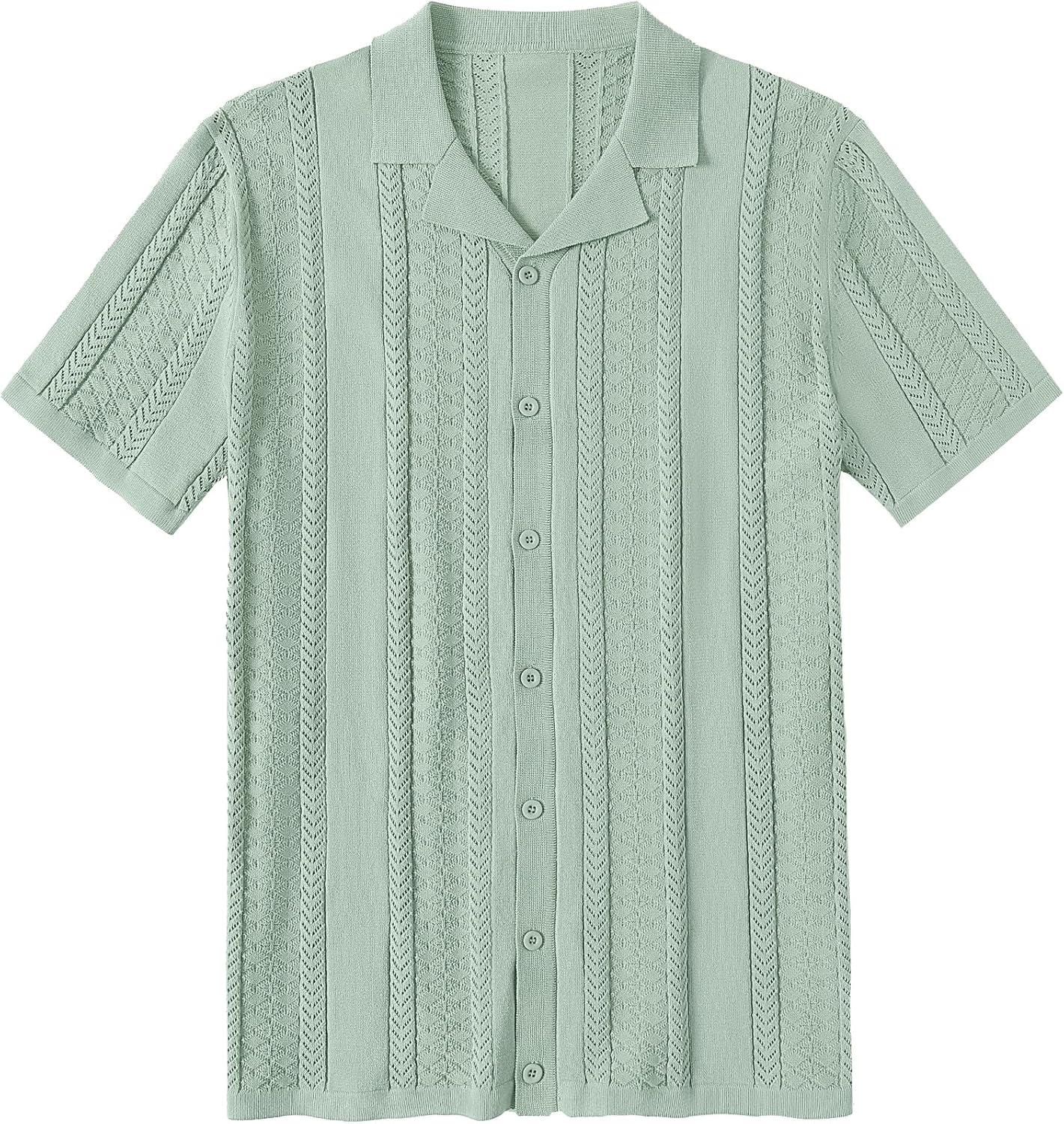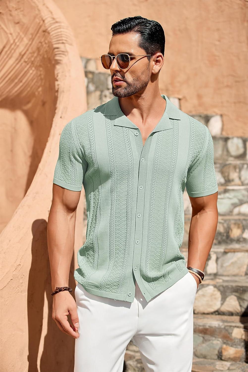 COOFANDY Men's Knit Shirts Vintage Short Sleeve Button Down Shirt Casual Summer Beach Shirt(Light Green)