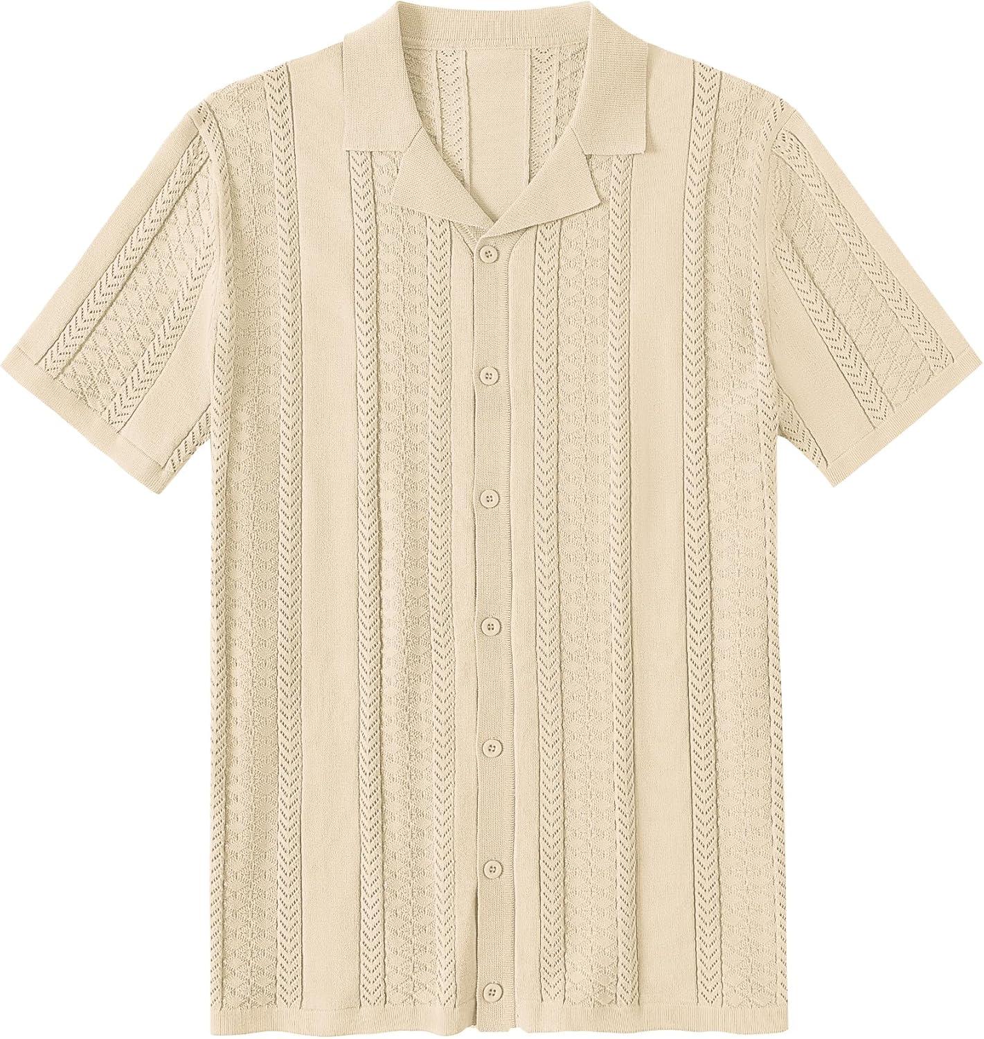 COOFANDY Men's Knit Shirts Vintage Short Sleeve Button Down Shirt Casual Summer Beach Shirt(Light Khaki)