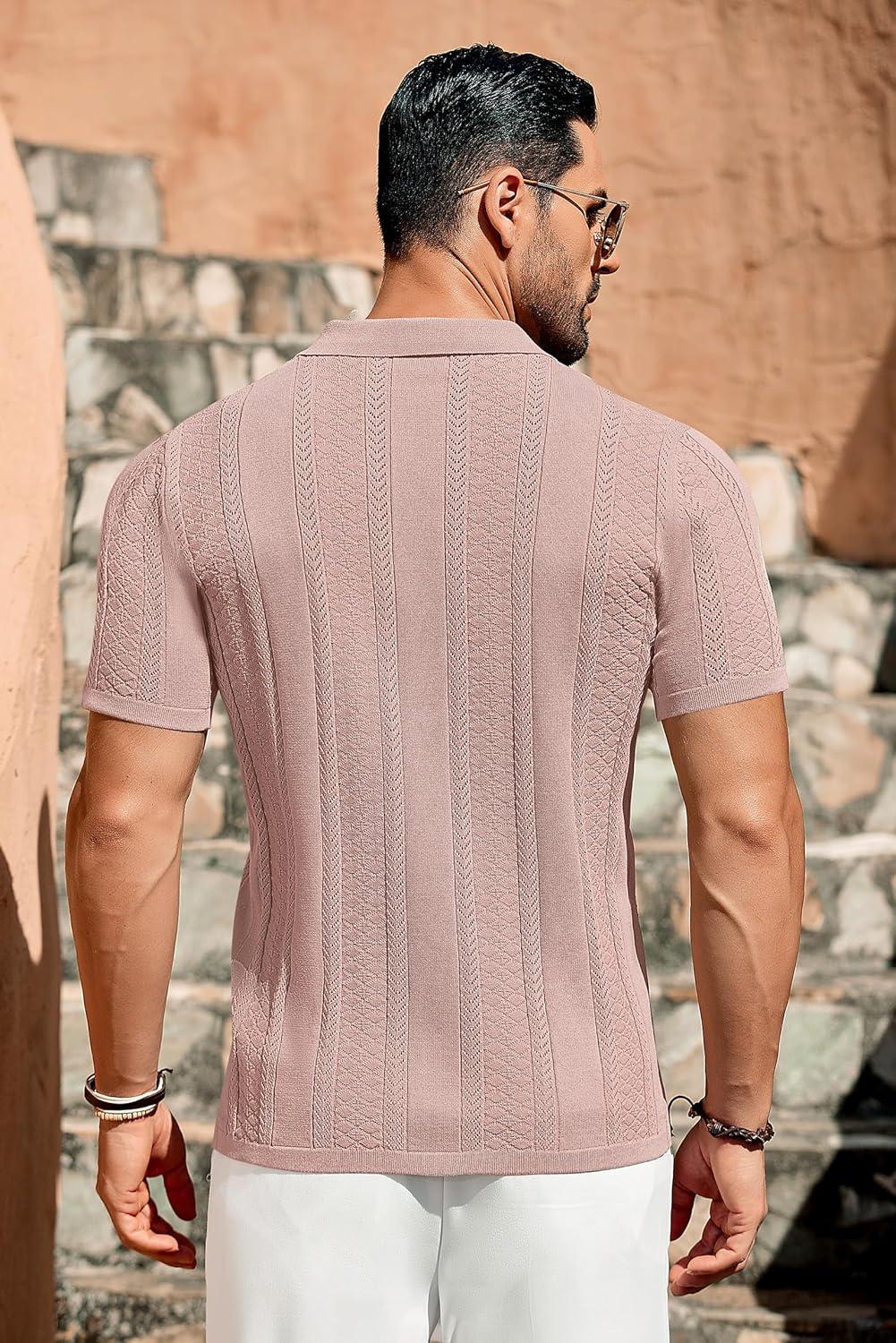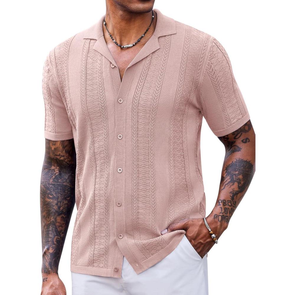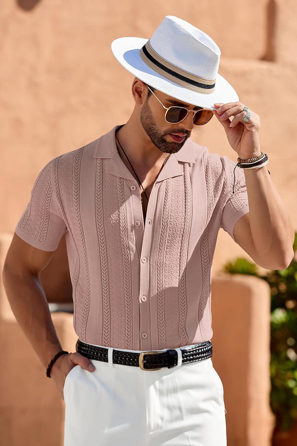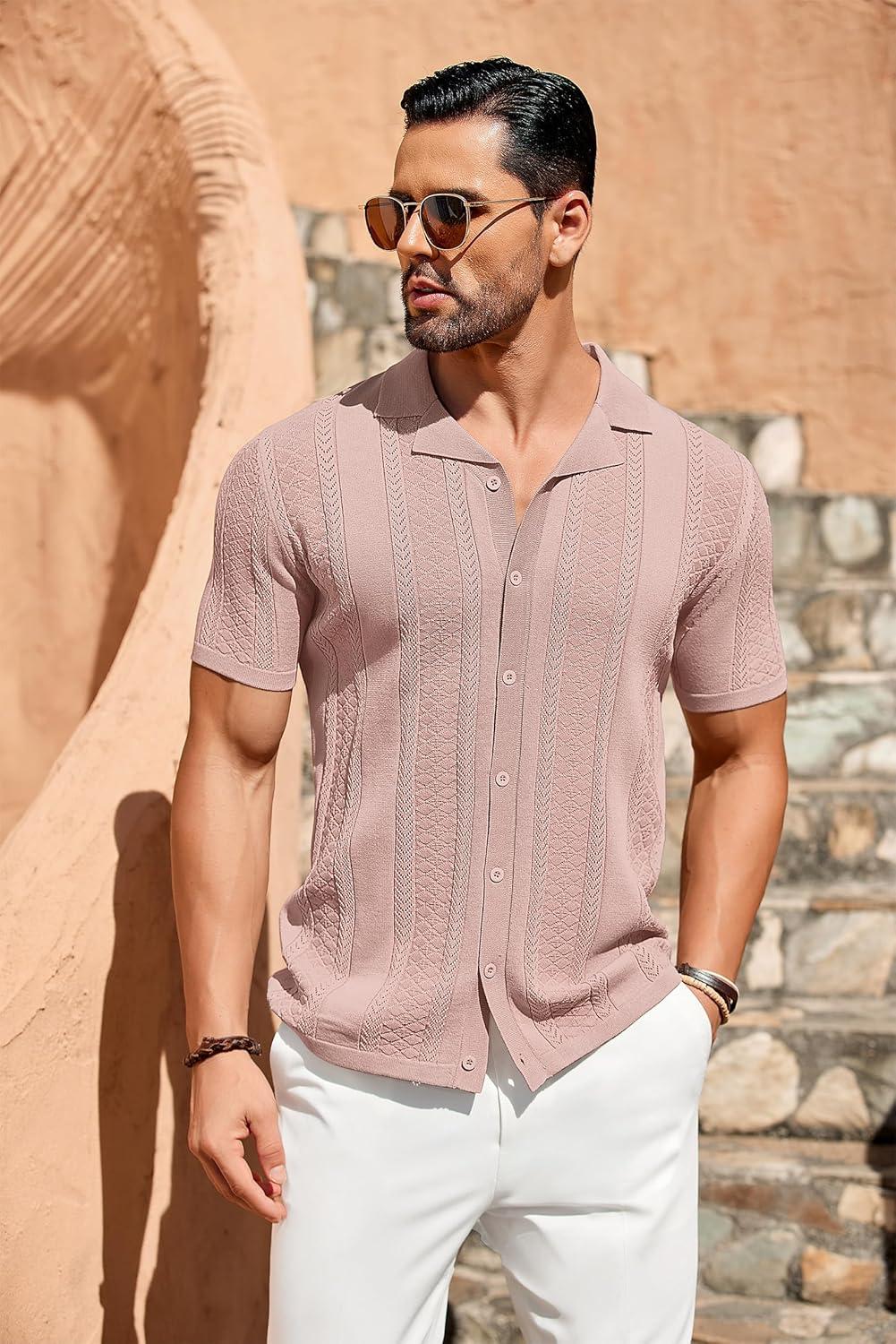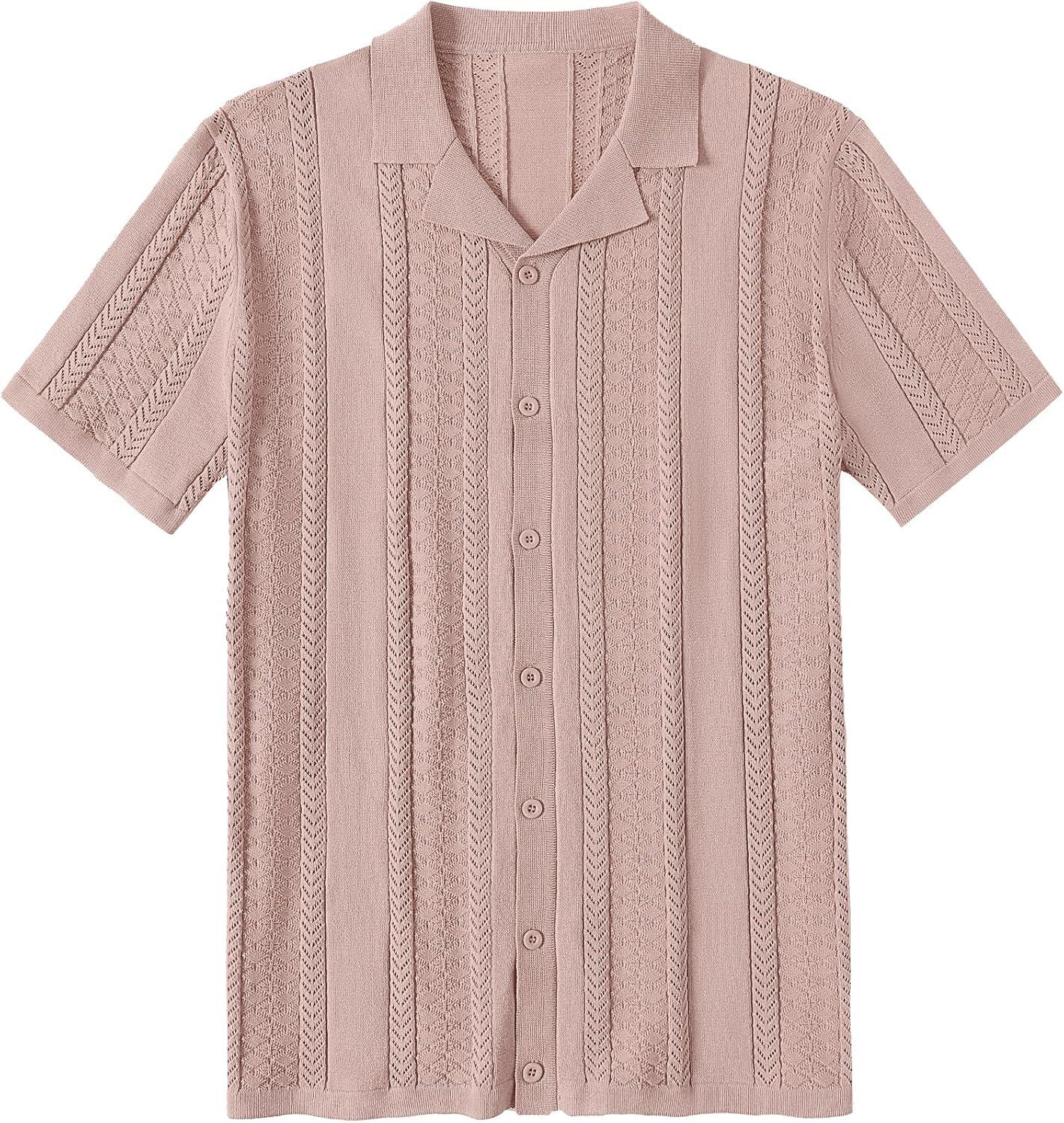 COOFANDY Men's Knit Shirts Vintage Short Sleeve Button Down Shirt Casual Summer Beach Shirt(Pink)