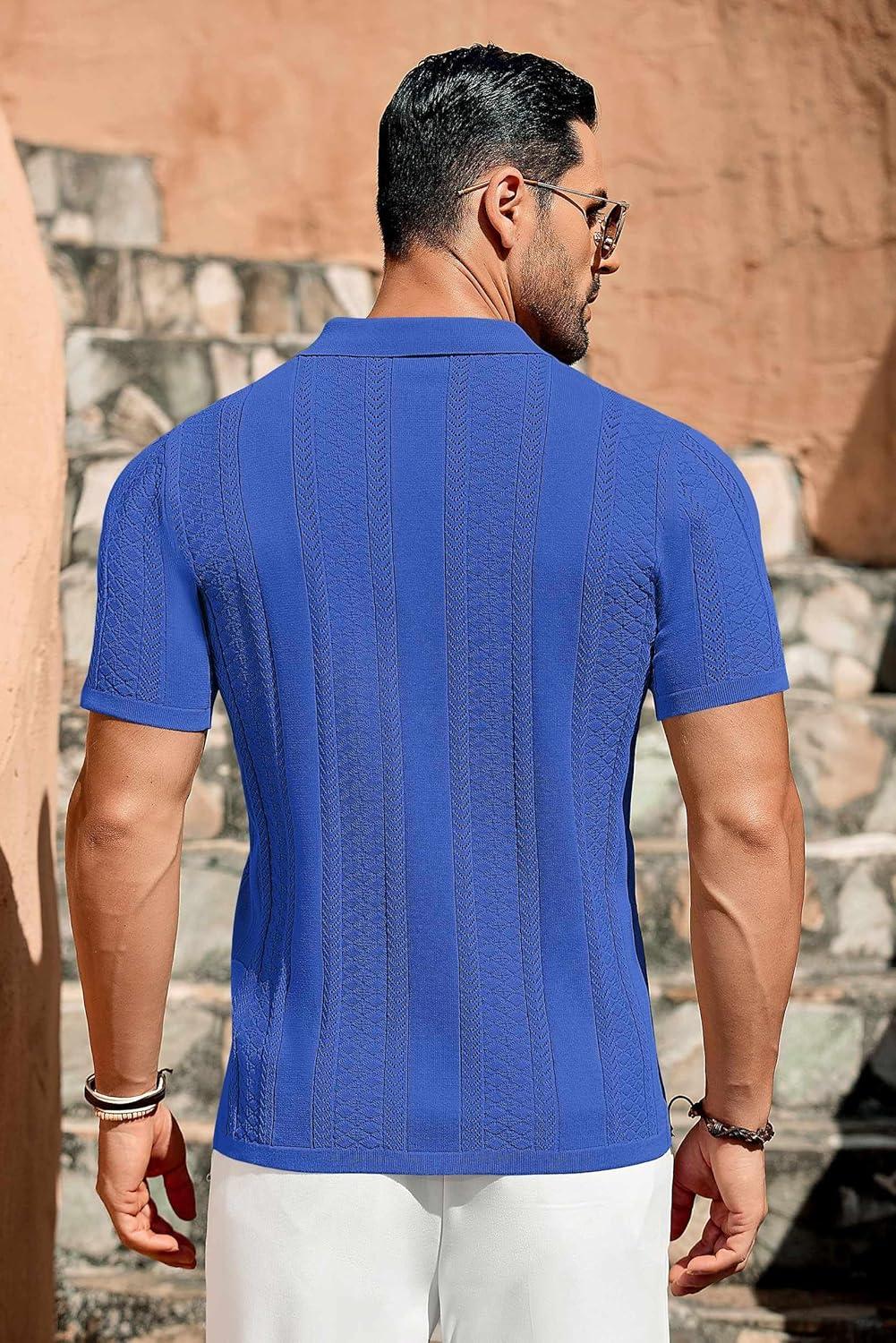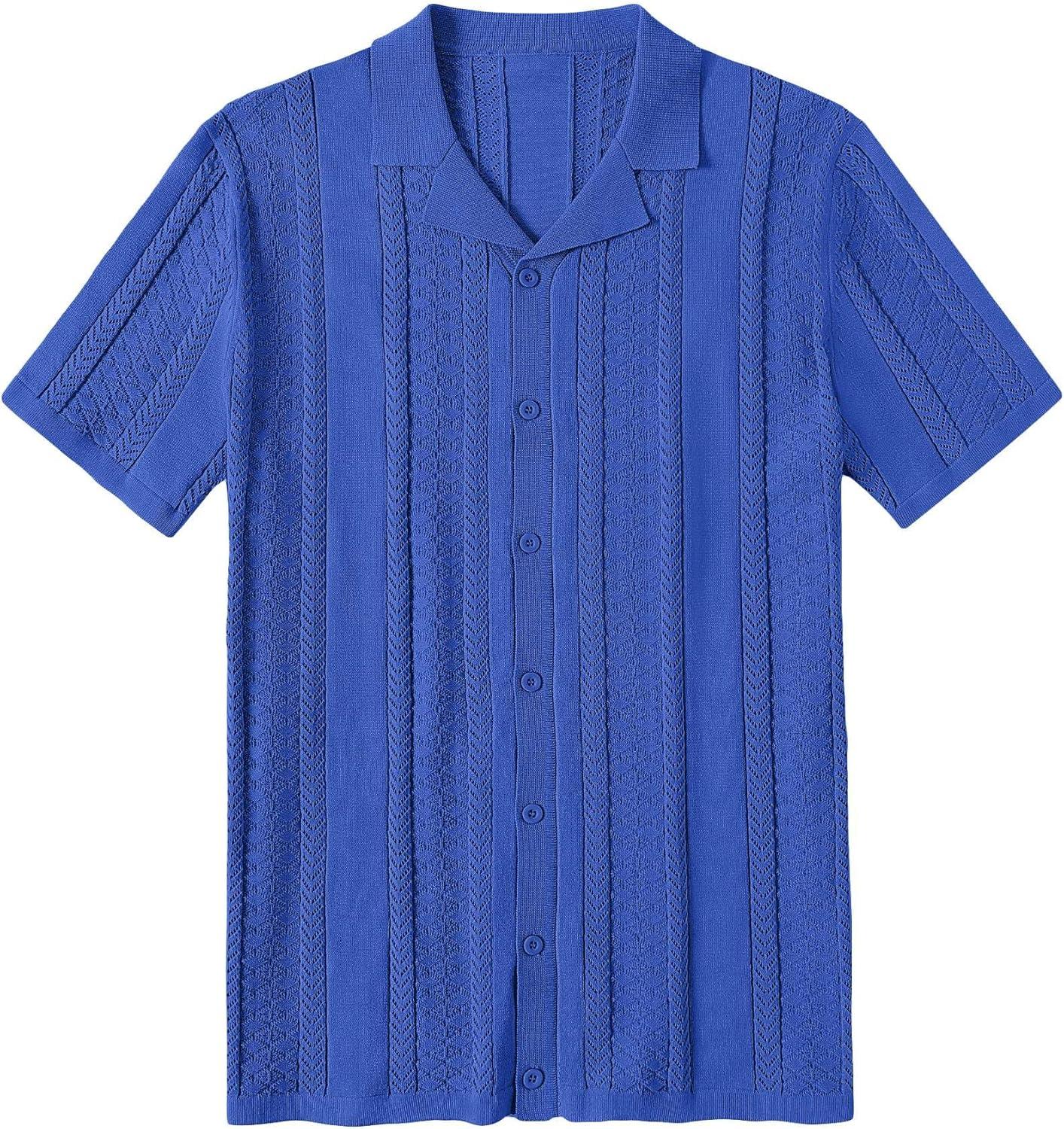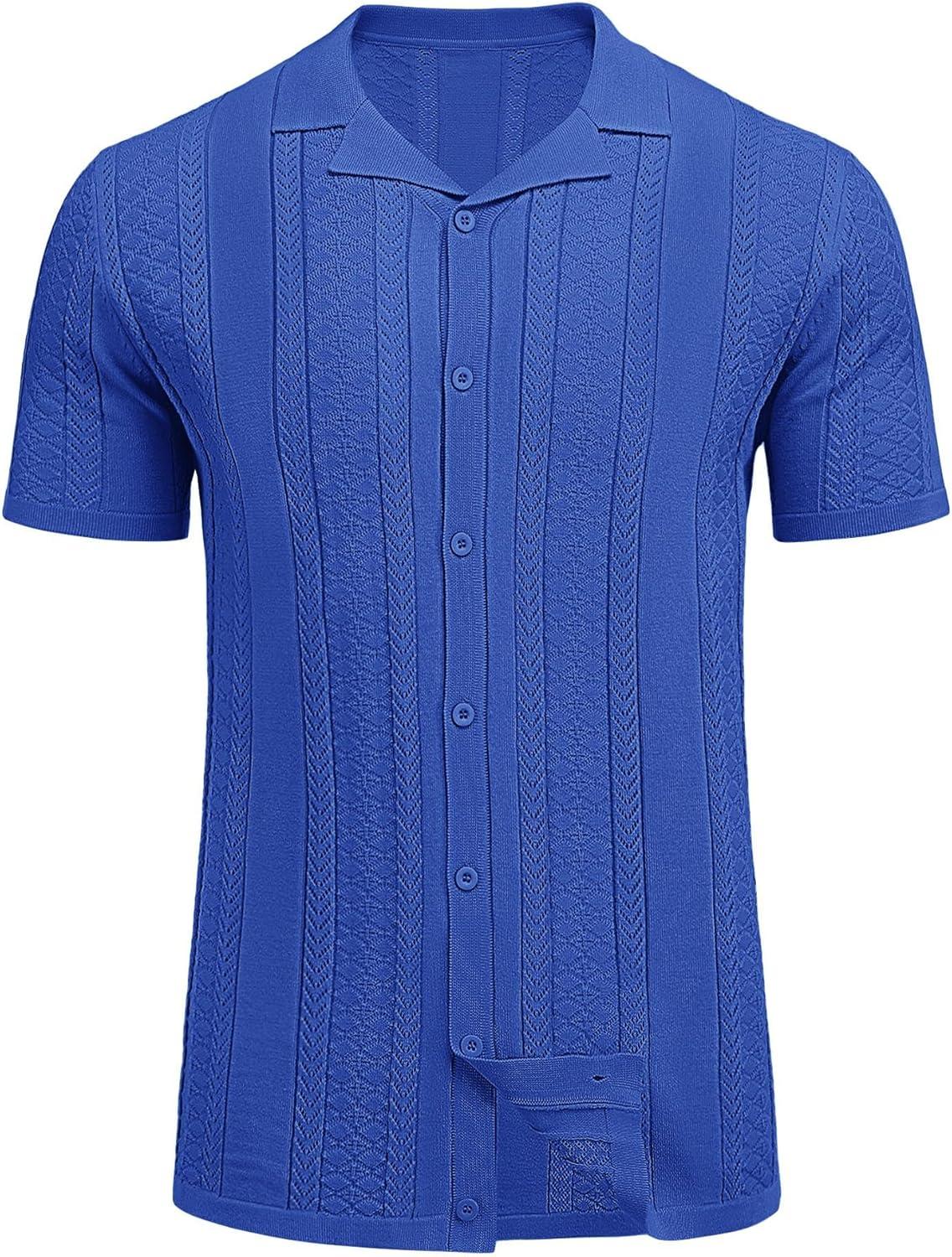 COOFANDY Men's Knit Shirts Vintage Short Sleeve Button Down Shirt Casual Summer Beach Shirt(Royal Blue)