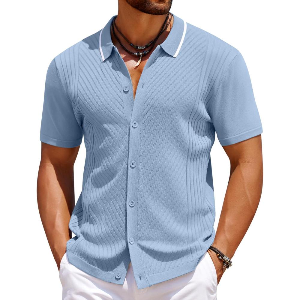 COOFANDY Men’s Knit Short Sleeve Button Down Shirt Vintage Polo Shirt Casual Summer Beach Shirts(Angel Falls)