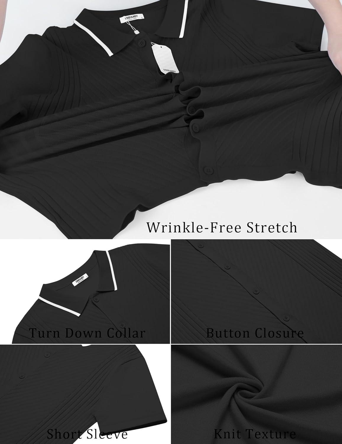 COOFANDY Men's Knit Short Sleeve Button Down Shirt Vintage Polo Shirt Casual Summer Beach Shirts(Black)