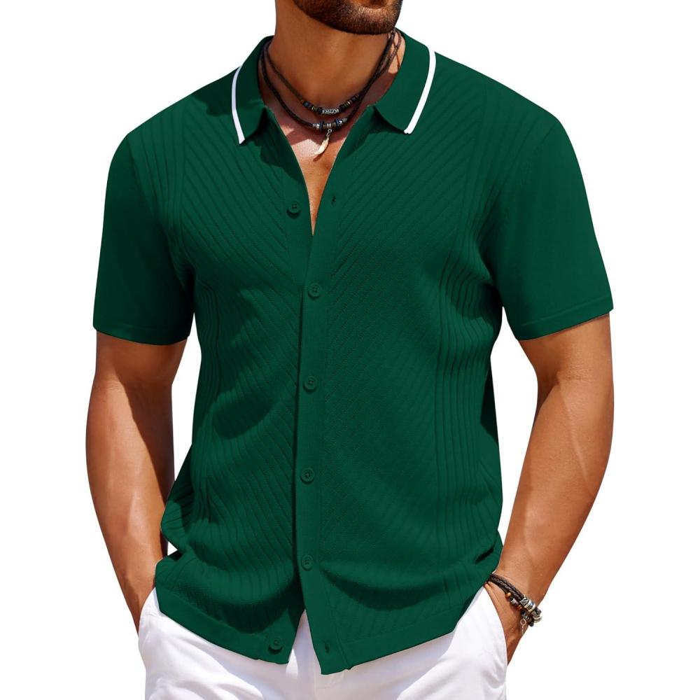 COOFANDY Men's Knit Short Sleeve Button Down Shirt Vintage Polo Shirt Casual Summer Beach Shirts(Evergreen)