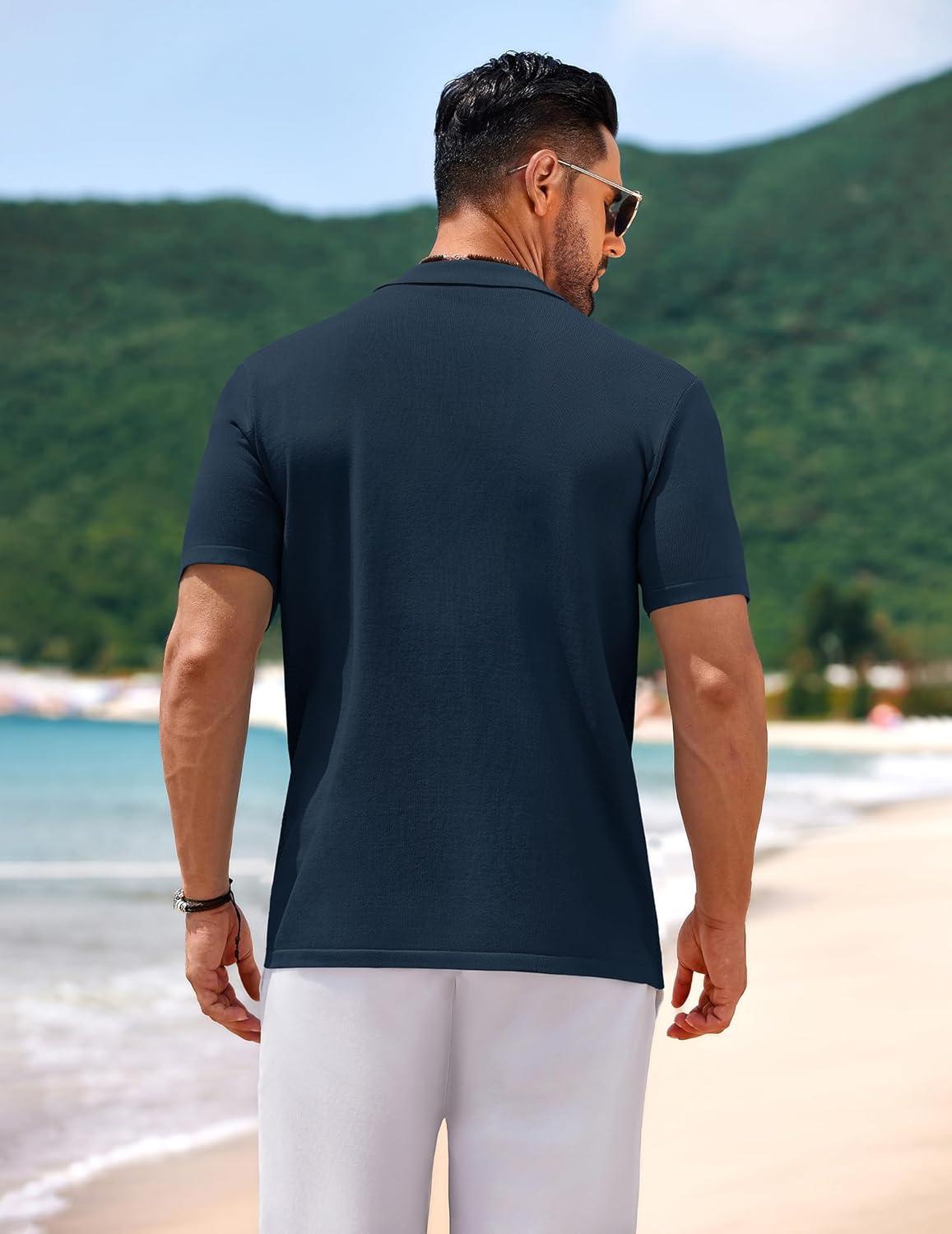 COOFANDY Mens Knit Short Sleeve Shirt Casual Button Down Shirt Vintage Fashion Polo Shirts Crochet Summer Beach Shirts(Navy Blue)