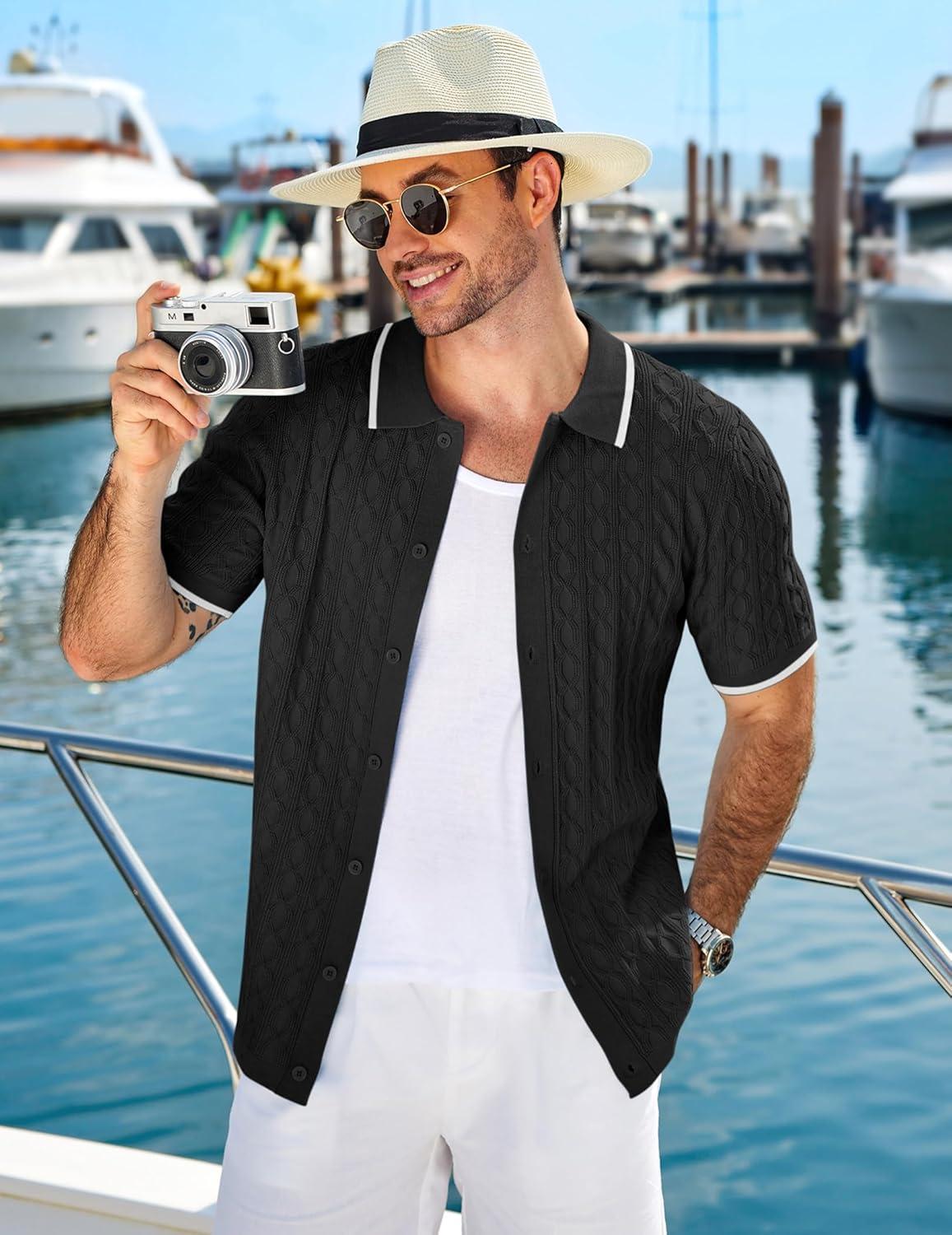 COOFANDY Men's Knit Short Sleeve Shirts Button Down Vintage Knitted Polo Shirt Casual Beach Crochet Cable Vacation Shirt(Black-white)
