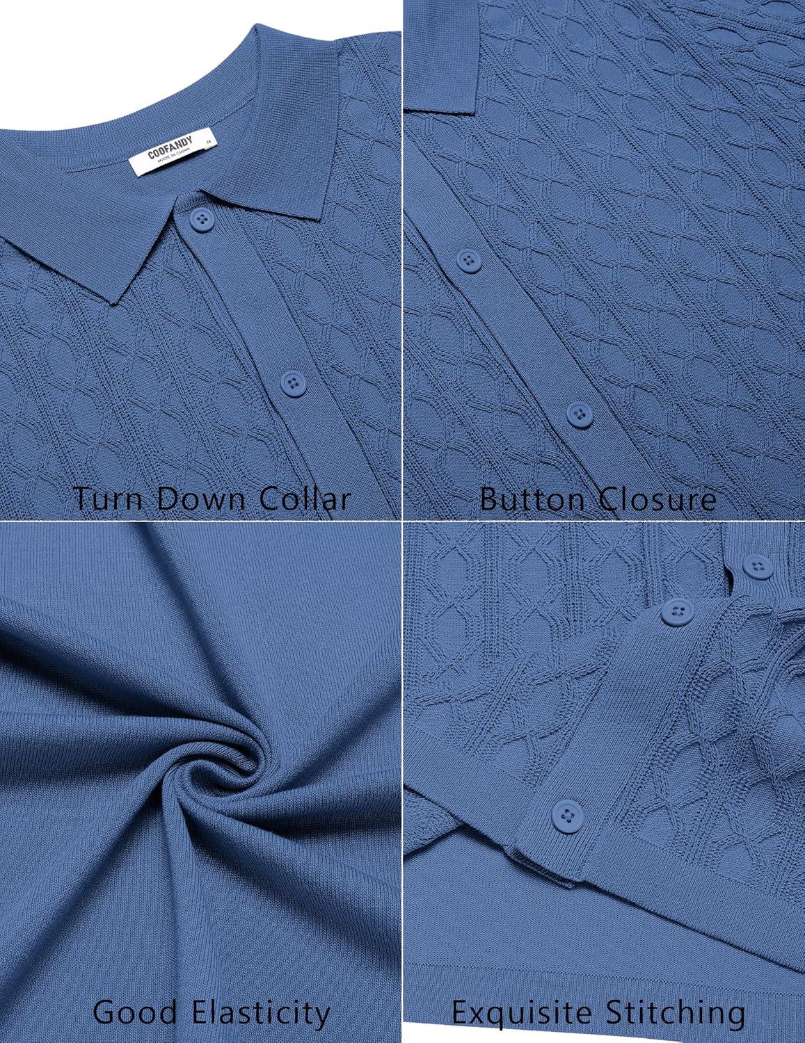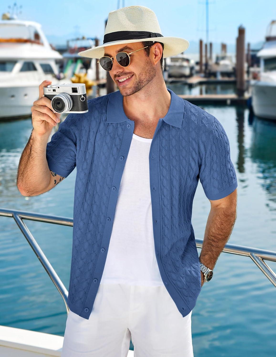 COOFANDY Men's Knit Short Sleeve Shirts Button Down Vintage Knitted Polo Shirt Casual Beach Crochet Cable Vacation Shirt(Denim Blue)