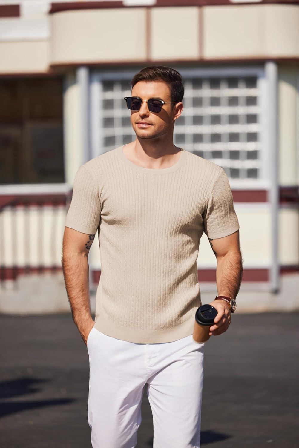 COOFANDY Men's Knit T Shirt Short Sleeve Crewneck Casual Vintage T-Shirts Summer Twist Knitted Pullover Tee(Beige)
