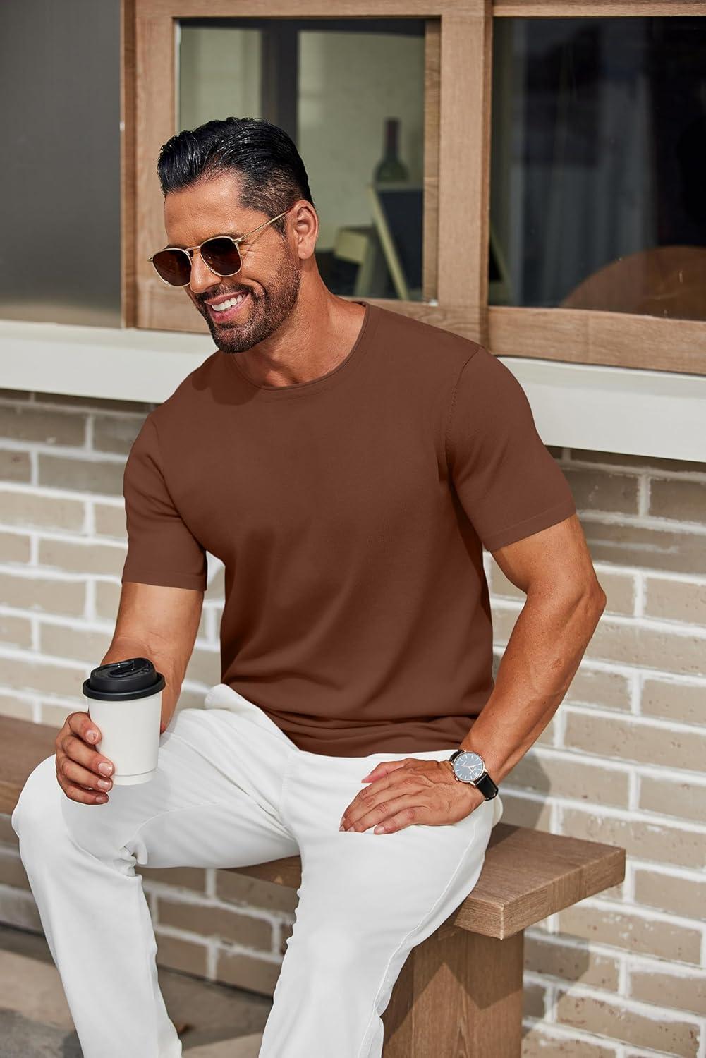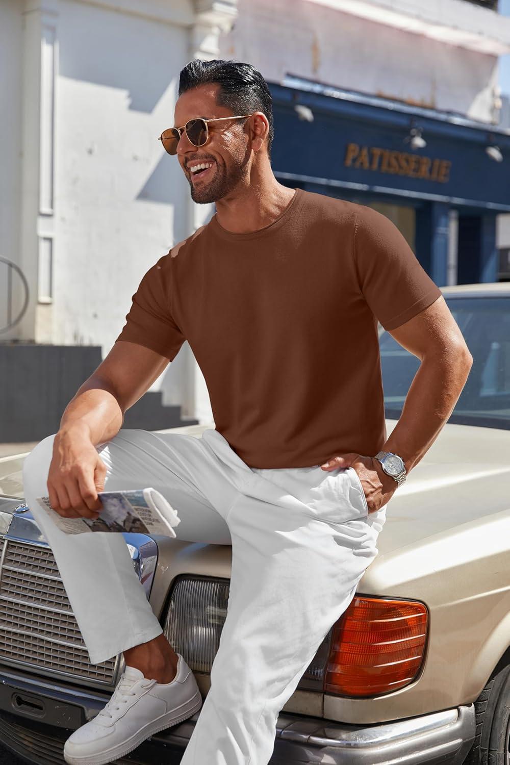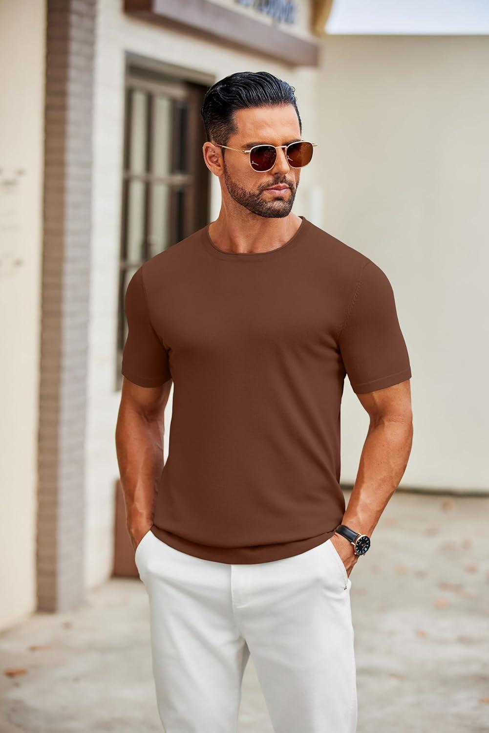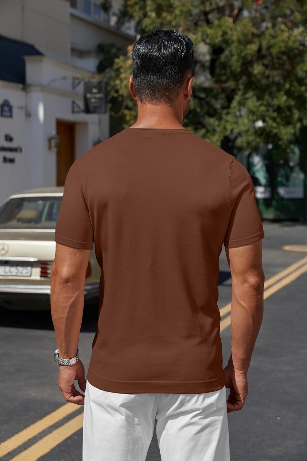 COOFANDY Mens Knit T-Shirts Casual Crewneck Short Sleeve Shirts Summer Tops Basic Pullover Tees(Brown)