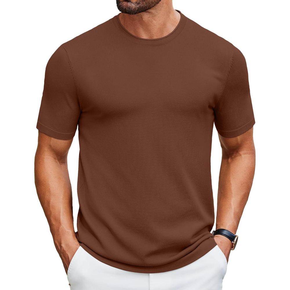 imageCOOFANDY Mens Knit TShirts Casual Crewneck Short Sleeve Shirts Summer Tops Basic Pullover TeesBrown