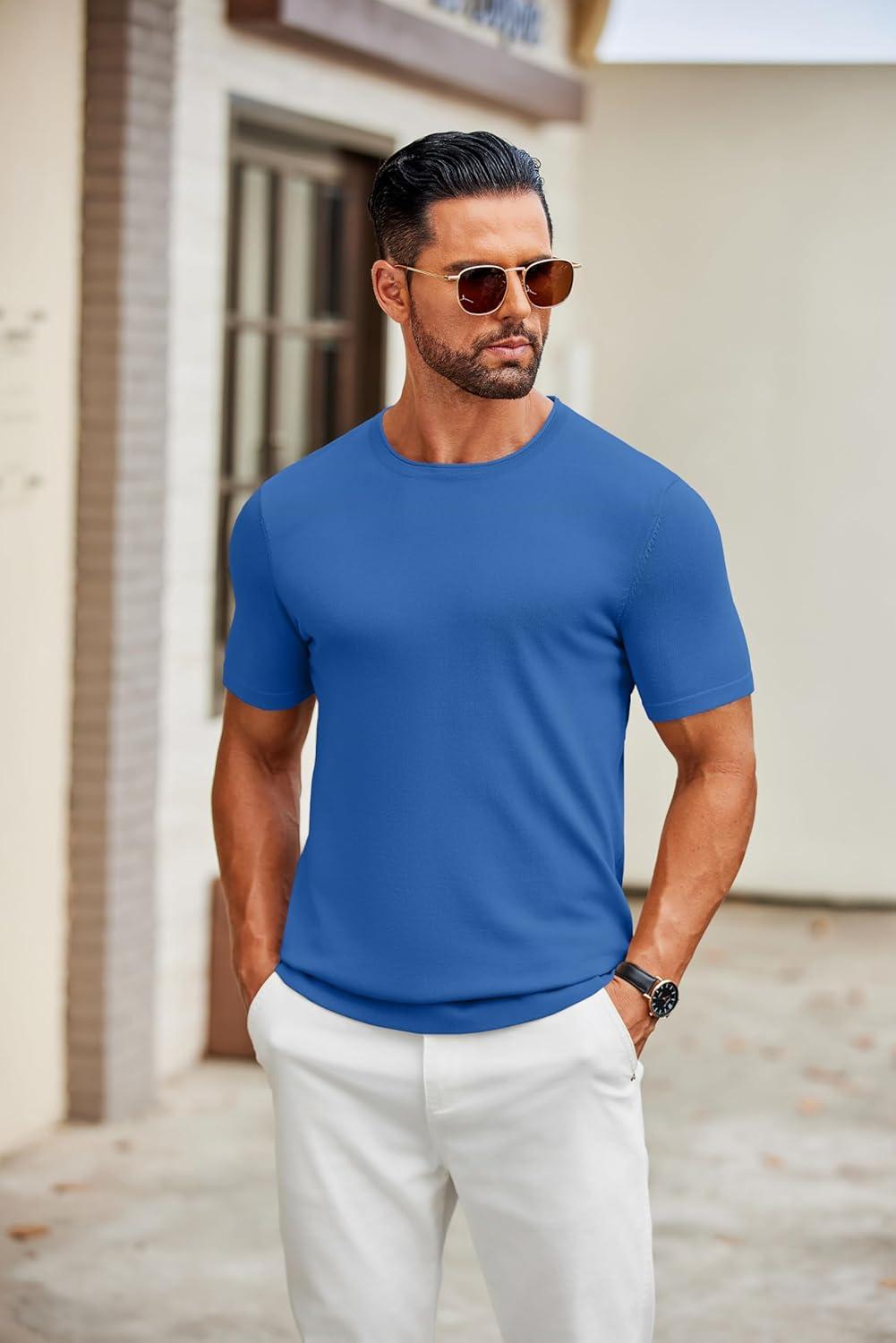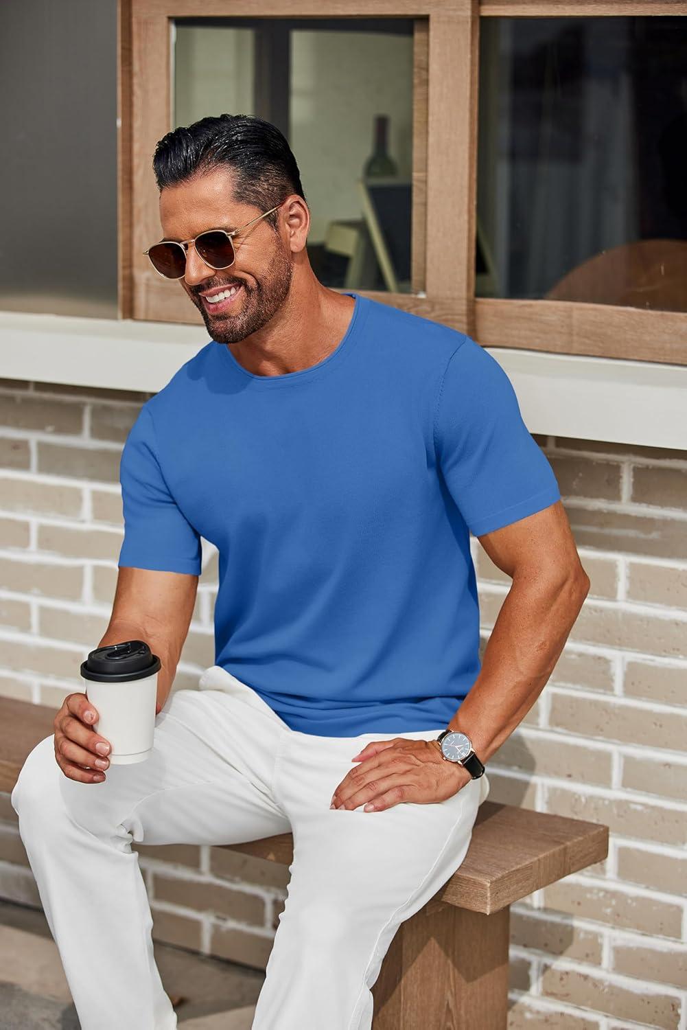 COOFANDY Mens Knit T-Shirts Casual Crewneck Short Sleeve Shirts Summer Tops Basic Pullover Tees(Denim Blue)