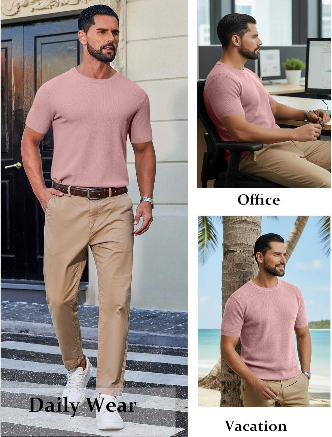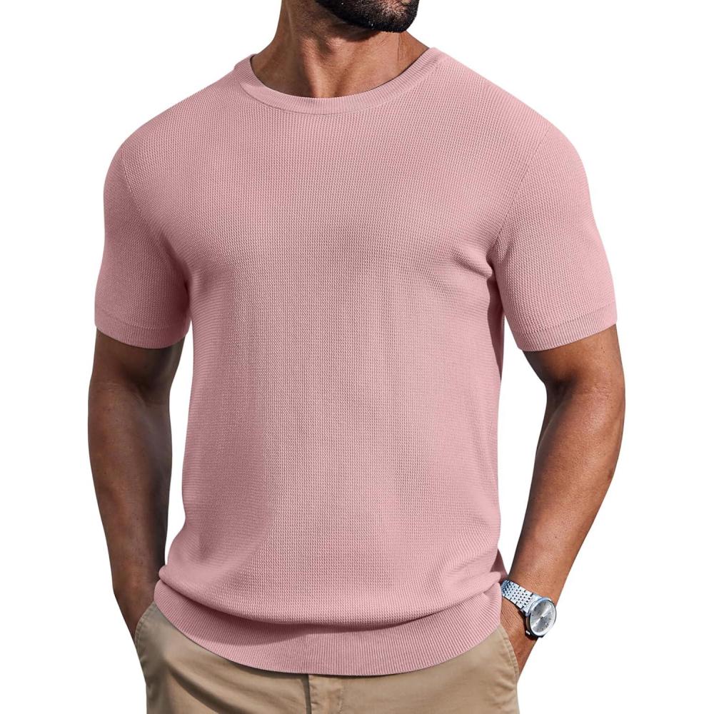 COOFANDY Mens Knit T-Shirts Casual Short Sleeve Crewneck Shirt Textured Pullover Tees(Pink)
