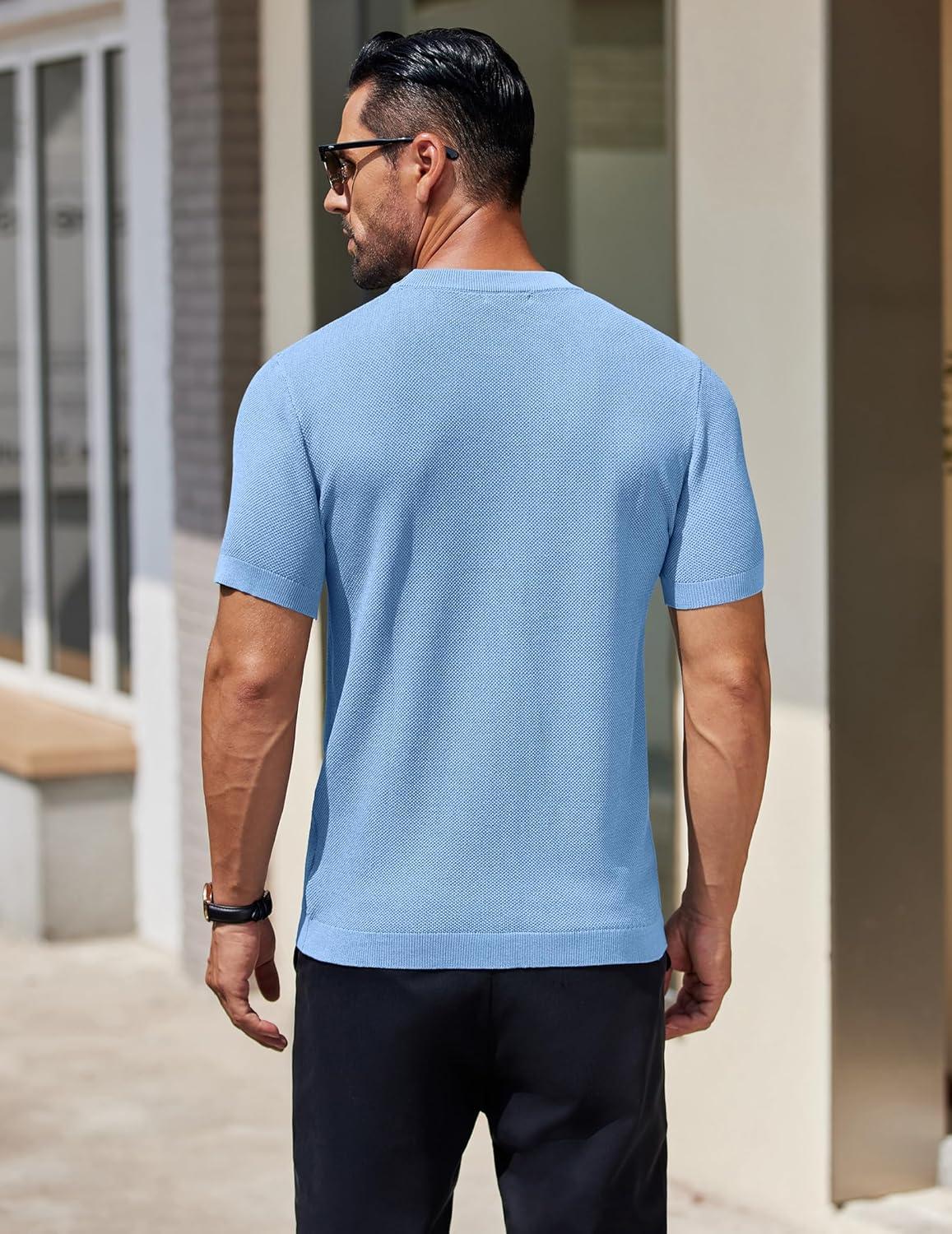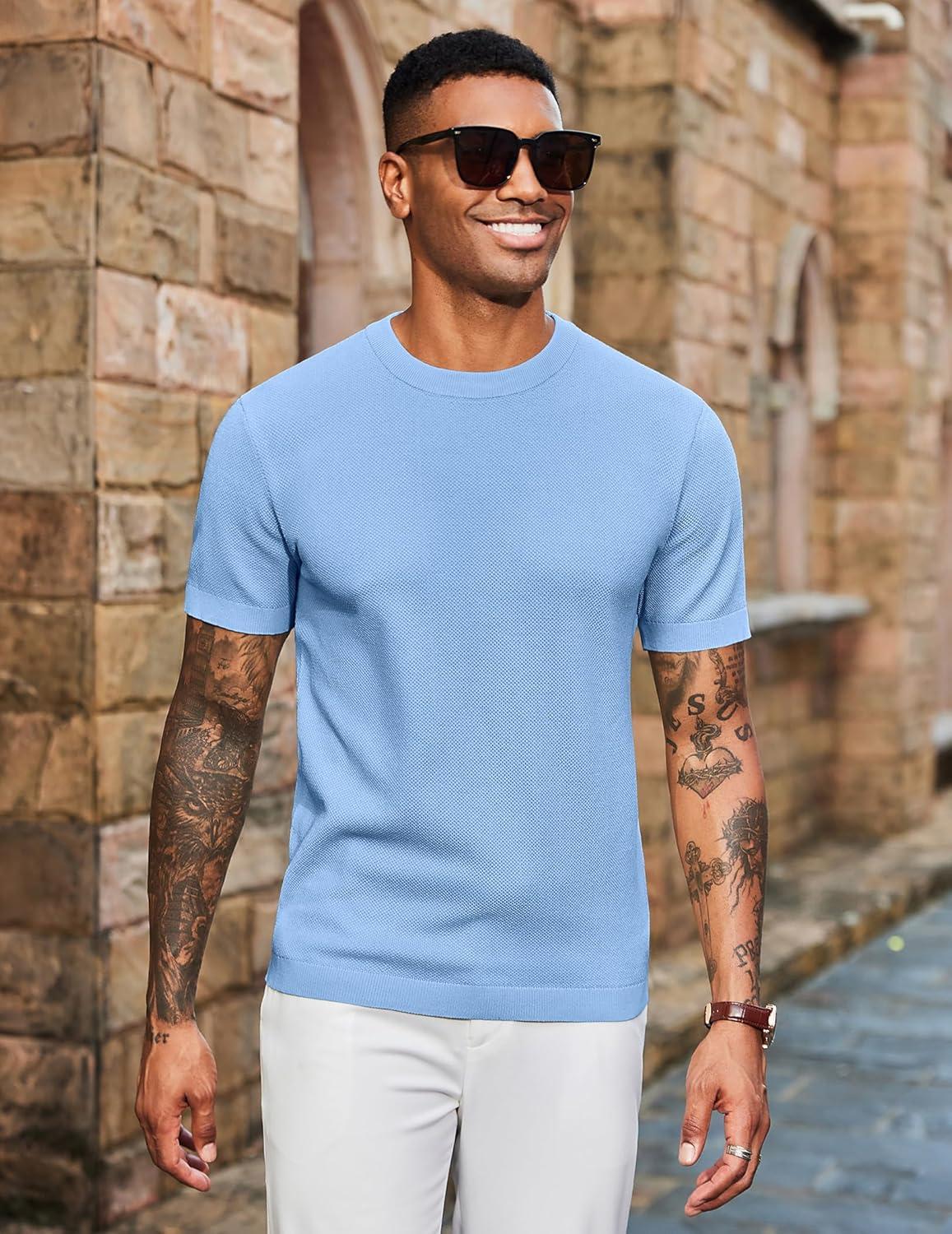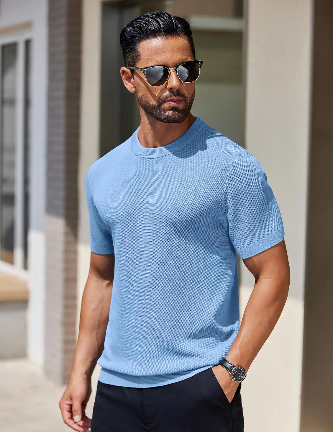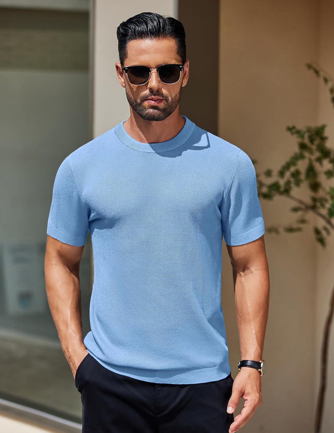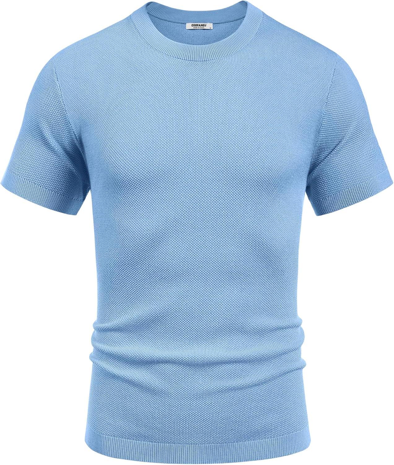 COOFANDY Men's Knit T-Shirts Short Sleeve Crewneck Shirt Casual Textured Pullover Tees(Light Blue)