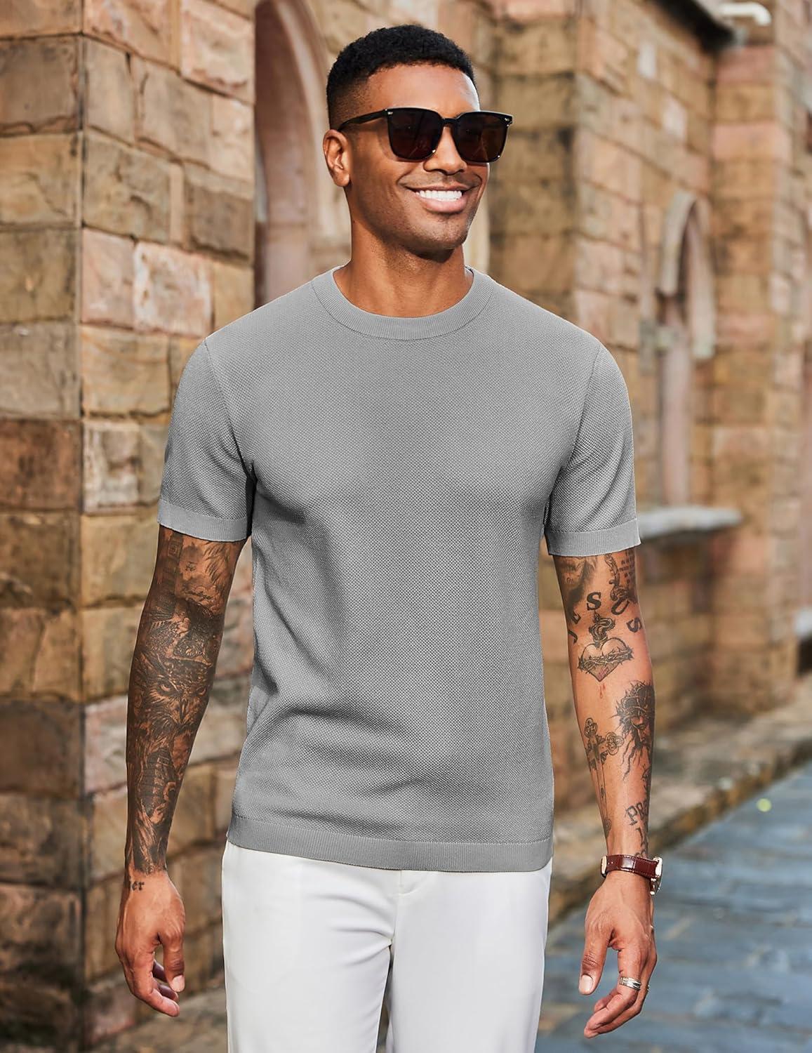 COOFANDY Men’s Knit T-Shirts Short Sleeve Crewneck Shirt Casual Textured Pullover Tees(Light Grey)