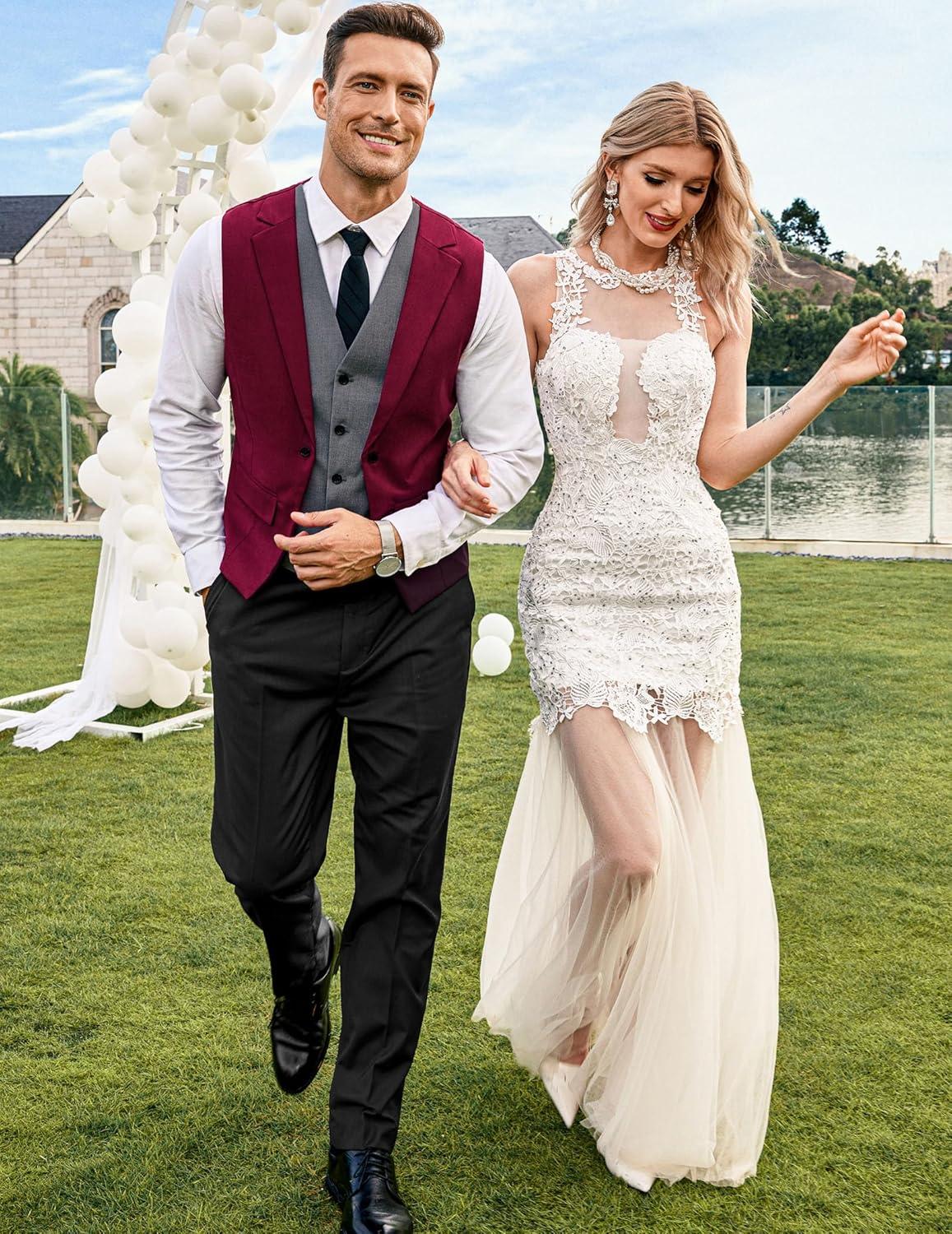 imageCOOFANDY Mens Layered Suit Vest Business Dress Vests Formal Wedding Waistcoat Slim FitWine Red
