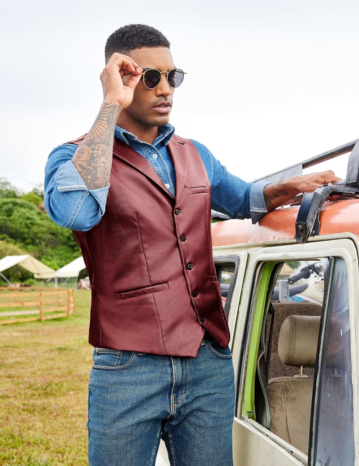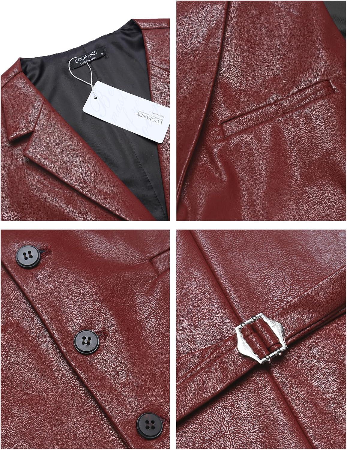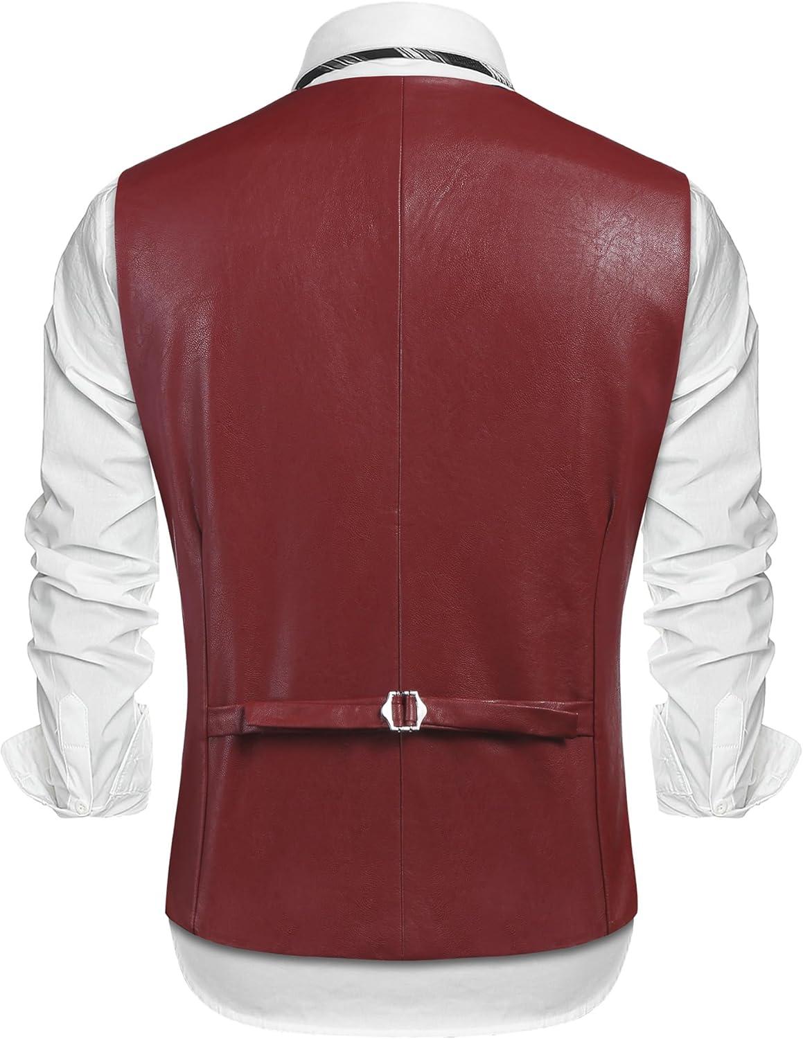 COOFANDY Men's Leather Suit Vest Casual Western Vest Jacket Lightweight V-Neck Dress Waistcoats(Burgundy)