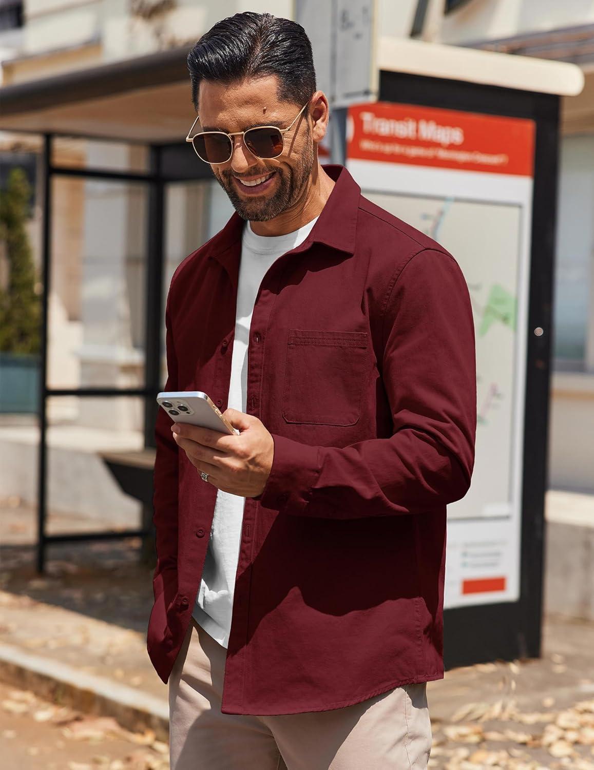 COOFANDY Mens Lightweight Button Down Shirt Jacket Casual Shacket Overshirt(Wine Red)