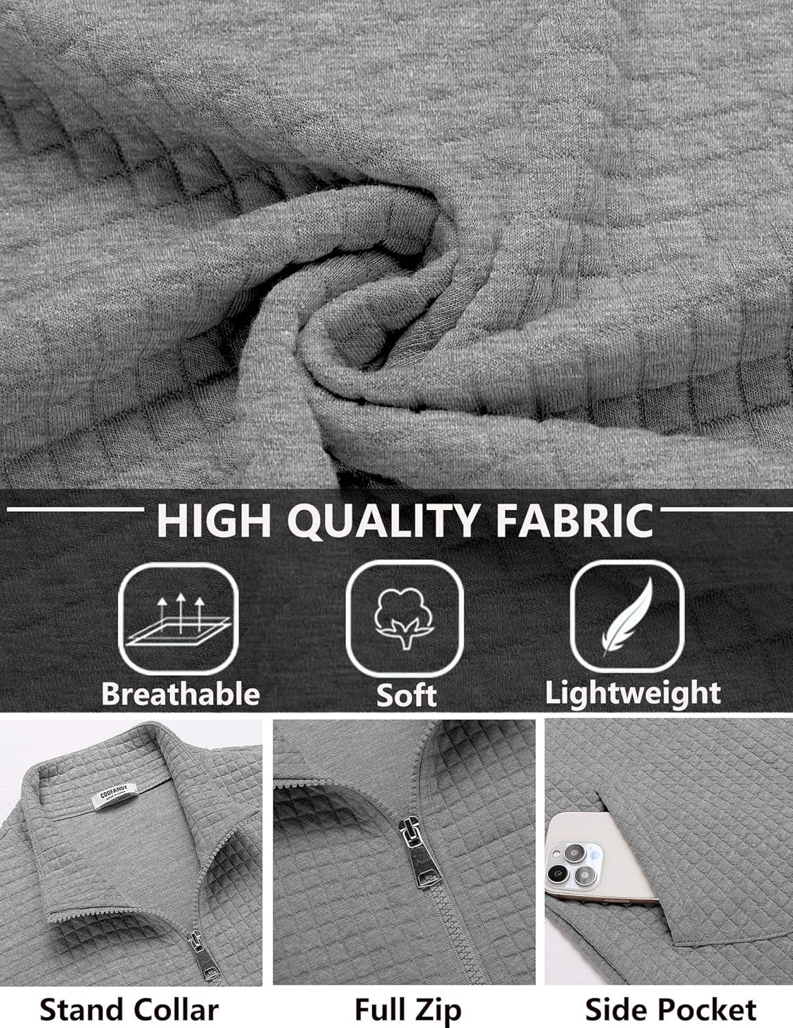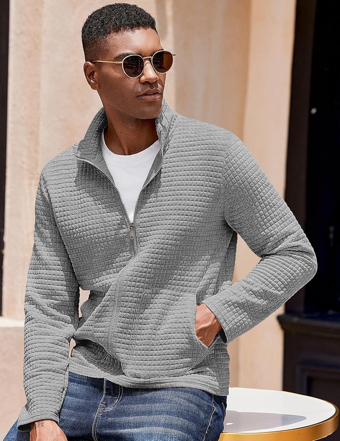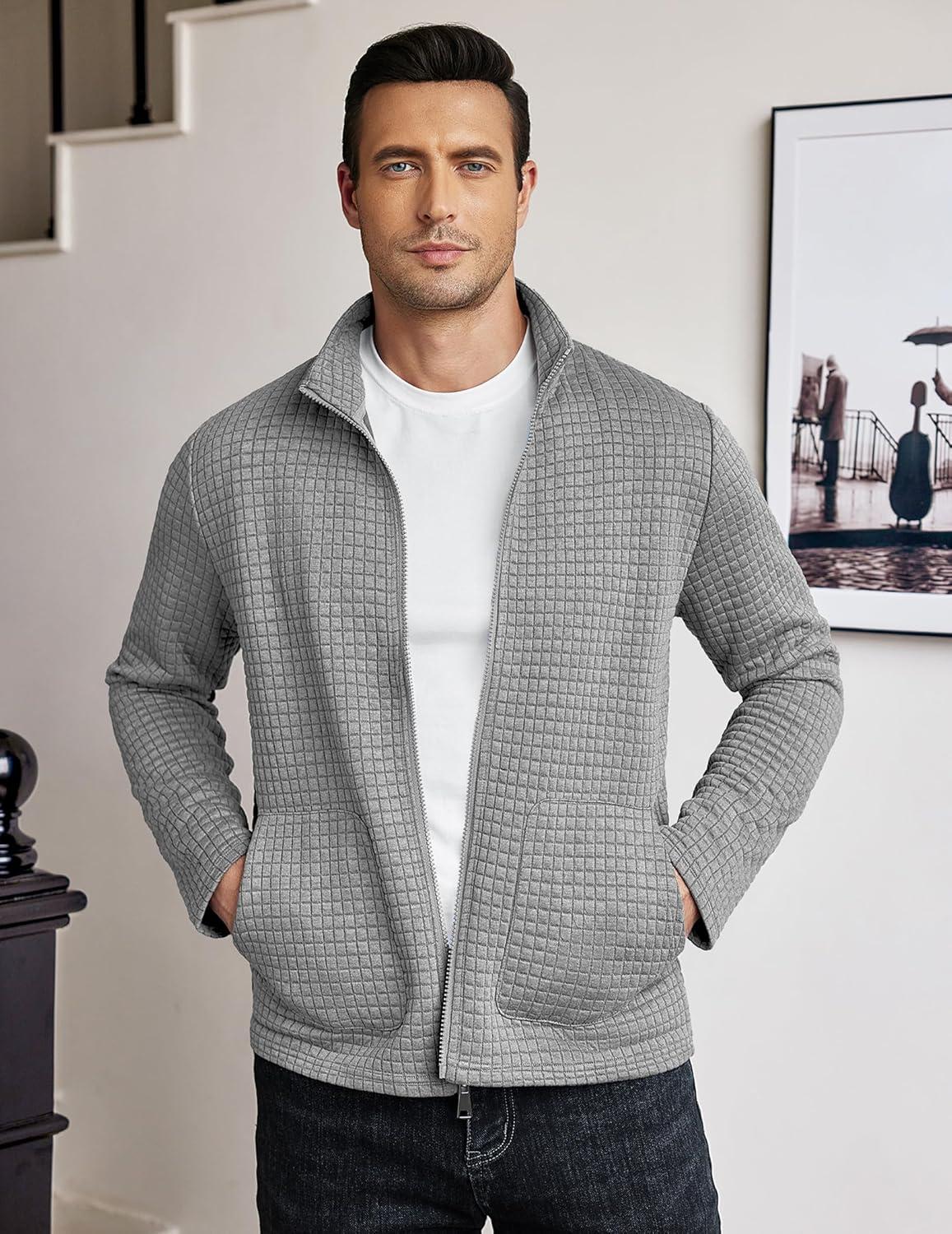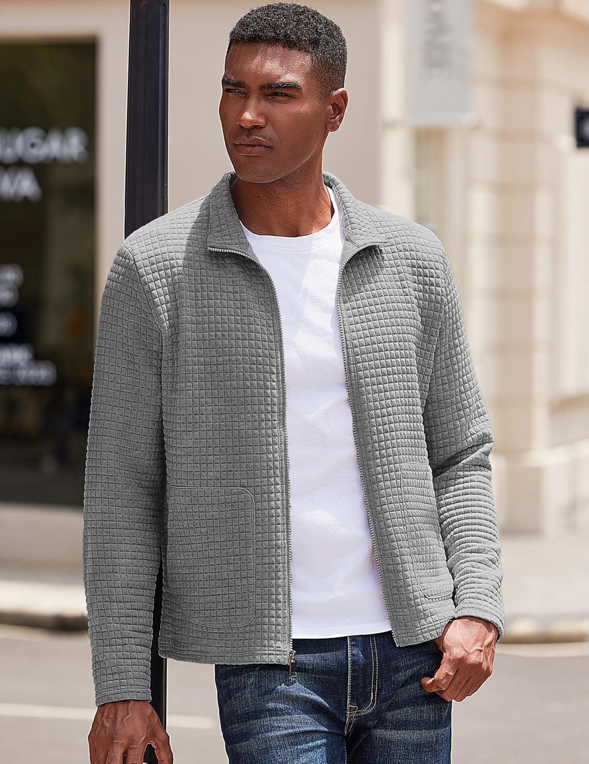 COOFANDY Men's Lightweight Varsity Jacket Casual Bomber Jackets Waffle Zip Up Coat with Pocket(Light Grey)