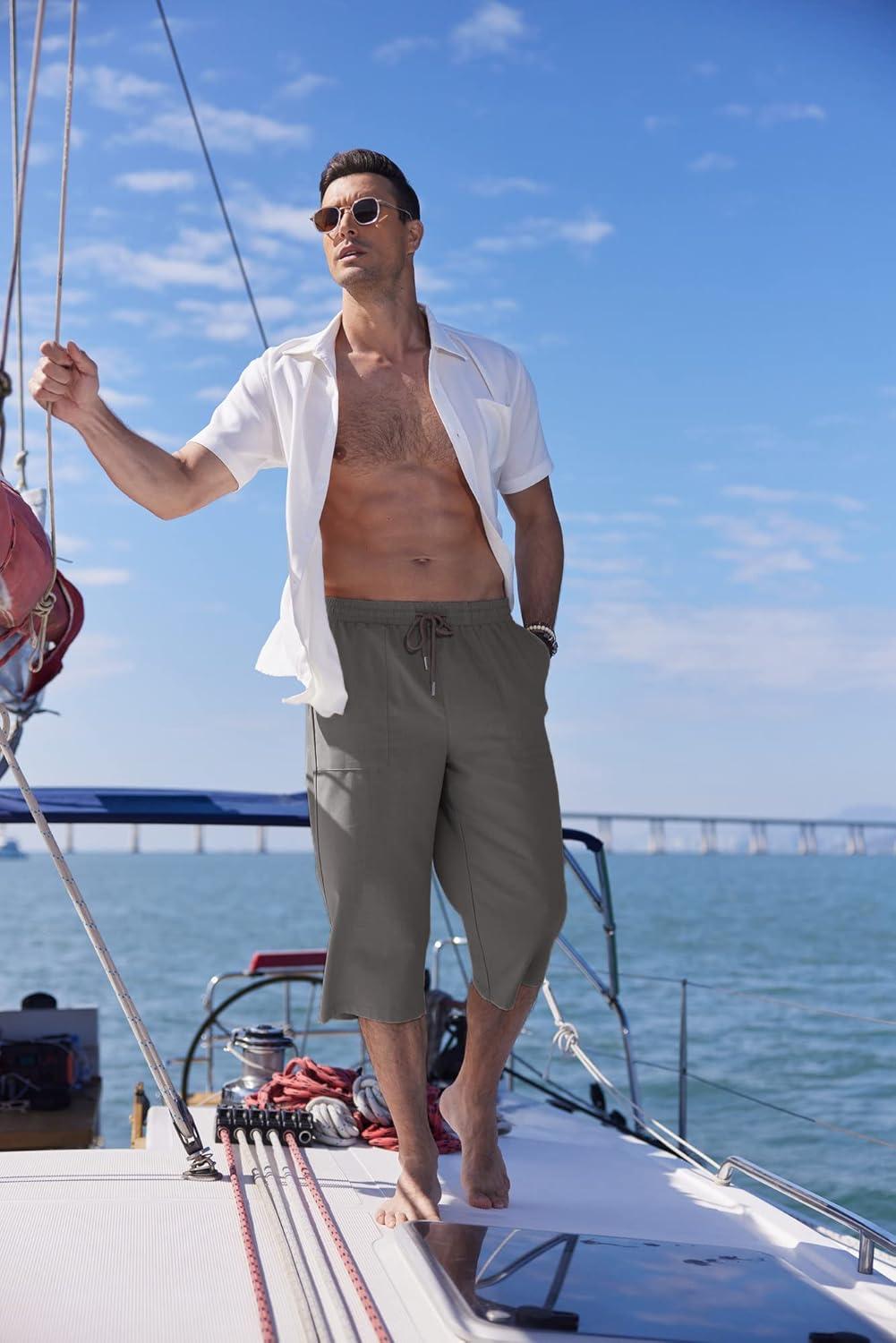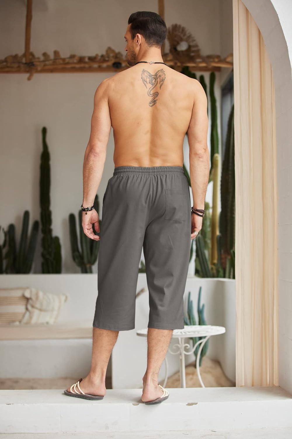 COOFANDY Men's Linen Capri Pants Casual Lightweight 3/4 Baggy Pants Drawstring Elastic Waist Beach Yoga Pants with Pockets(Dark Grey)