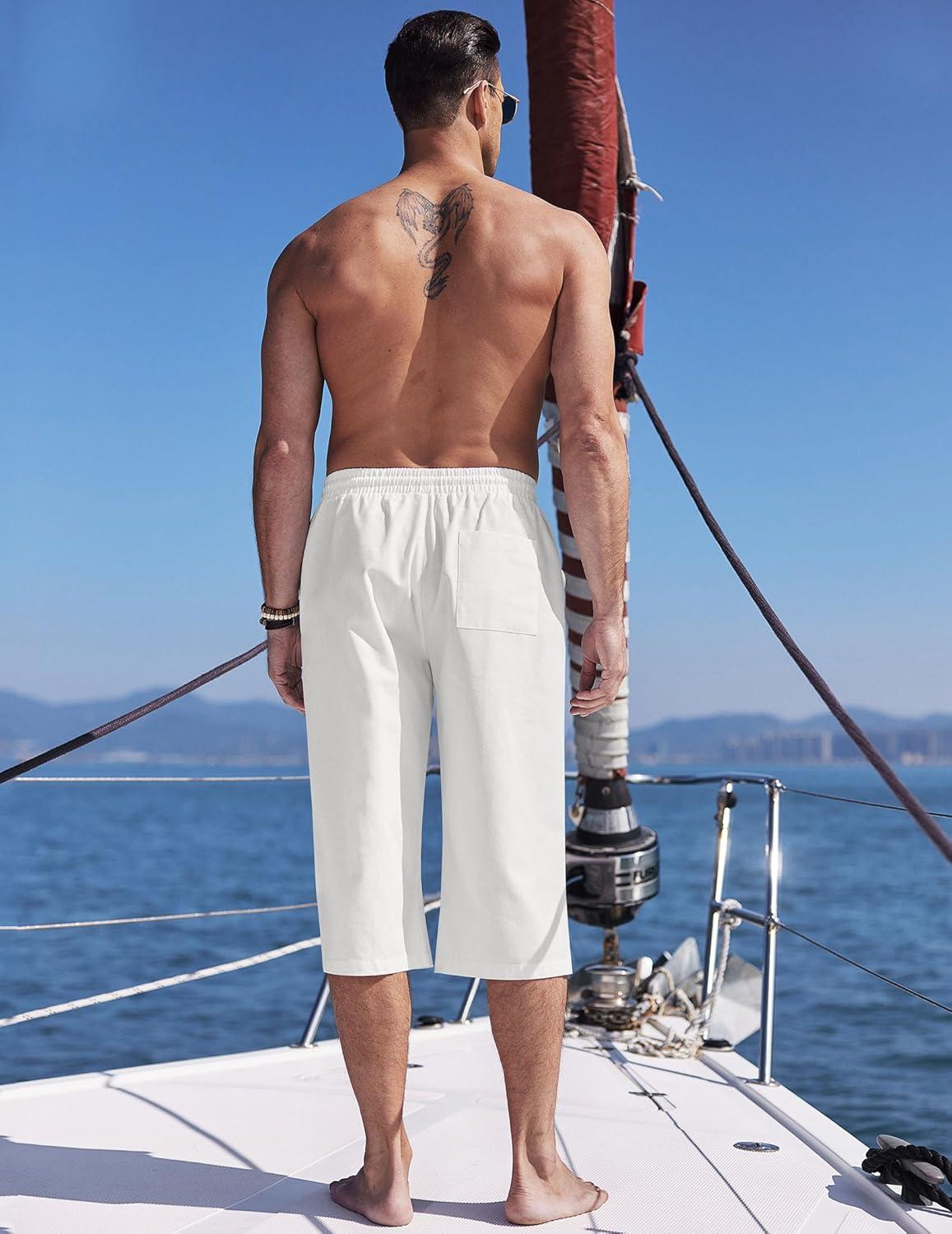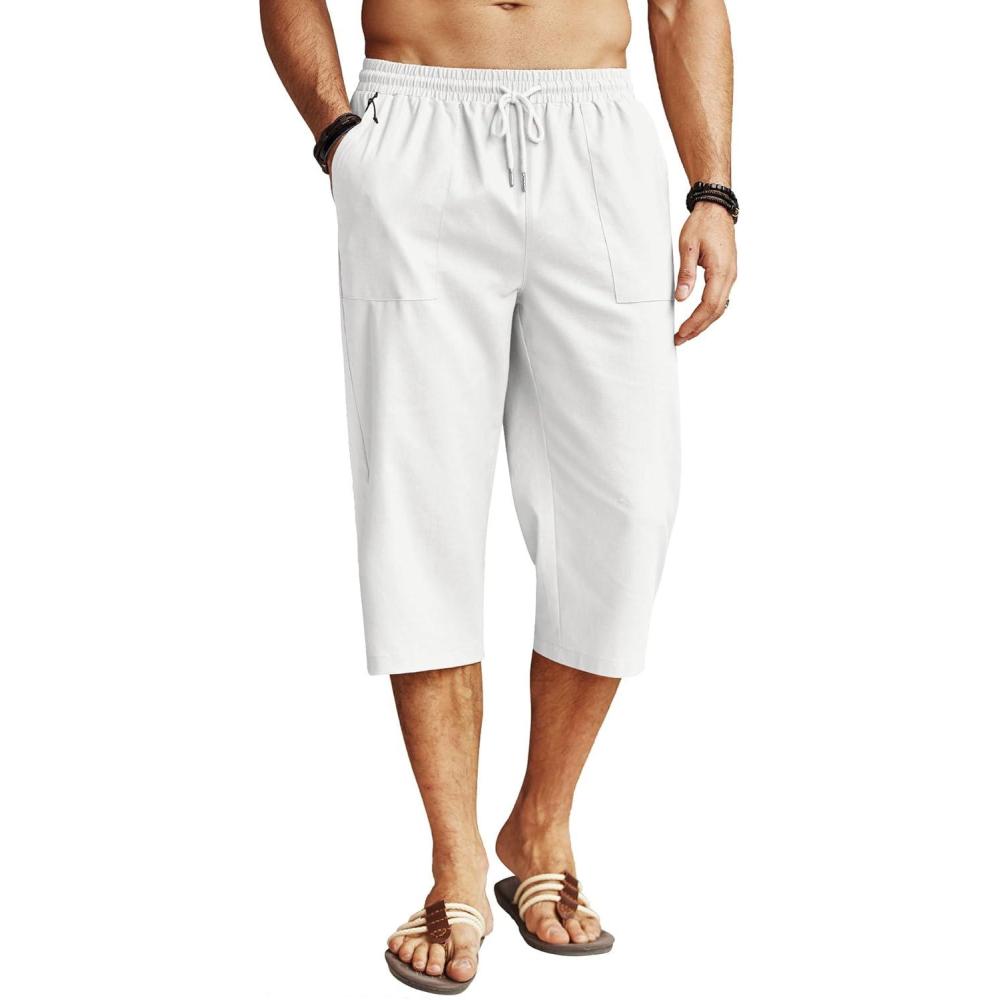 COOFANDY Men’s Linen Capri Pants Casual Lightweight 3/4 Baggy Pants Drawstring Elastic Waist Beach Yoga Pants with Pockets(Pure White)