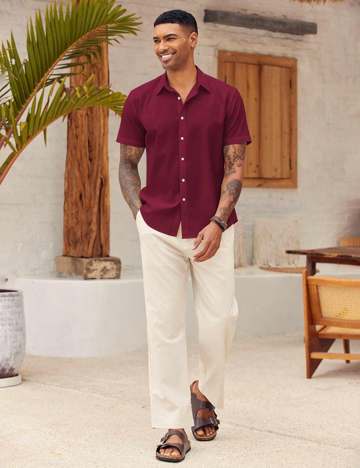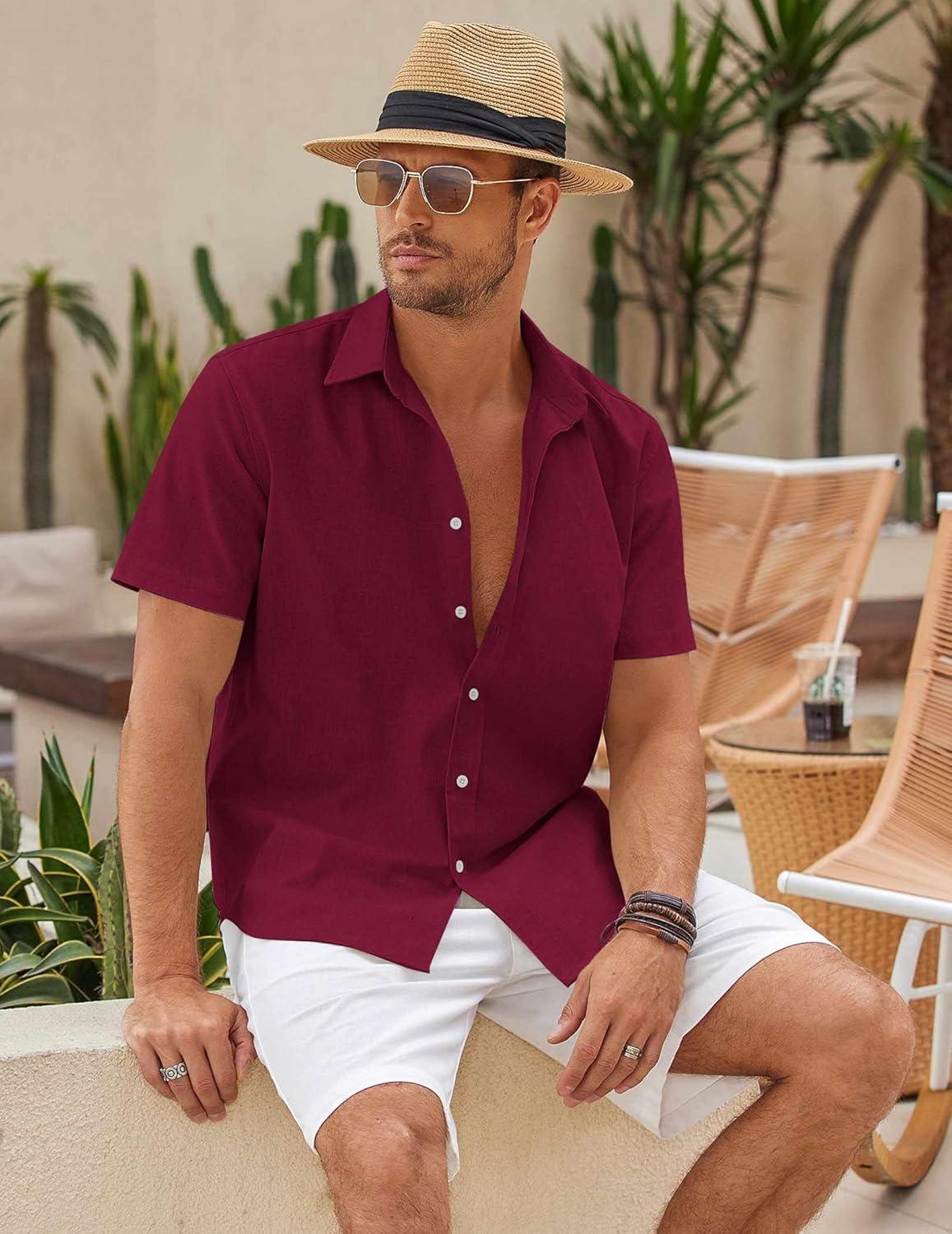 Get the COOFANDY Mens Linen Casual Short Sleeve Shirt Button Down Summer Beach Shirts(Crimson) you want at a price you can afford with our markdown sale.