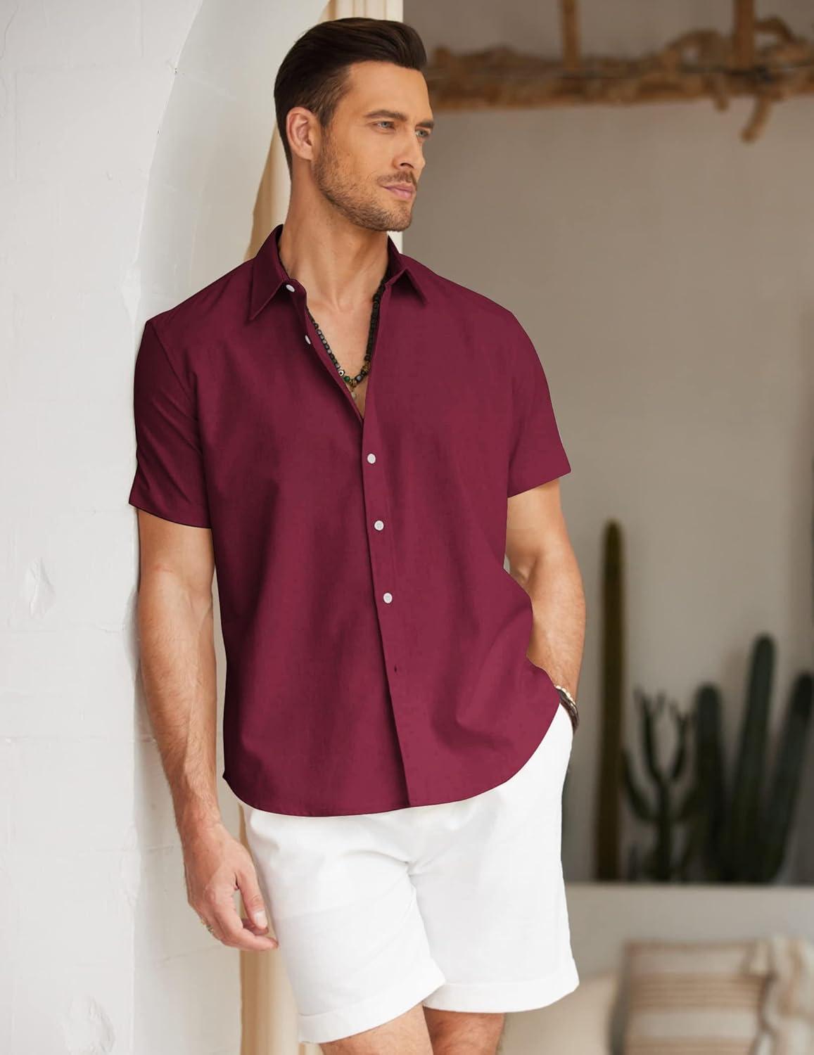 COOFANDY Mens Linen Casual Short Sleeve Shirt Button Down Summer Beach Shirts(Crimson)