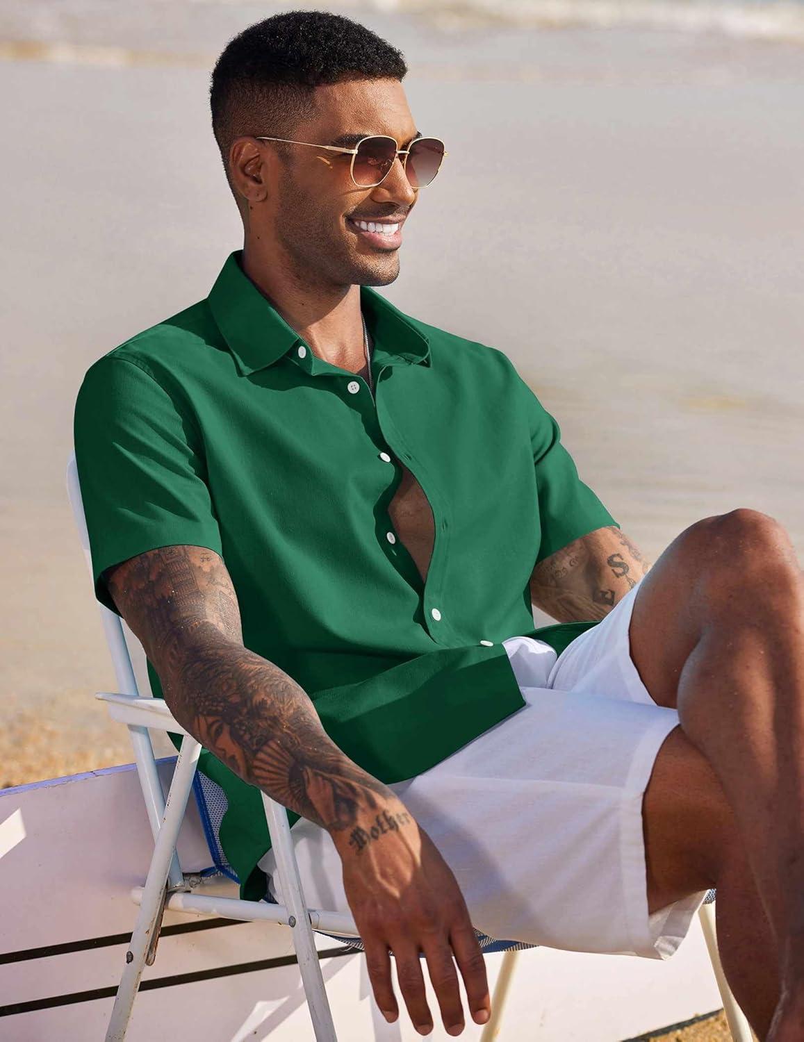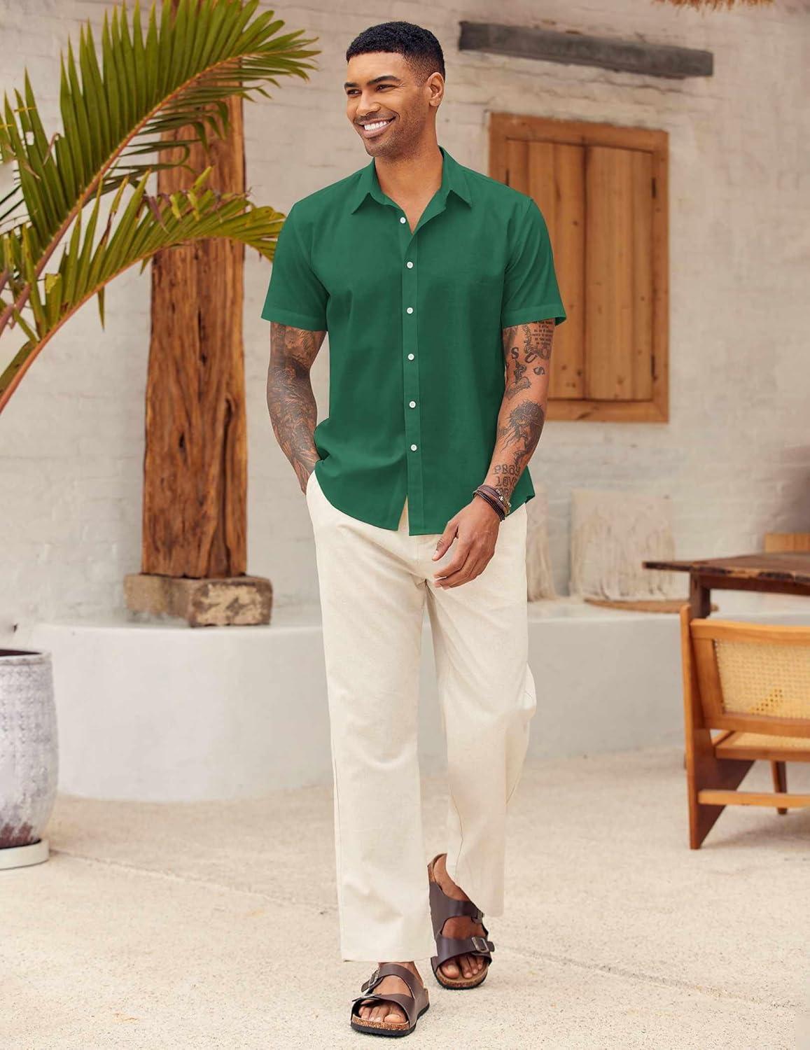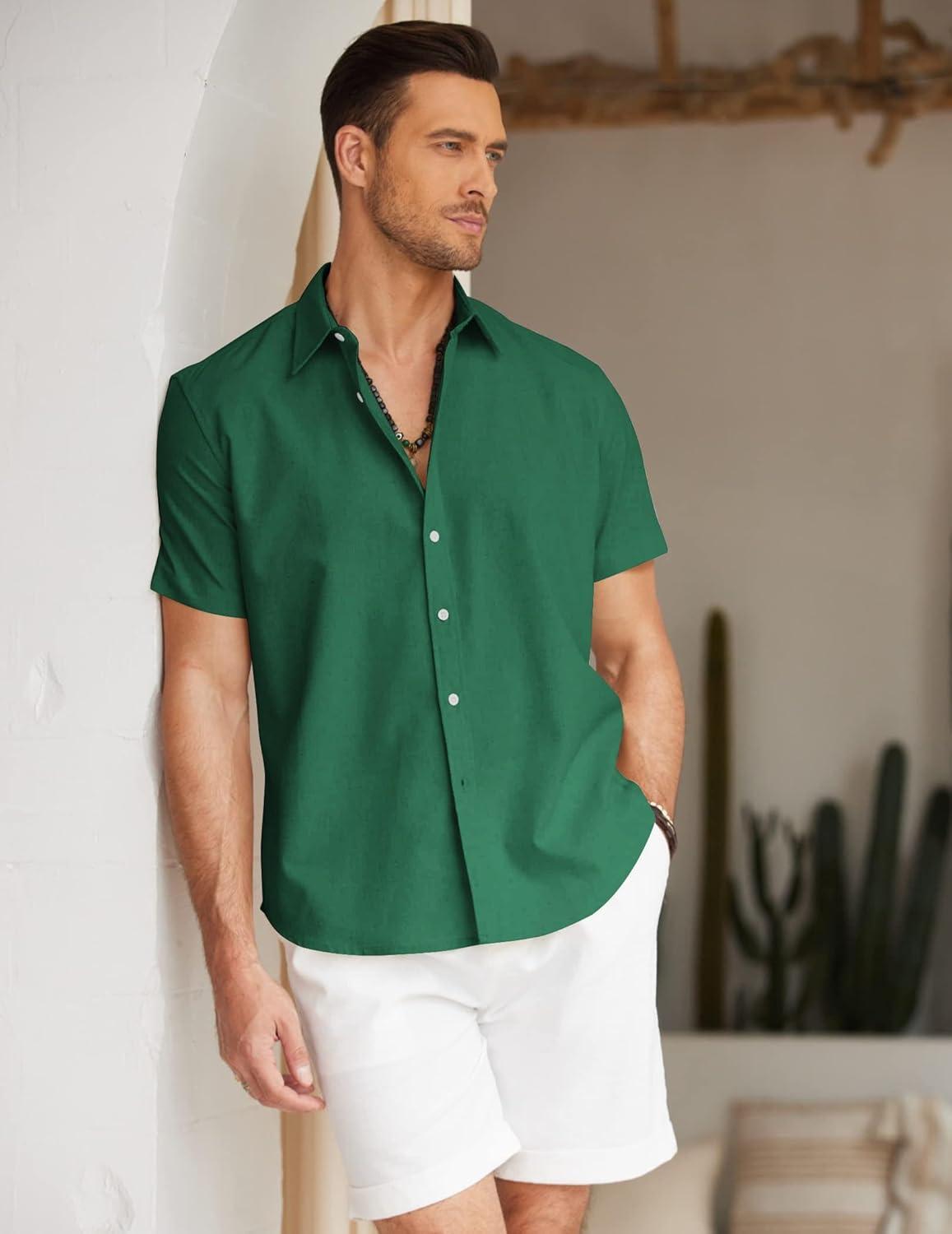 COOFANDY Mens Linen Casual Short Sleeve Shirt Button Down Summer Beach Shirts(Evergreen)