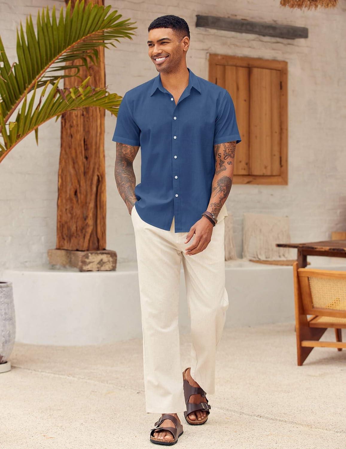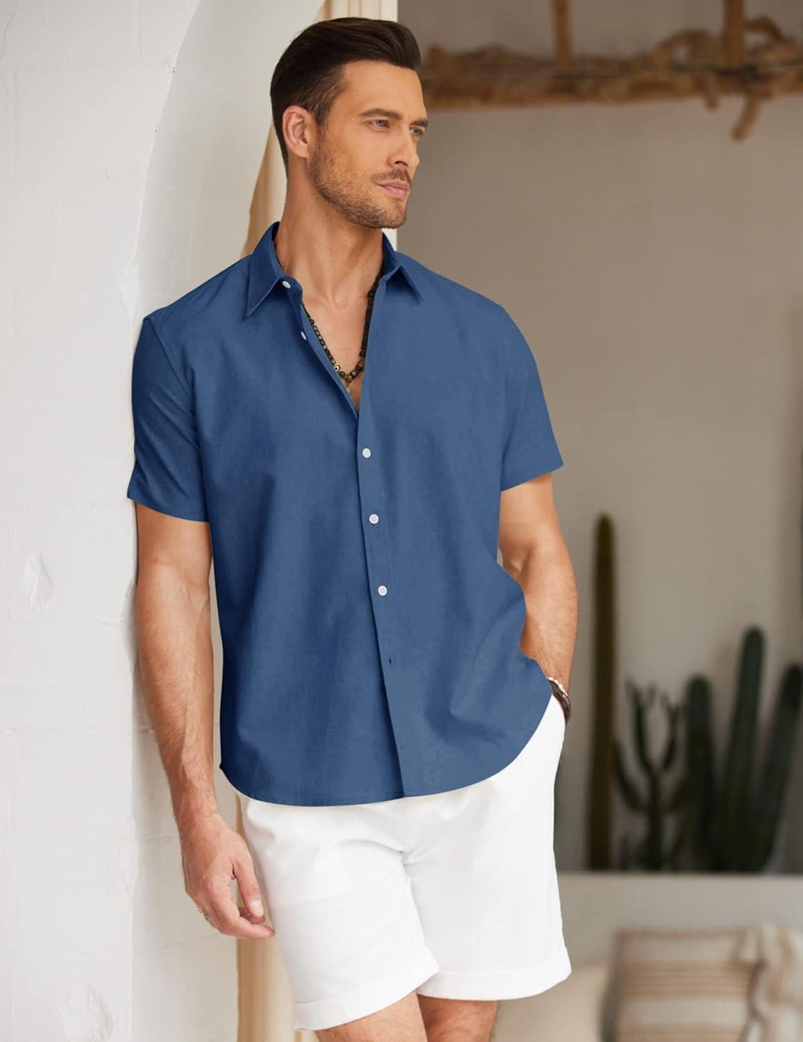 COOFANDY Mens Linen Casual Short Sleeve Shirt Button Down Summer Beach Shirts(Galaxy Blue)