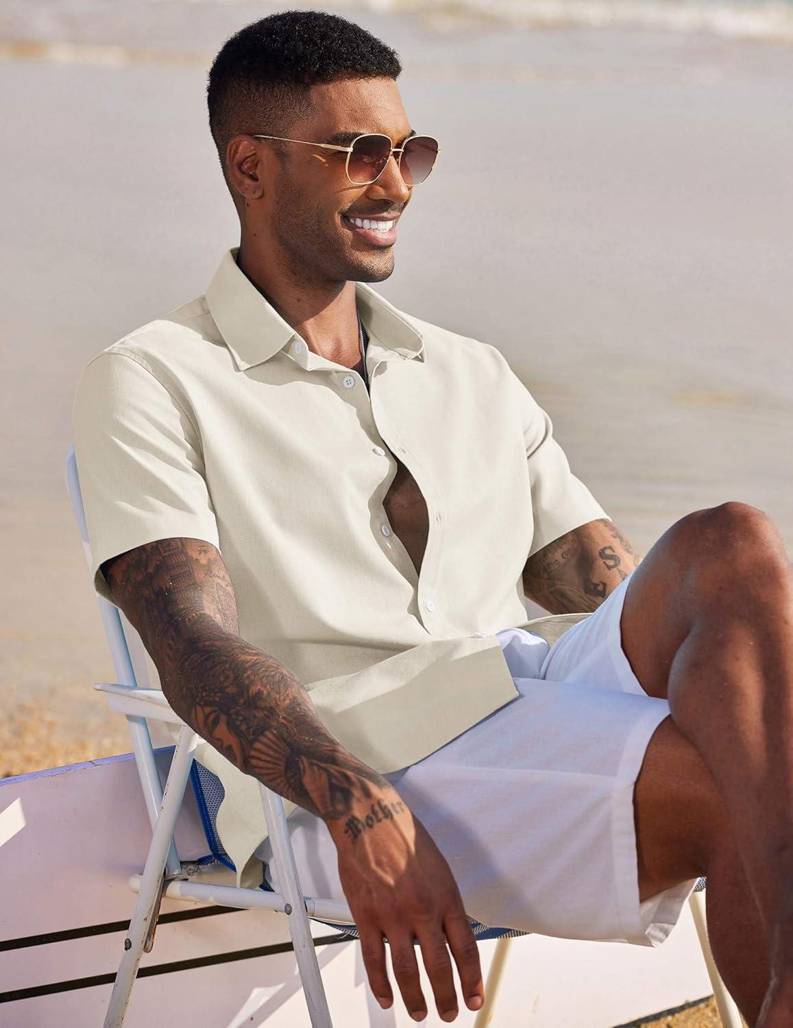 imageCOOFANDY Mens Linen Casual Short Sleeve Shirt Button Down Summer Beach ShirtsWhite