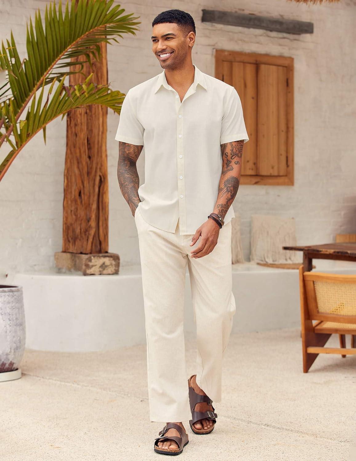 COOFANDY Mens Linen Casual Short Sleeve Shirt Button Down Summer Beach Shirts(White)