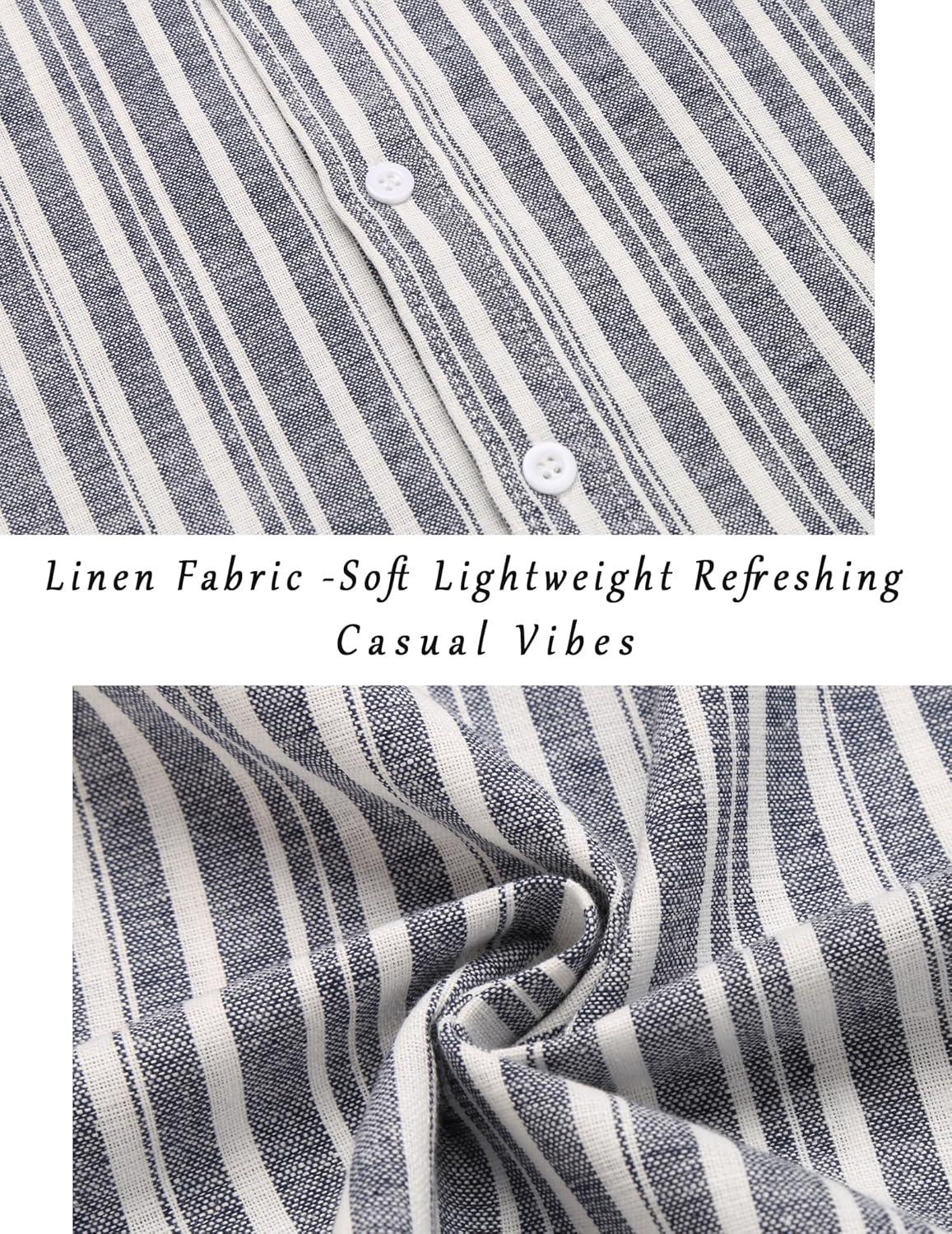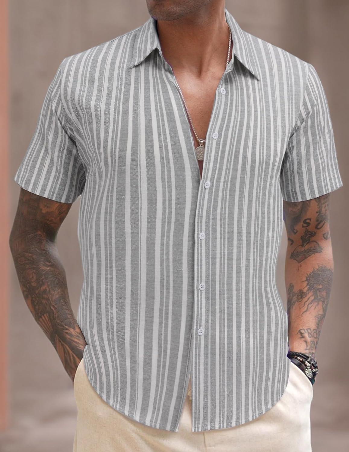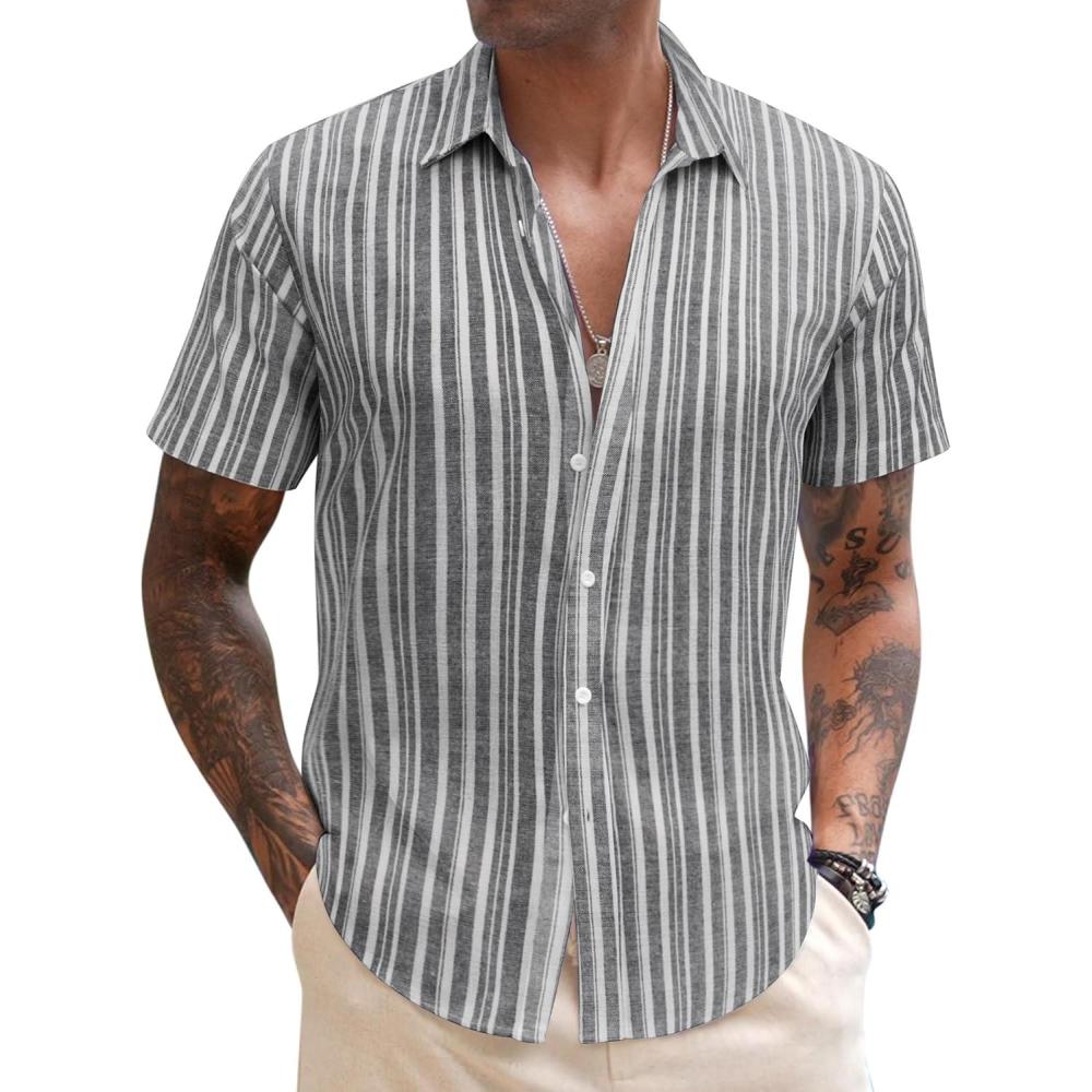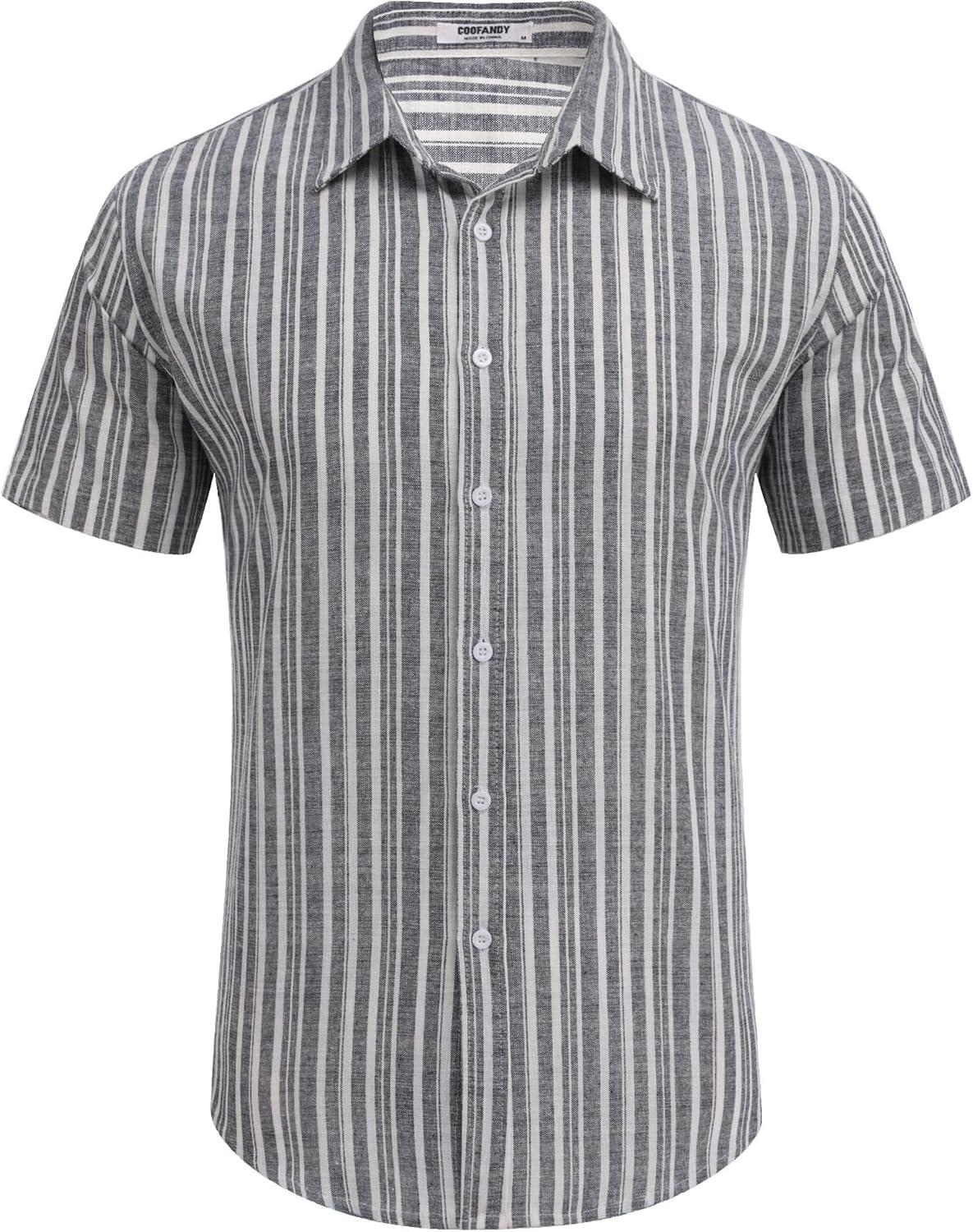 COOFANDY Mens Linen Casual Short Sleeve Shirt Button Down Summer Beach Shirts(Stripe-irregular Grey)