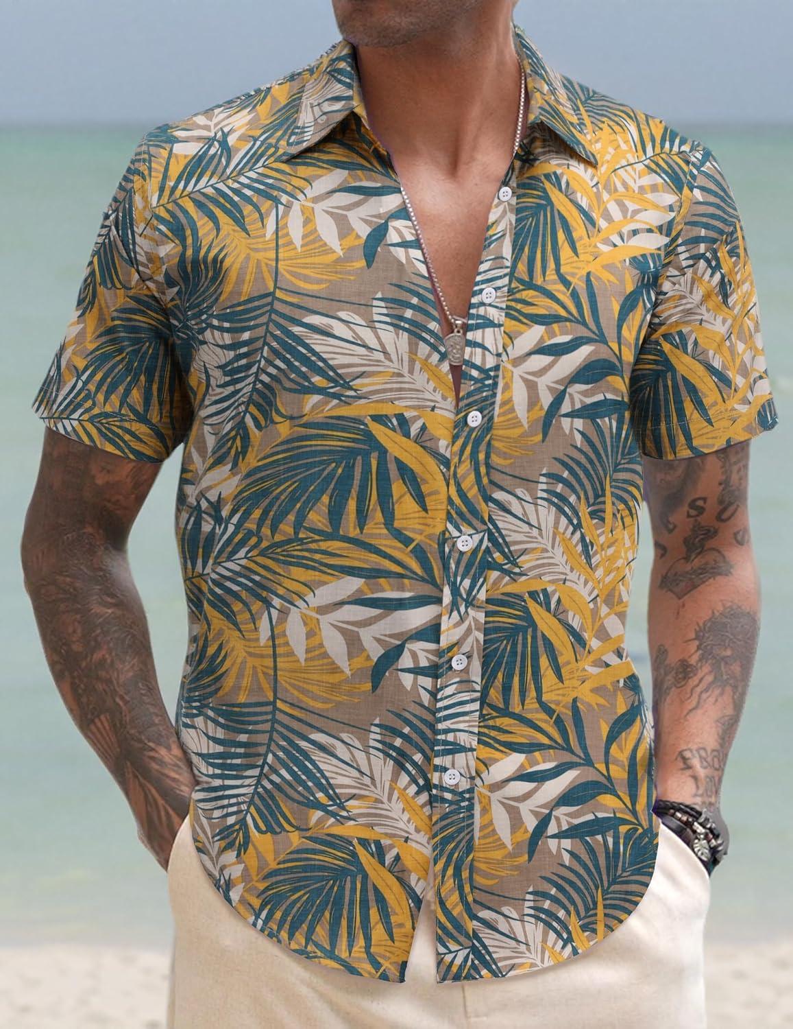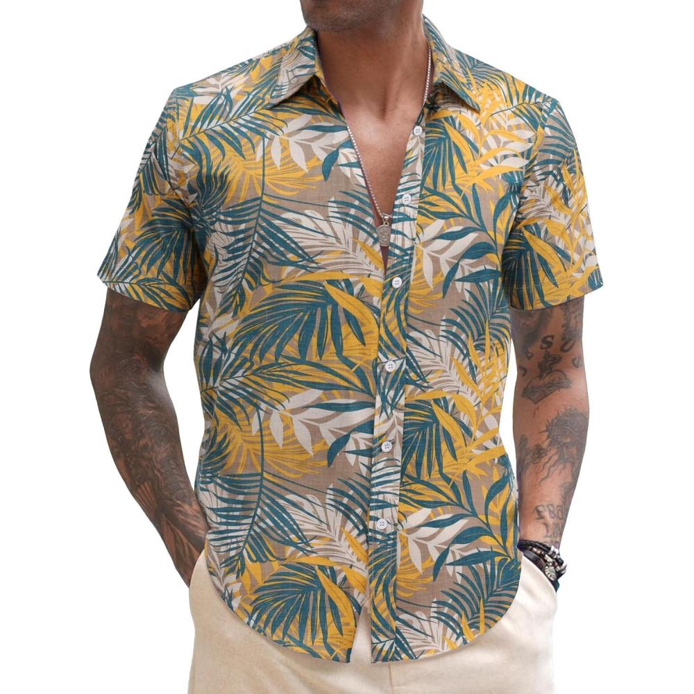 COOFANDY Mens Linen Casual Short Sleeve Shirt Button Down Summer Beach Shirts(Z-leaves-khaki)