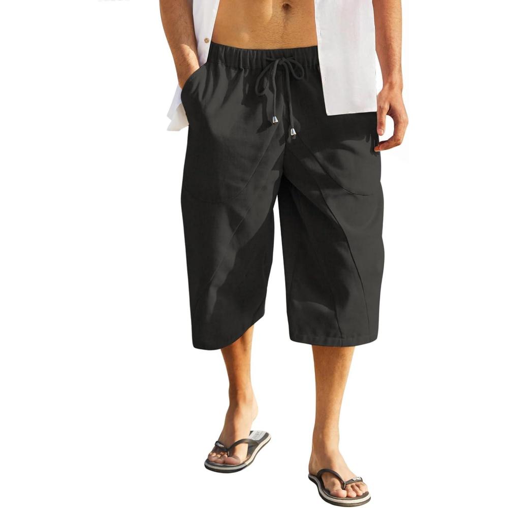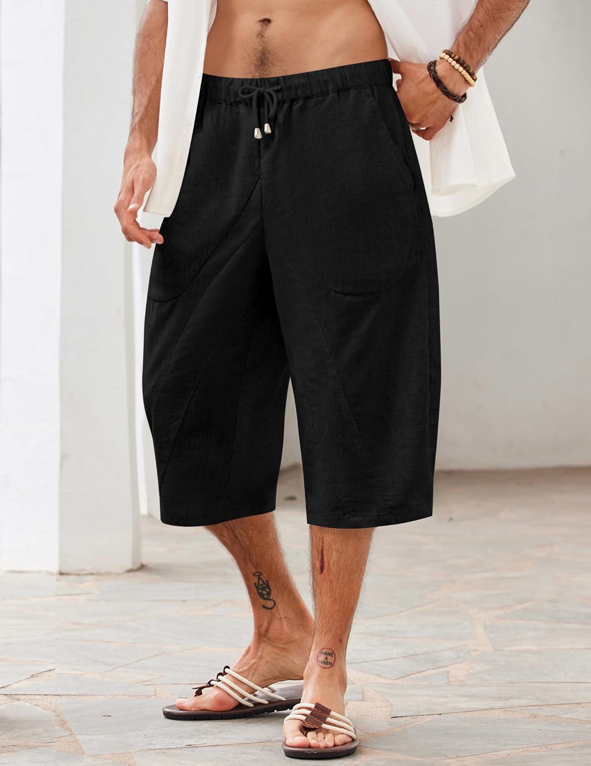 COOFANDY Men’s Linen Harem Capri Pants Casual Lightweight Drawstring Yoga Pants Baggy 3/4 Beach Trousers(Black)