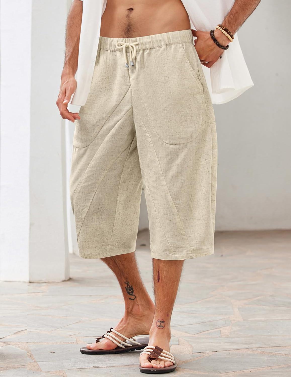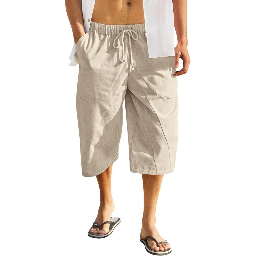 COOFANDY Men’s Linen Harem Capri Pants Casual Lightweight Drawstring Yoga Pants Baggy 3/4 Beach Trousers(Khaki)