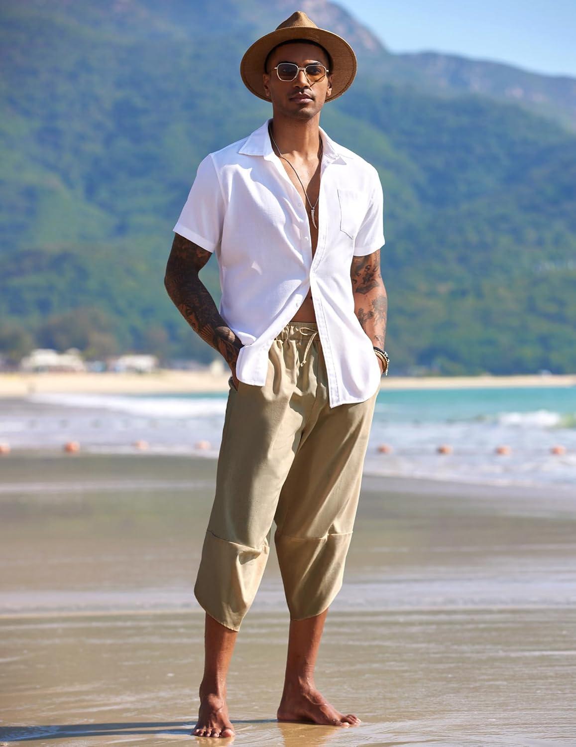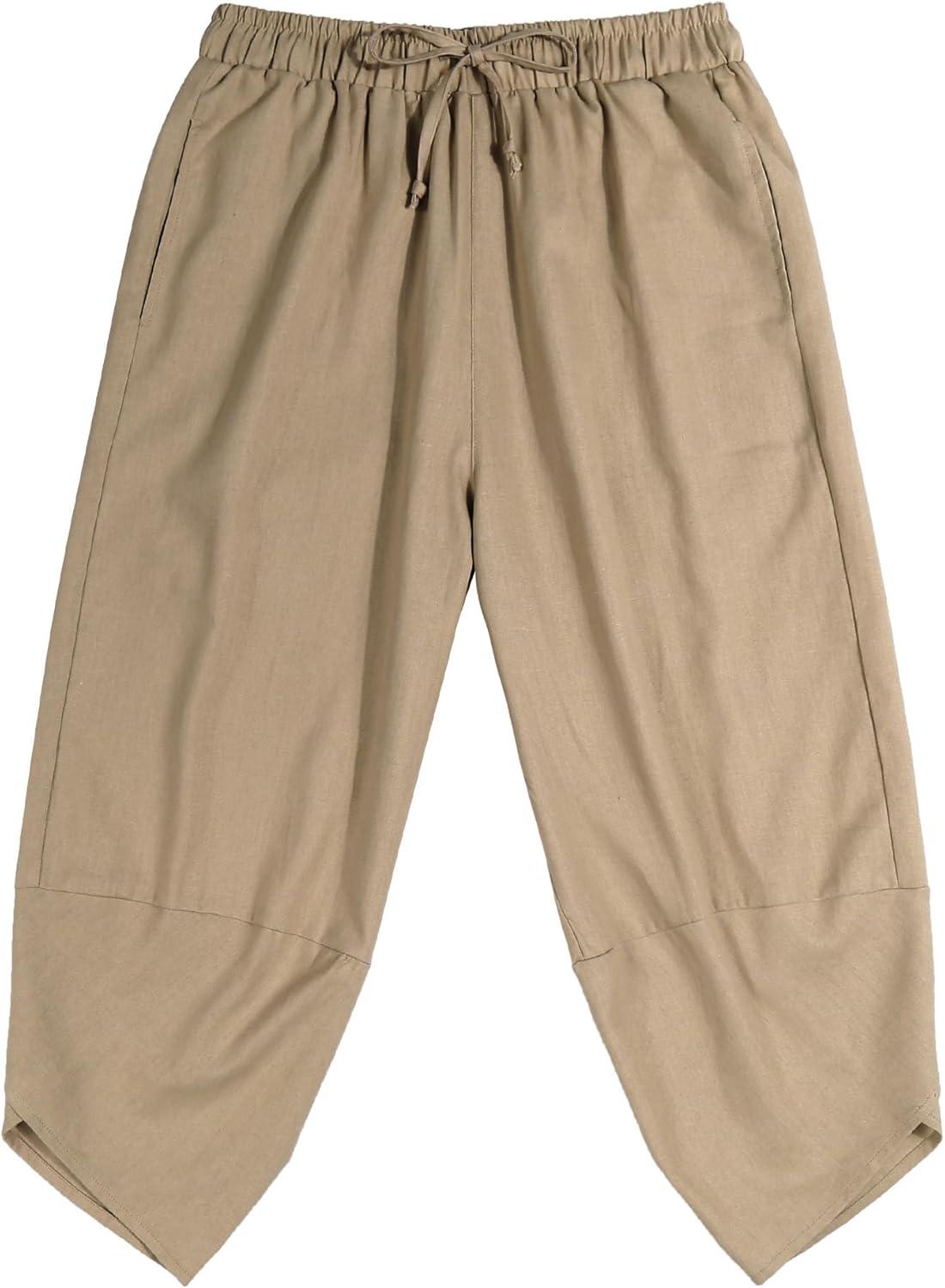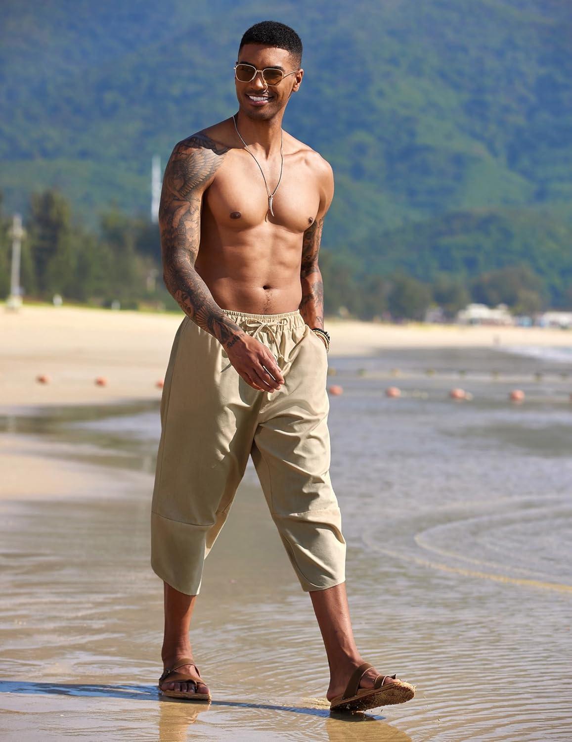COOFANDY Men's Linen Harem Capri Pants Lightweight Loose 3/4 Shorts Drawstring Elastic Waist Casual Beach Boho Yoga Trousers(Light Brown)