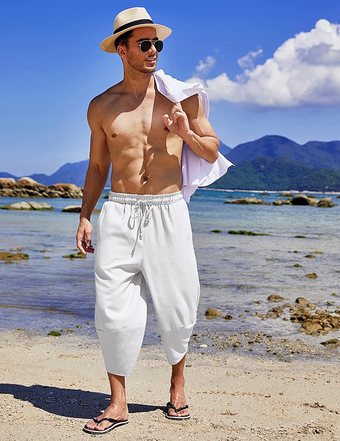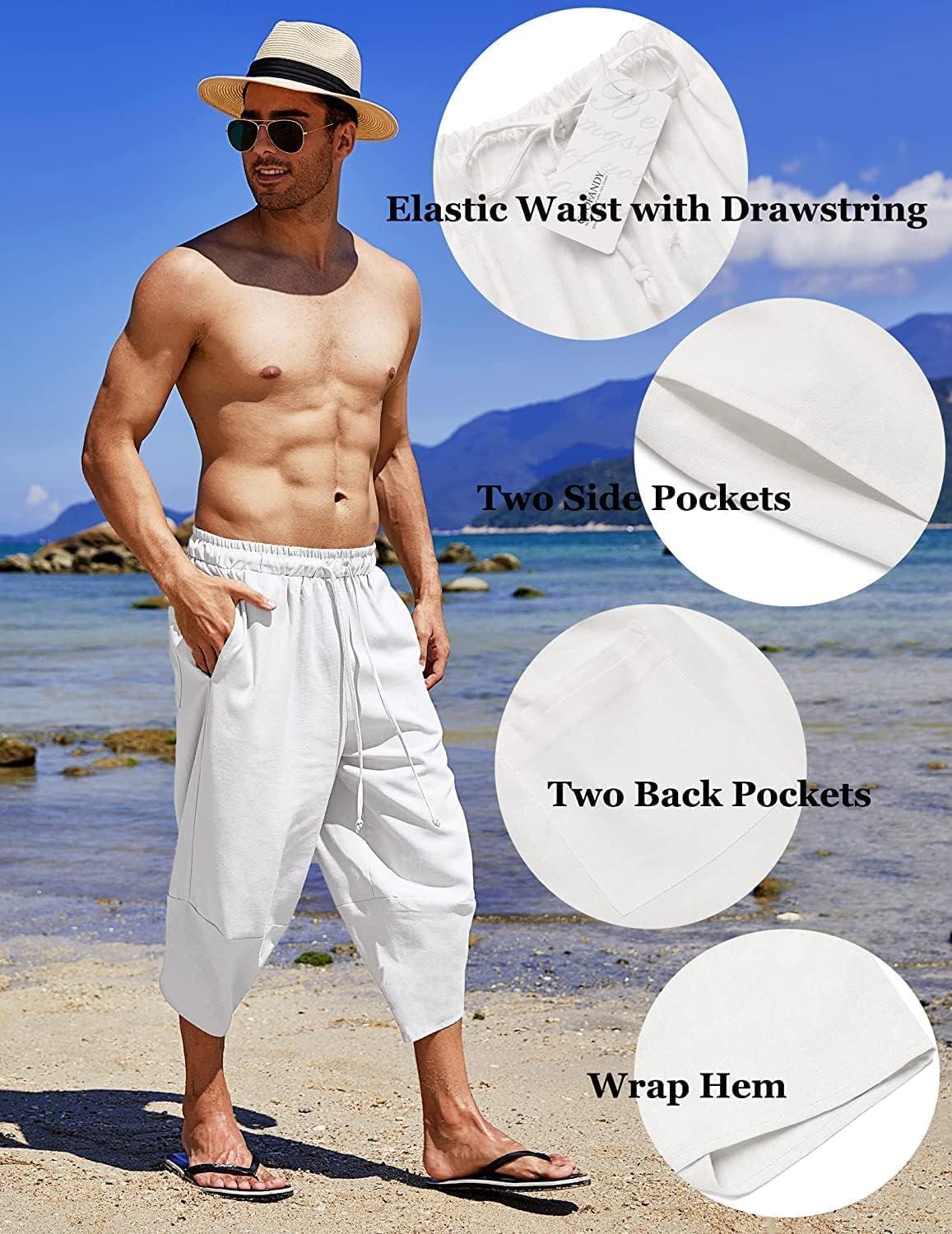 COOFANDY Men's Linen Harem Capri Pants Lightweight Loose 3/4 Shorts Drawstring Elastic Waist Casual Beach Boho Yoga Trousers(White)